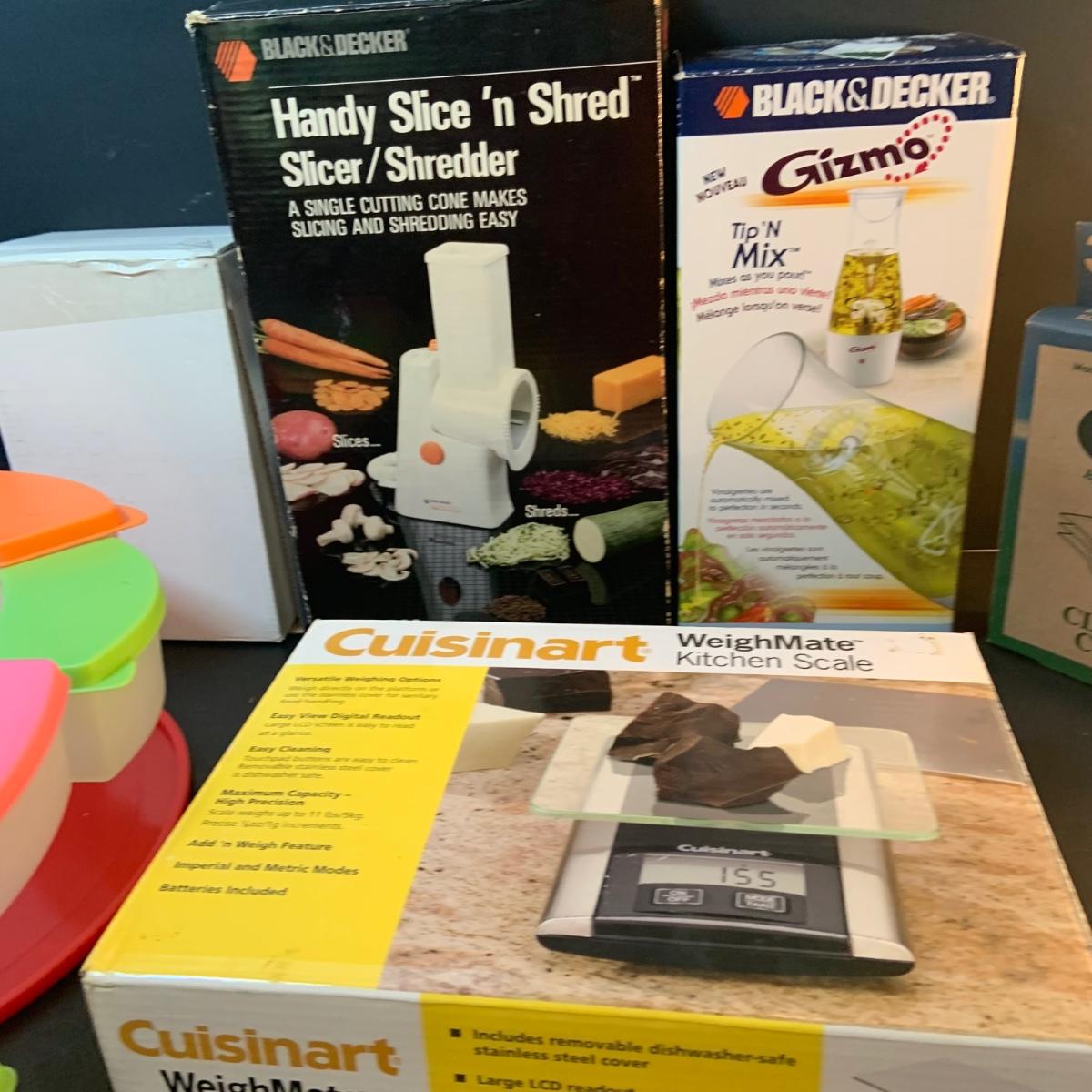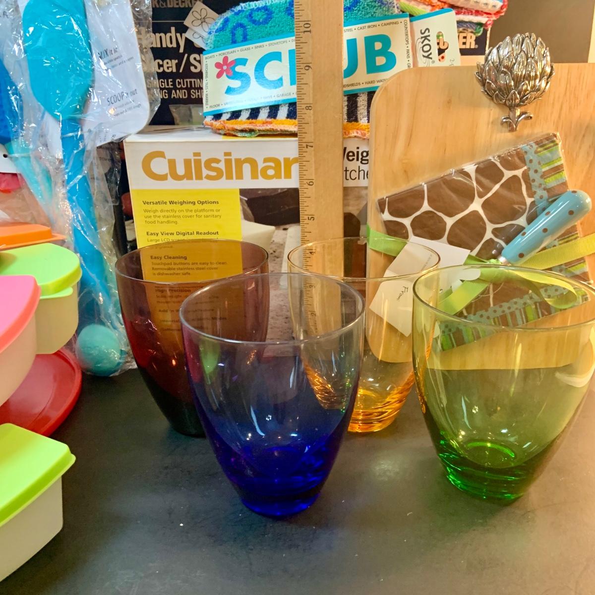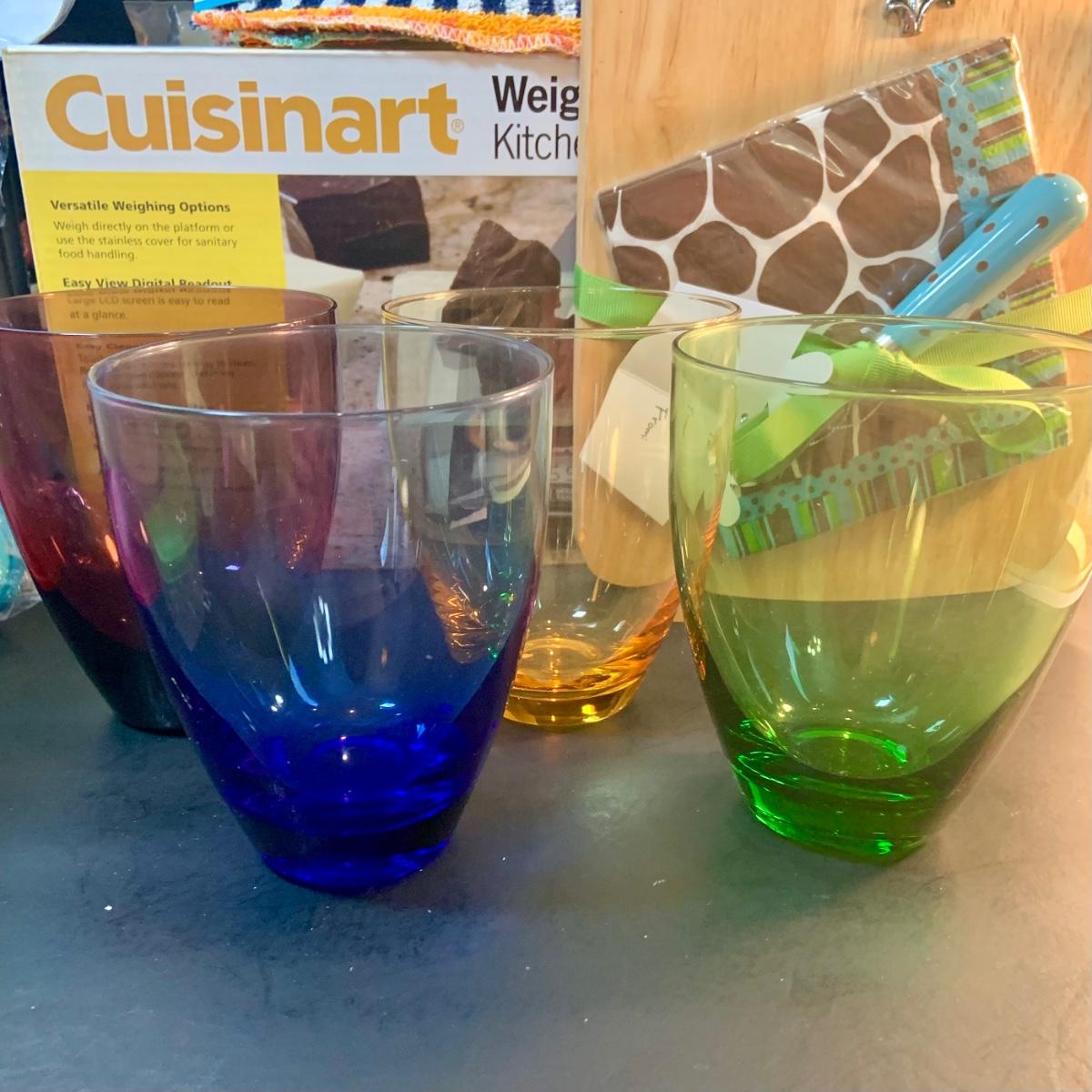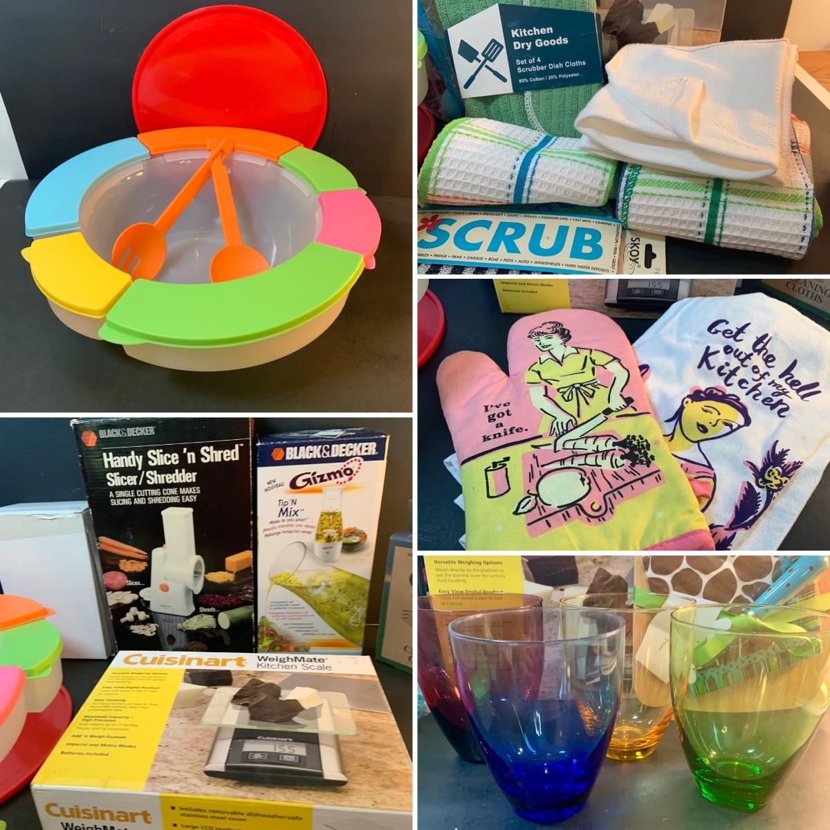 LOT:76: Colorful Kitchen Collection Featuring Vintage Avon Salad Server/Storer, Colored Glasses, Black & Decker Slicer/Shredder, Gizmo Mixer, Cuisinart Scale, Kitchen Towels and More