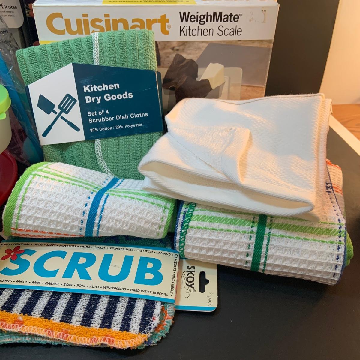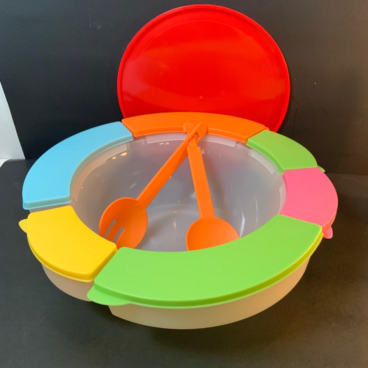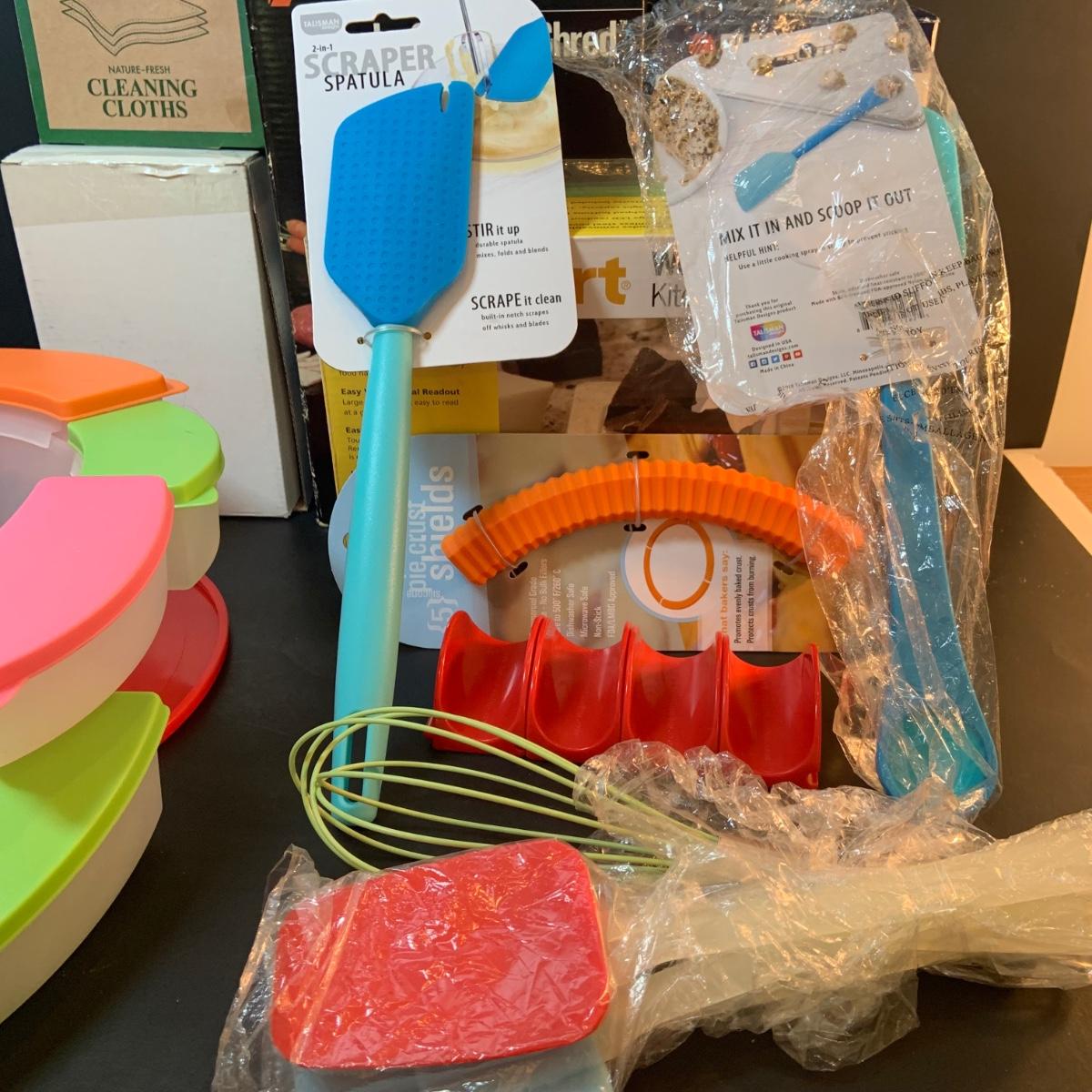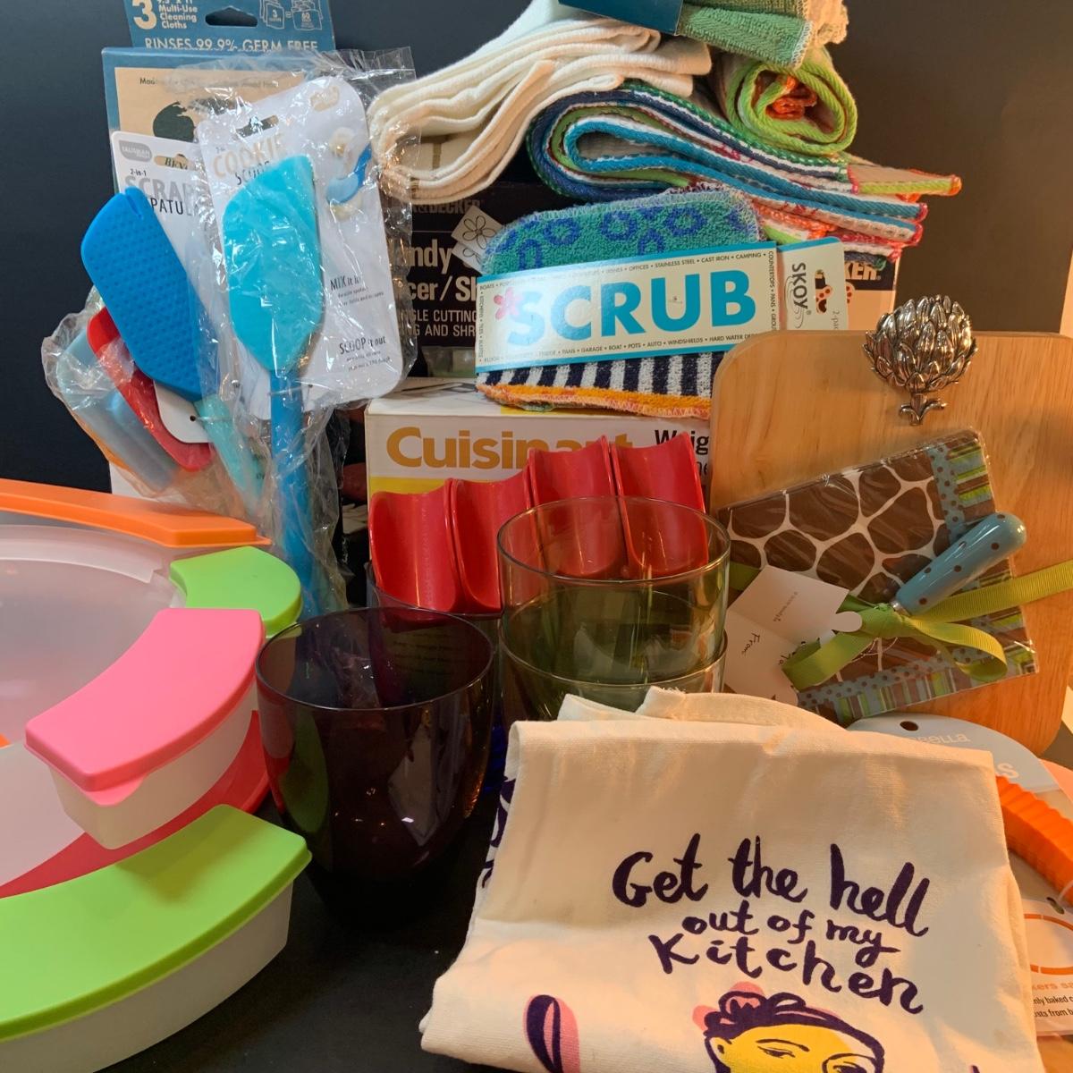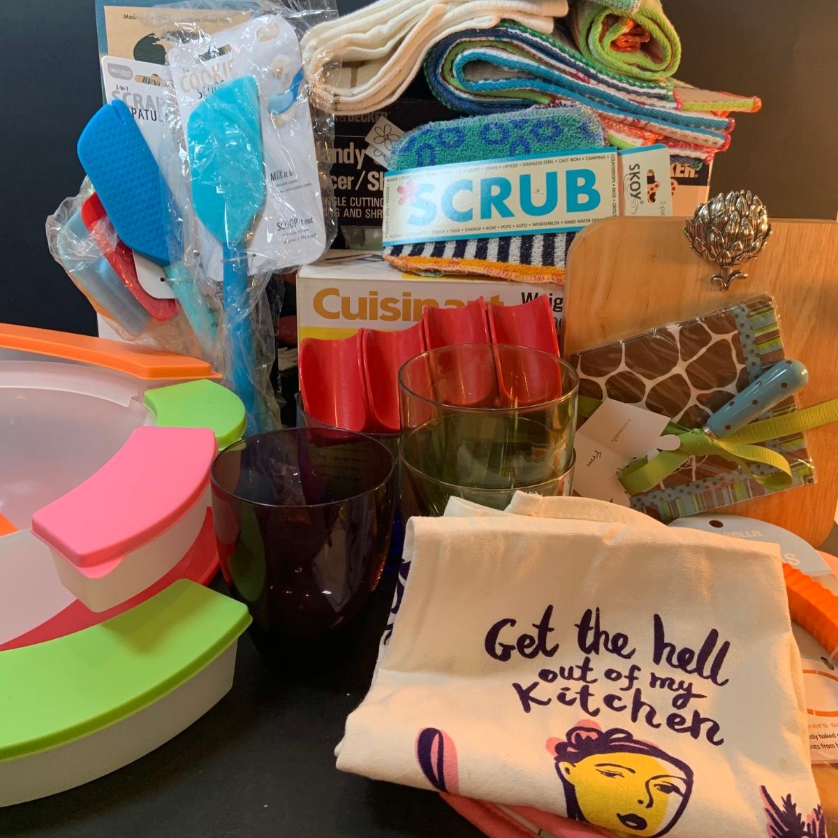 LOT:76: Colorful Kitchen Collection Featuring Vintage Avon Salad Server/Storer, Colored Glasses, Black & Decker Slicer/Shredder, Gizmo Mixer, Cuisinart Scale, Kitchen Towels and More