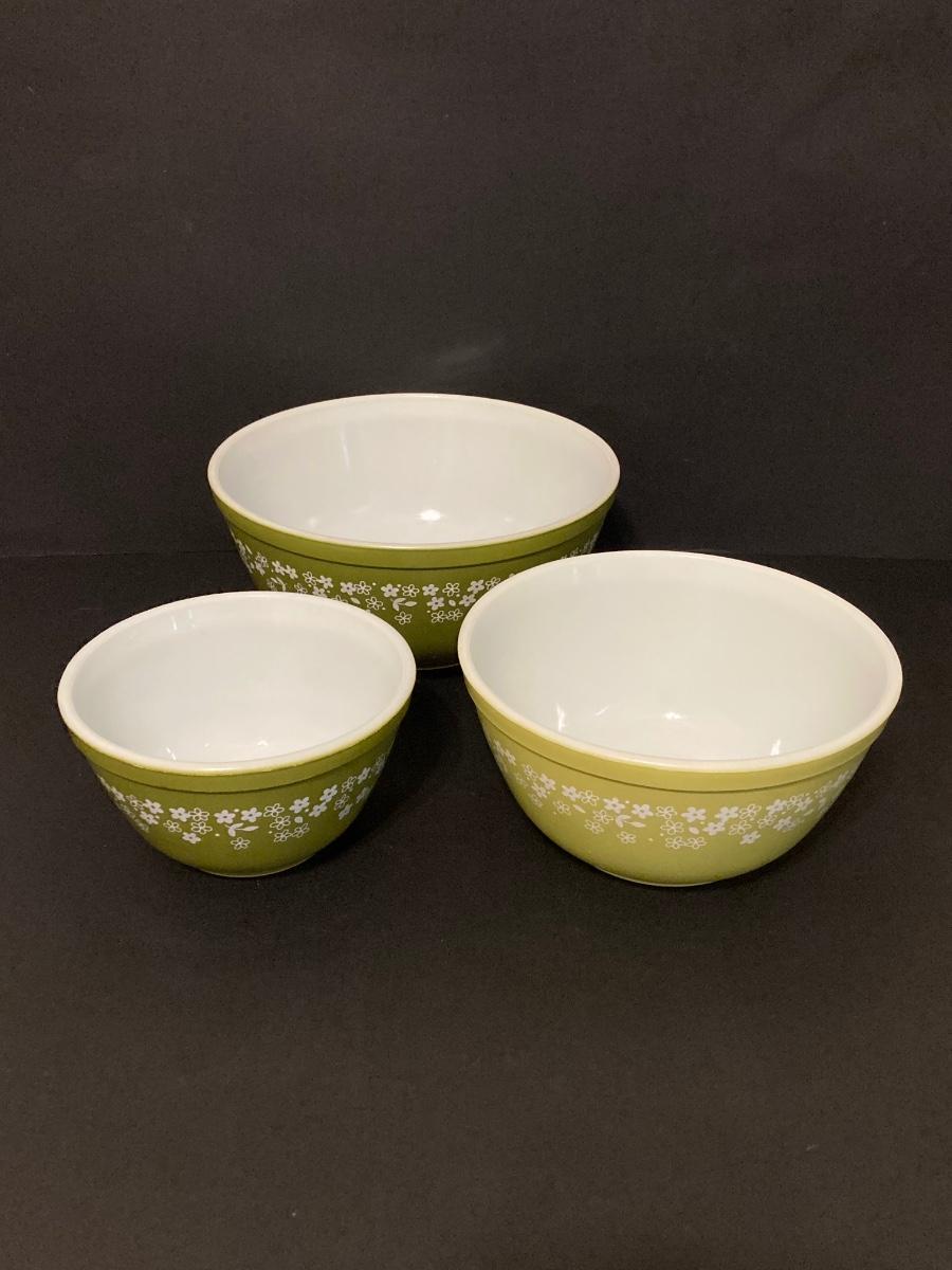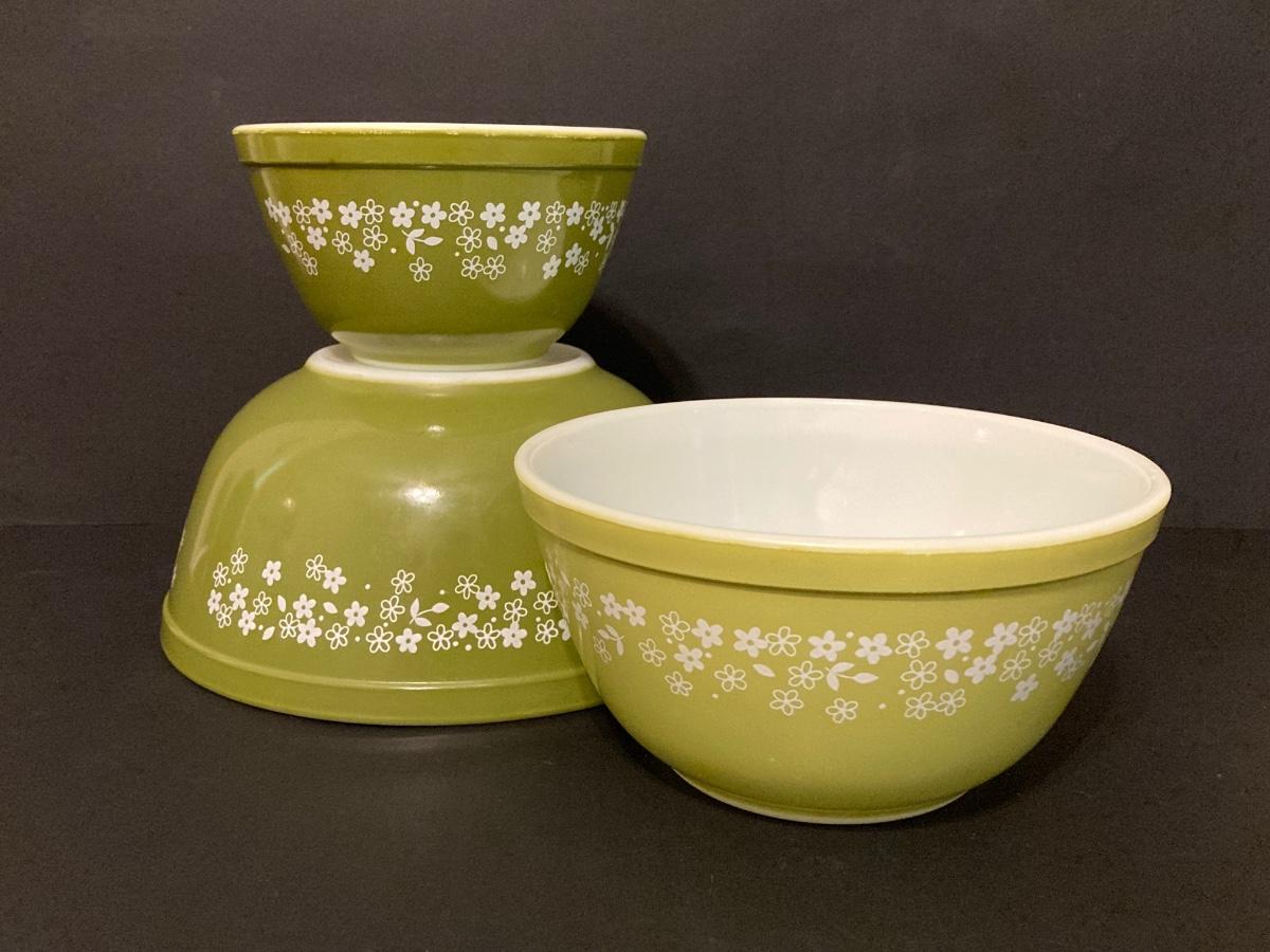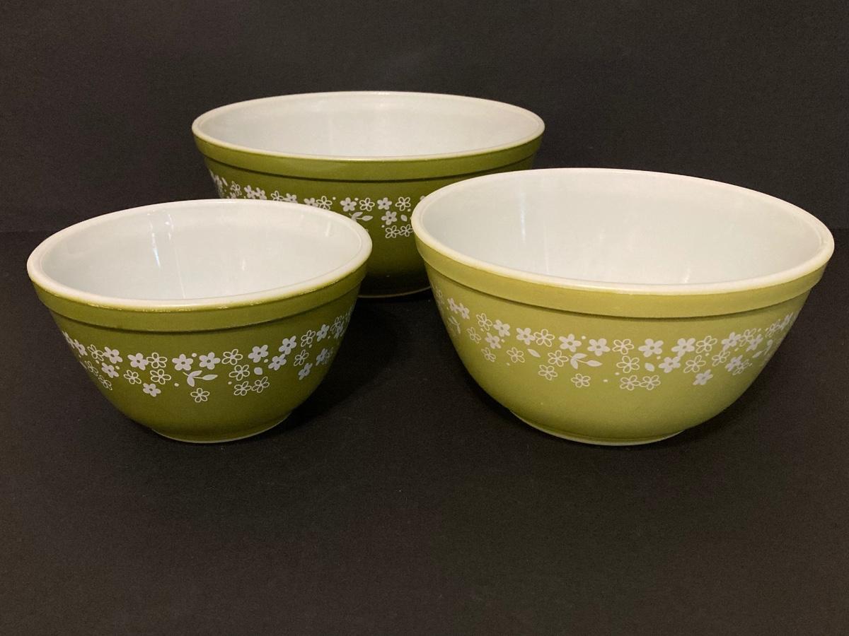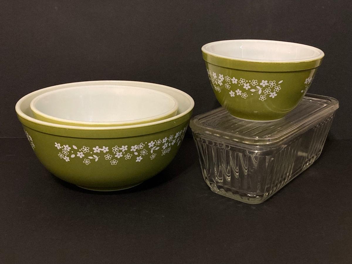 LOT 108: Pyrex Spring Blossom Three Mixing Bowl Set and Anchor Hocking Ribbed Glass Refrigerator Dish with Lid