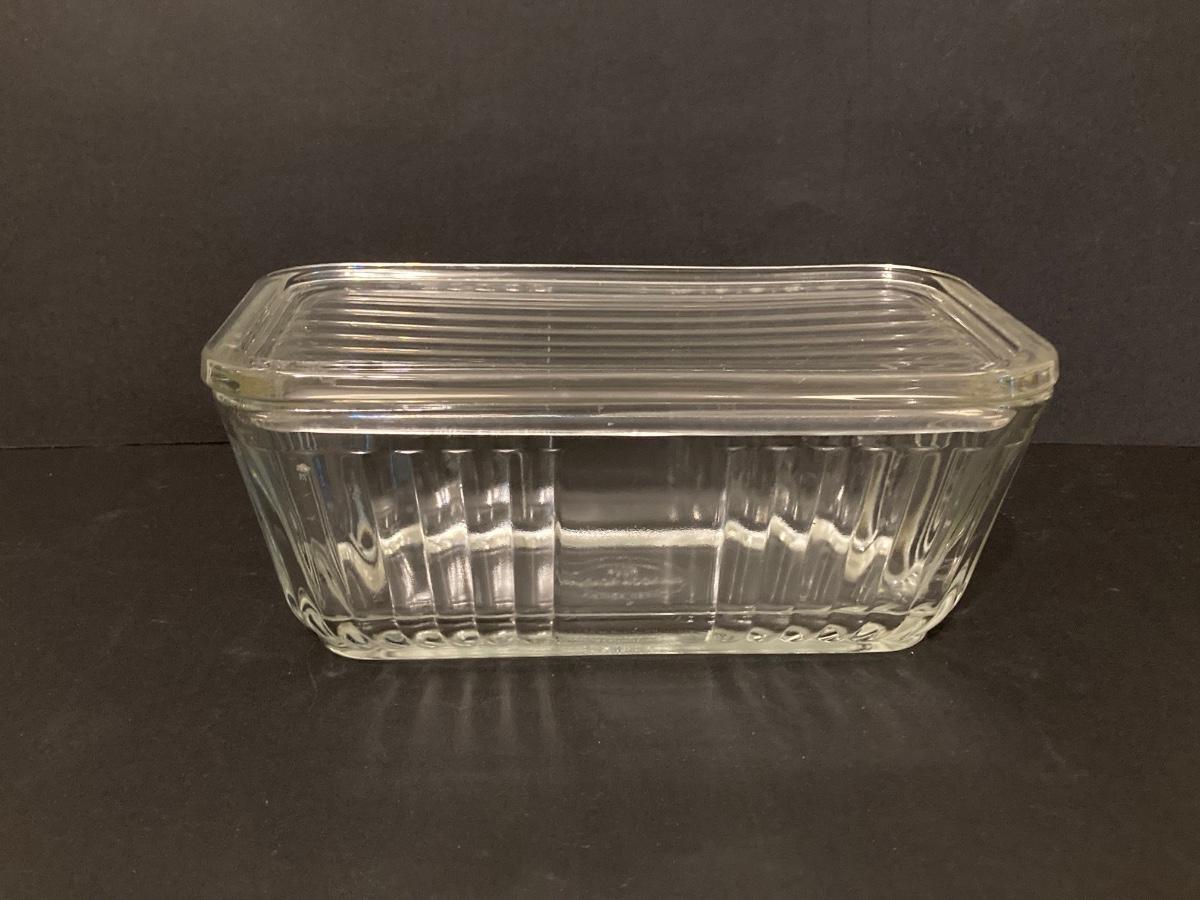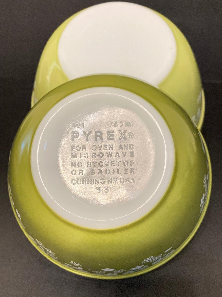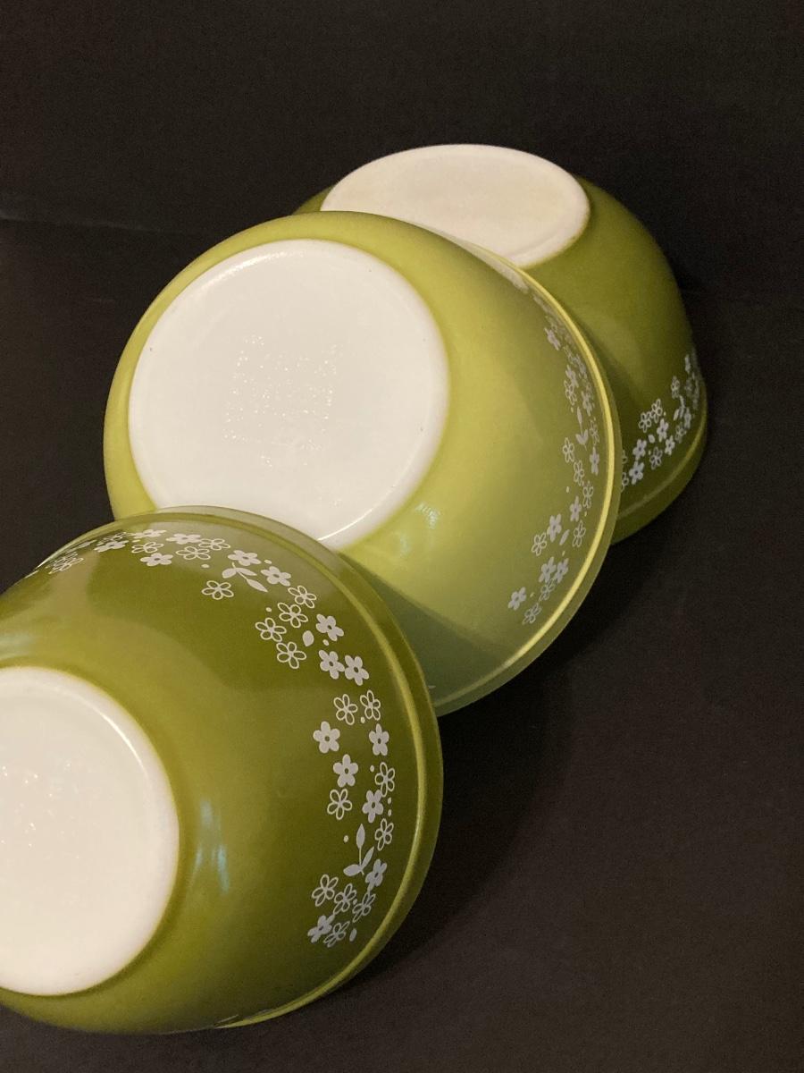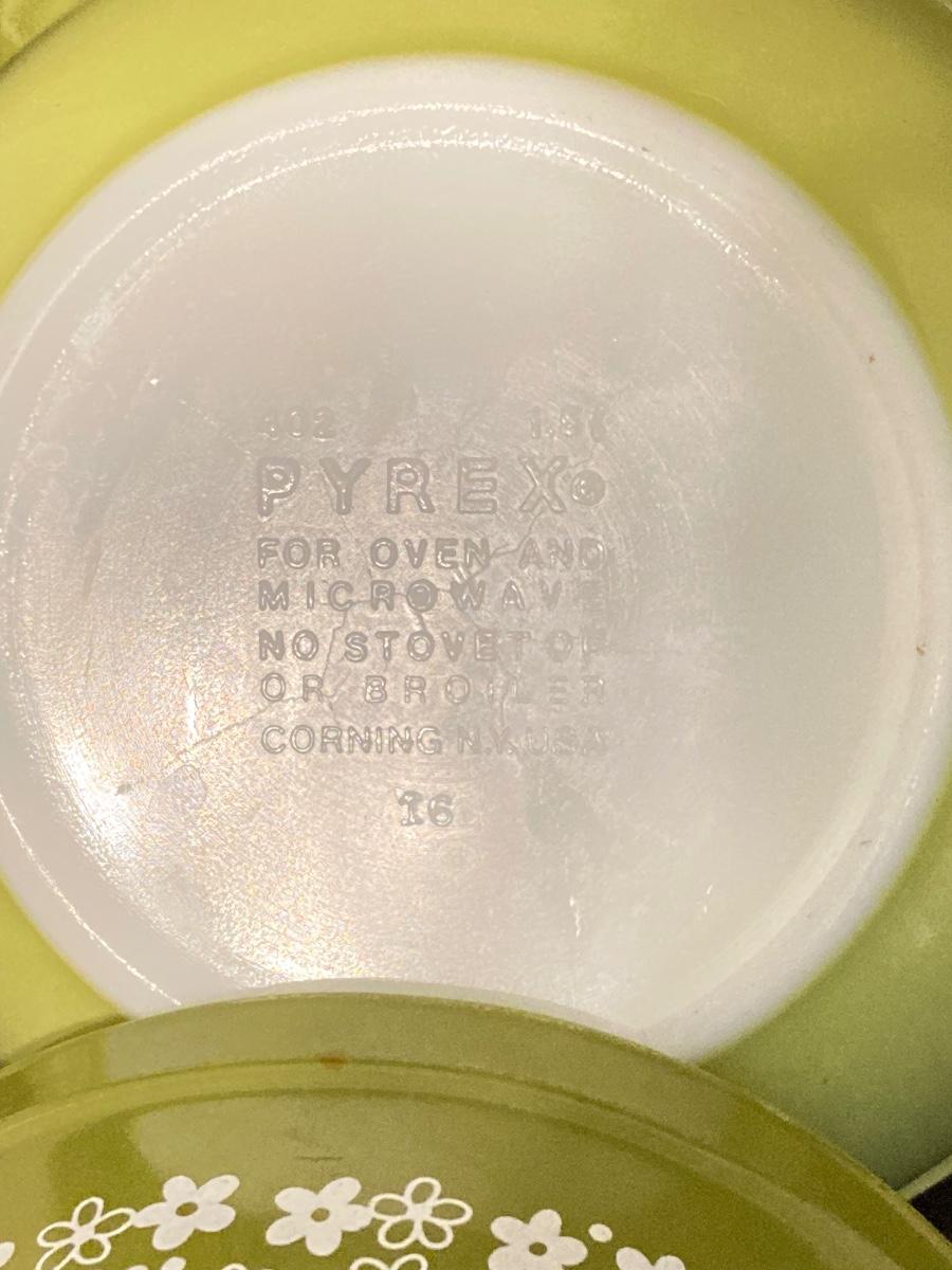 LOT 108: Pyrex Spring Blossom Three Mixing Bowl Set and Anchor Hocking Ribbed Glass Refrigerator Dish with Lid
