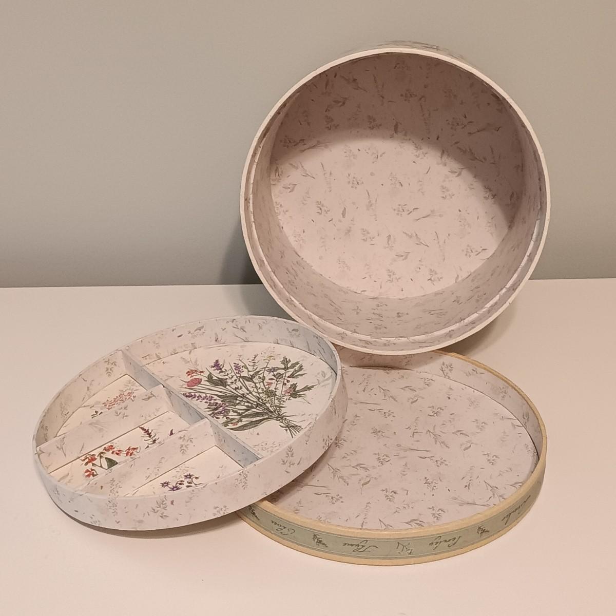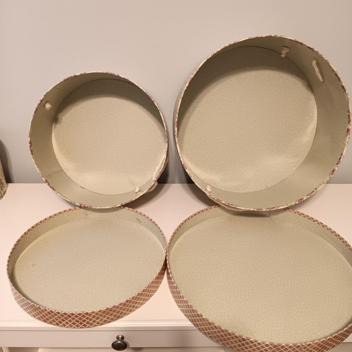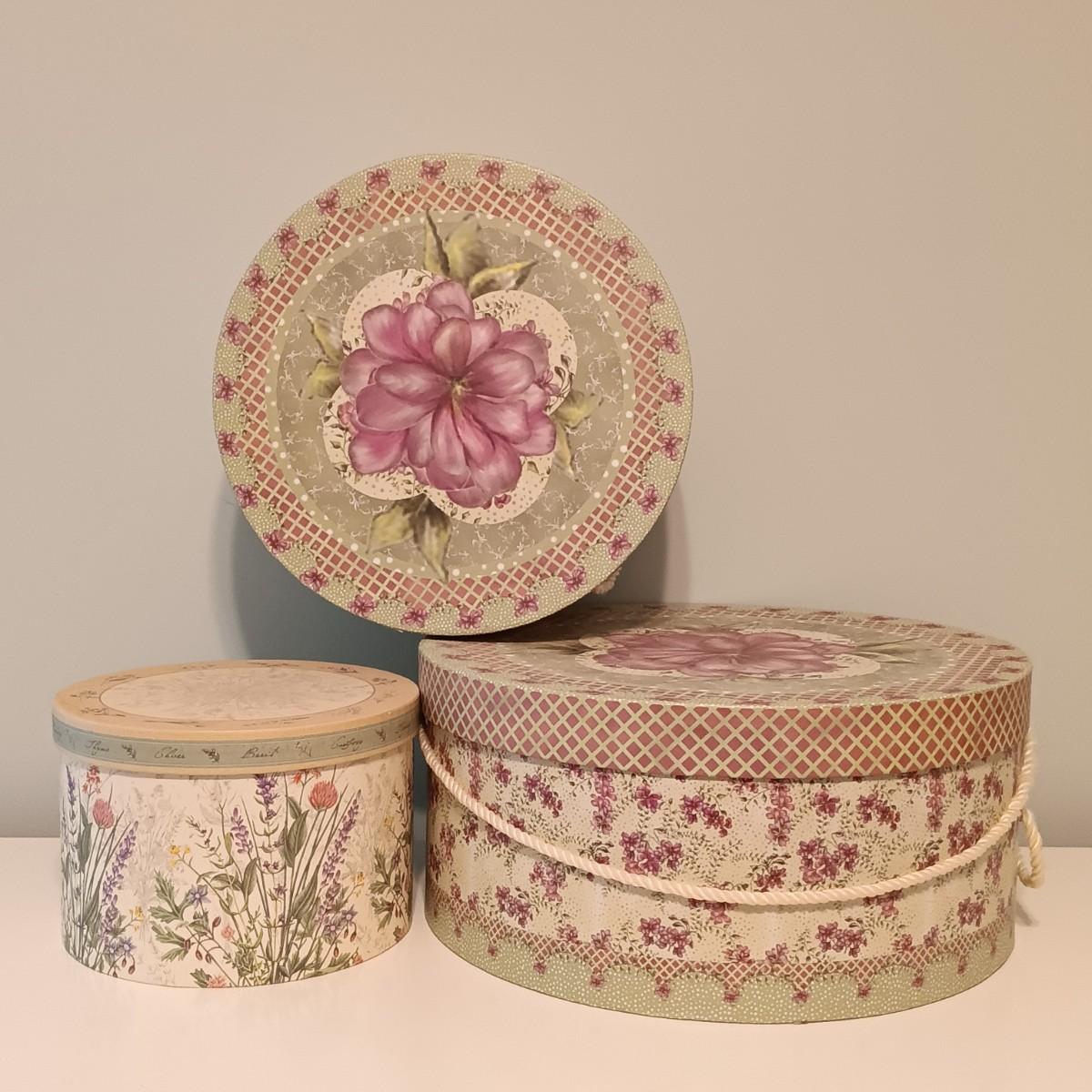 Hat boxes from largest to smallest are: 16", 13" and 9.5" in diameter.
