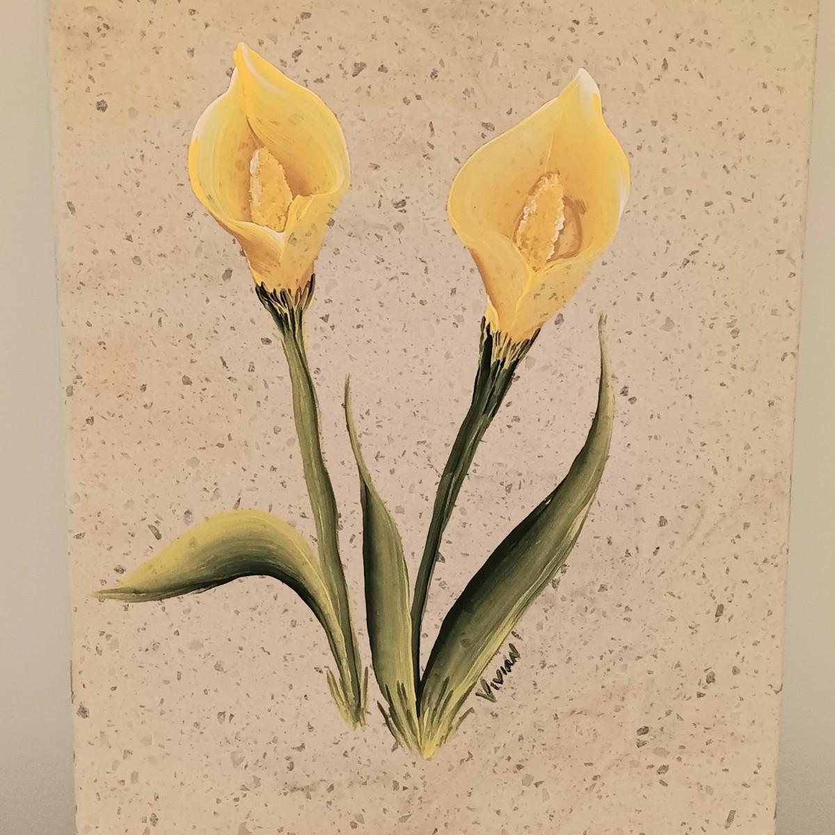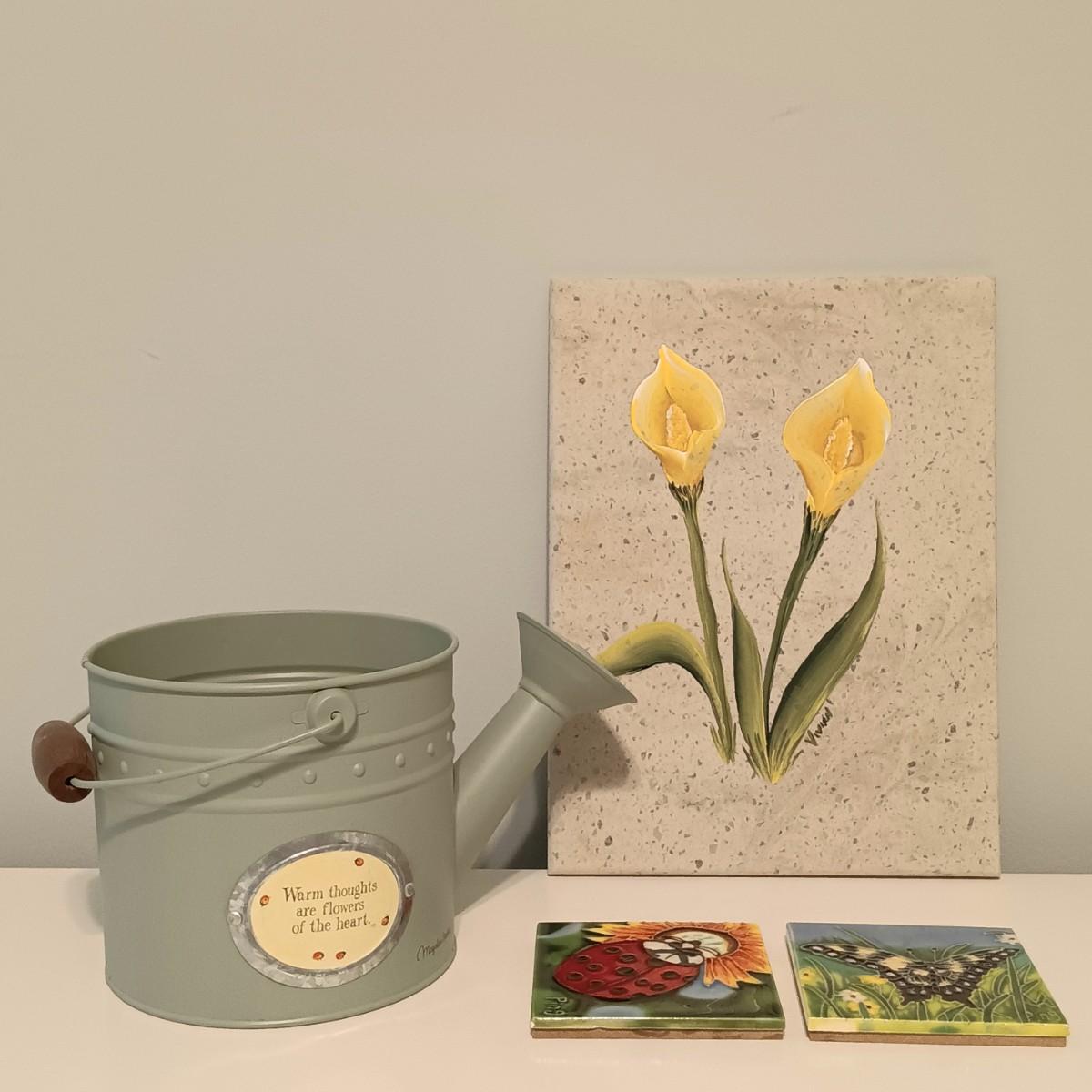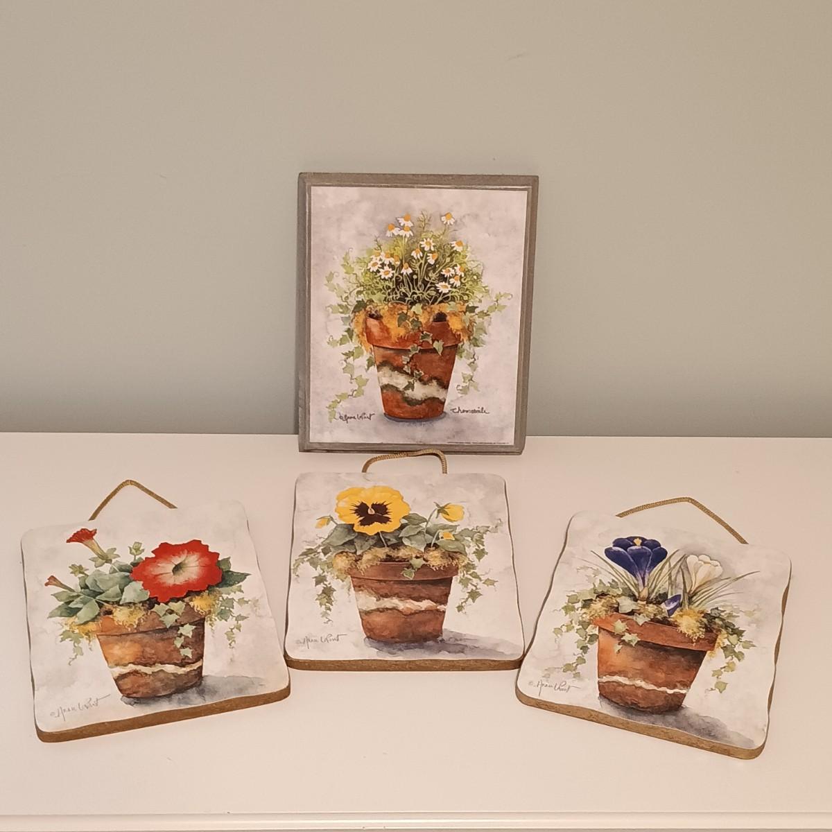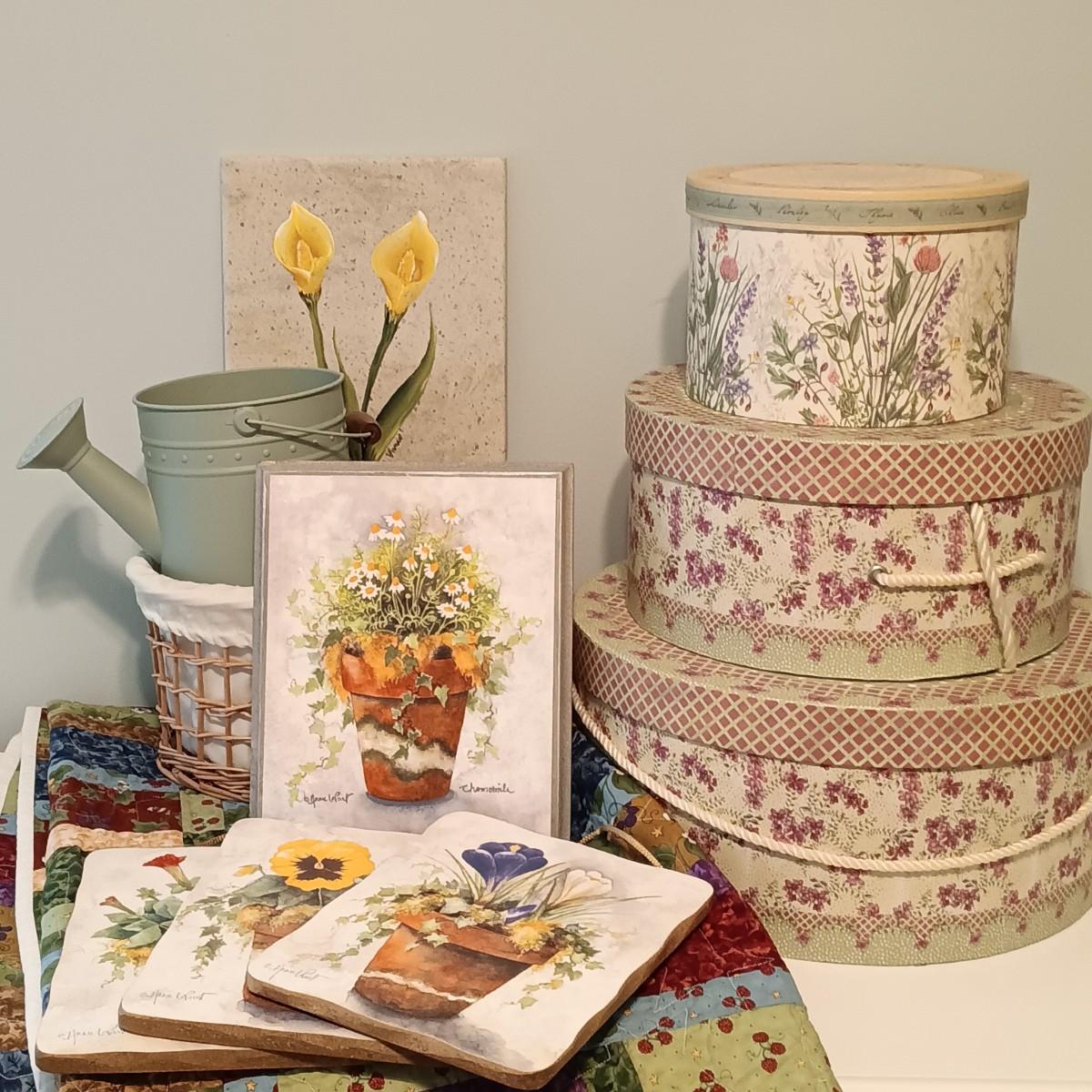 LOT 144: Cottagecore Collection- Handmade Quilt, Handpainted Stone Tile, Hat Boxes, Signed Ping Tile Art & More