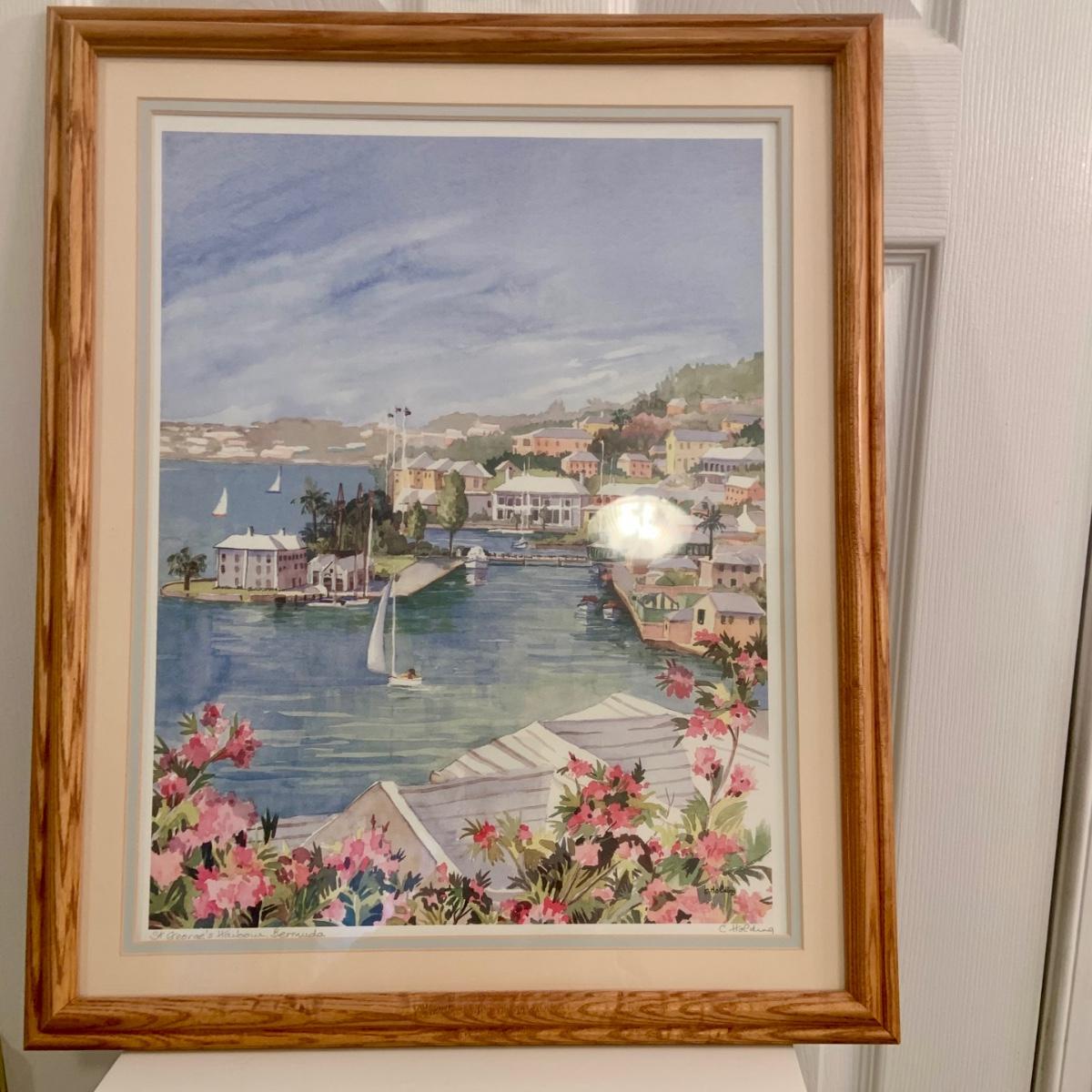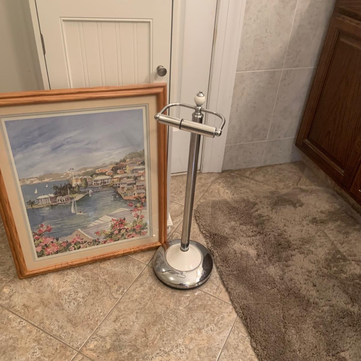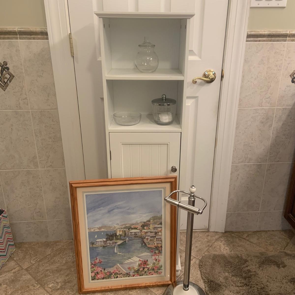 LOT:165: Bathroom Decor with White Standing Cabinet with Shelfs Toilet Paper Holder, St George's Harbour - Bermuda Framed Print and More