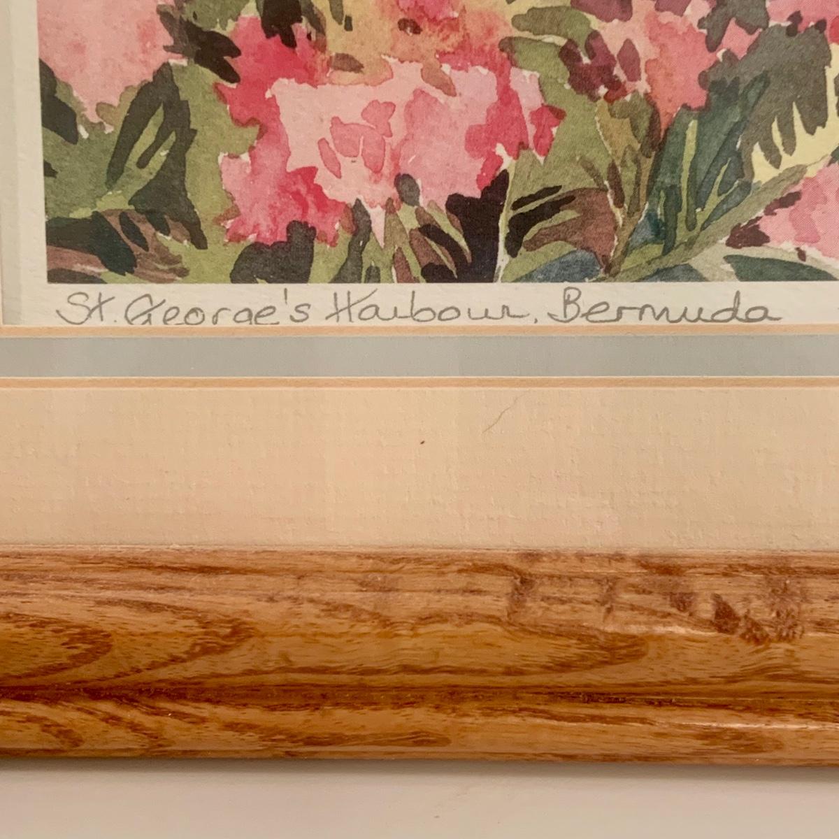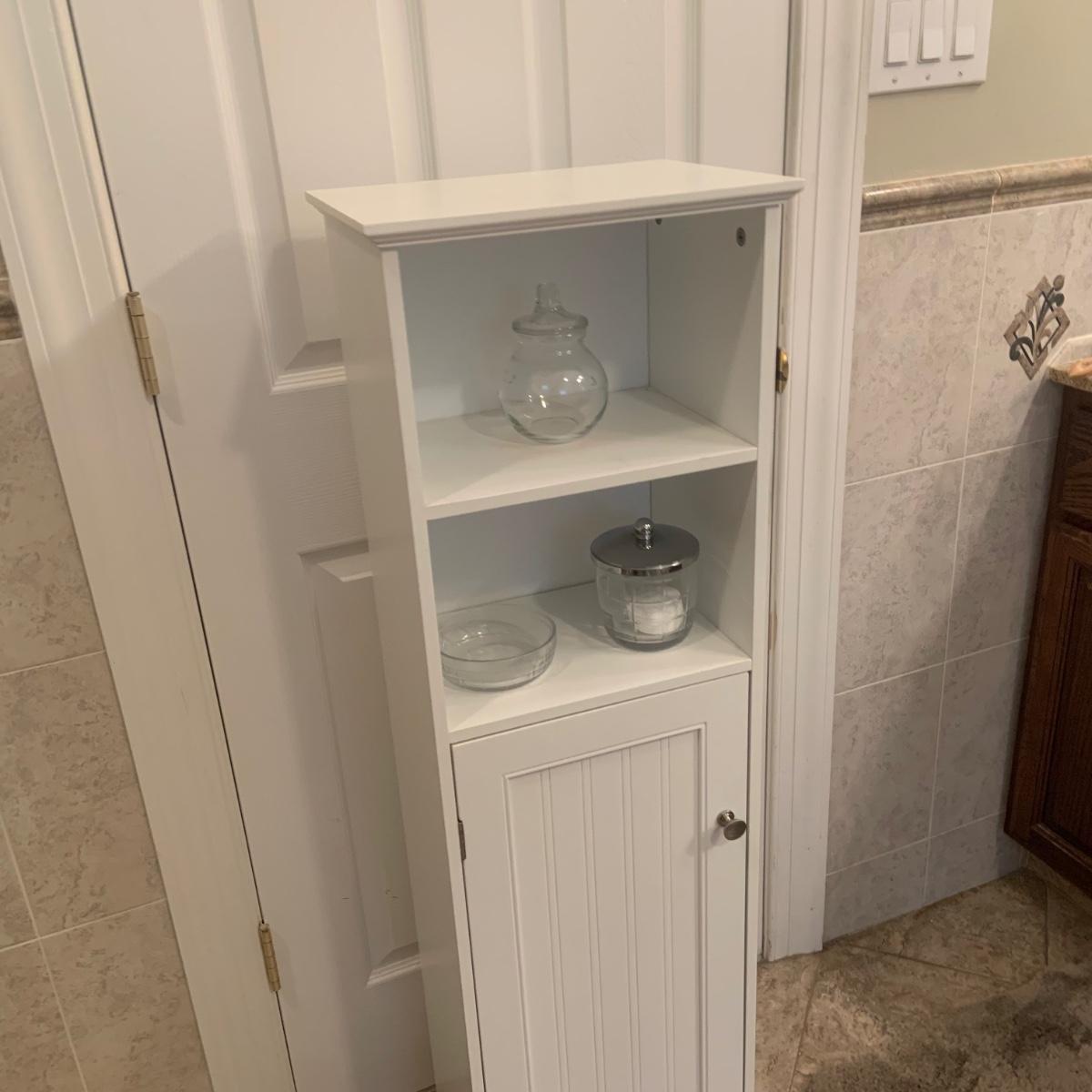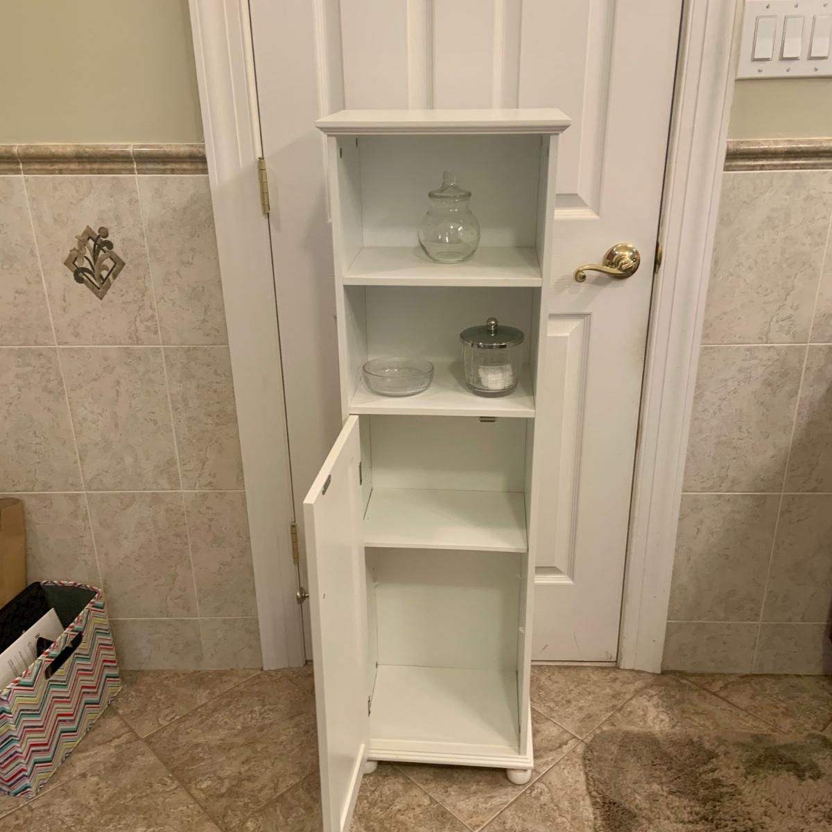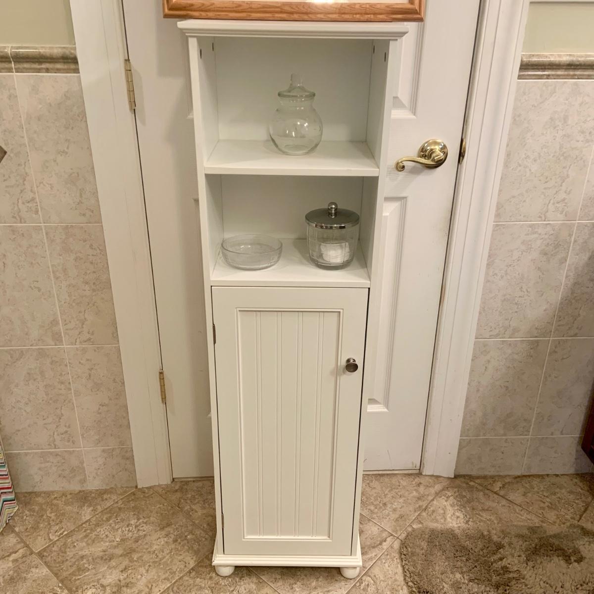 LOT:165: Bathroom Decor with White Standing Cabinet with Shelfs Toilet Paper Holder, St George's Harbour - Bermuda Framed Print and More
