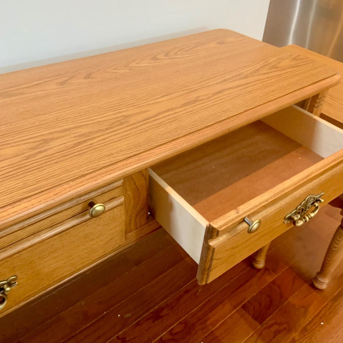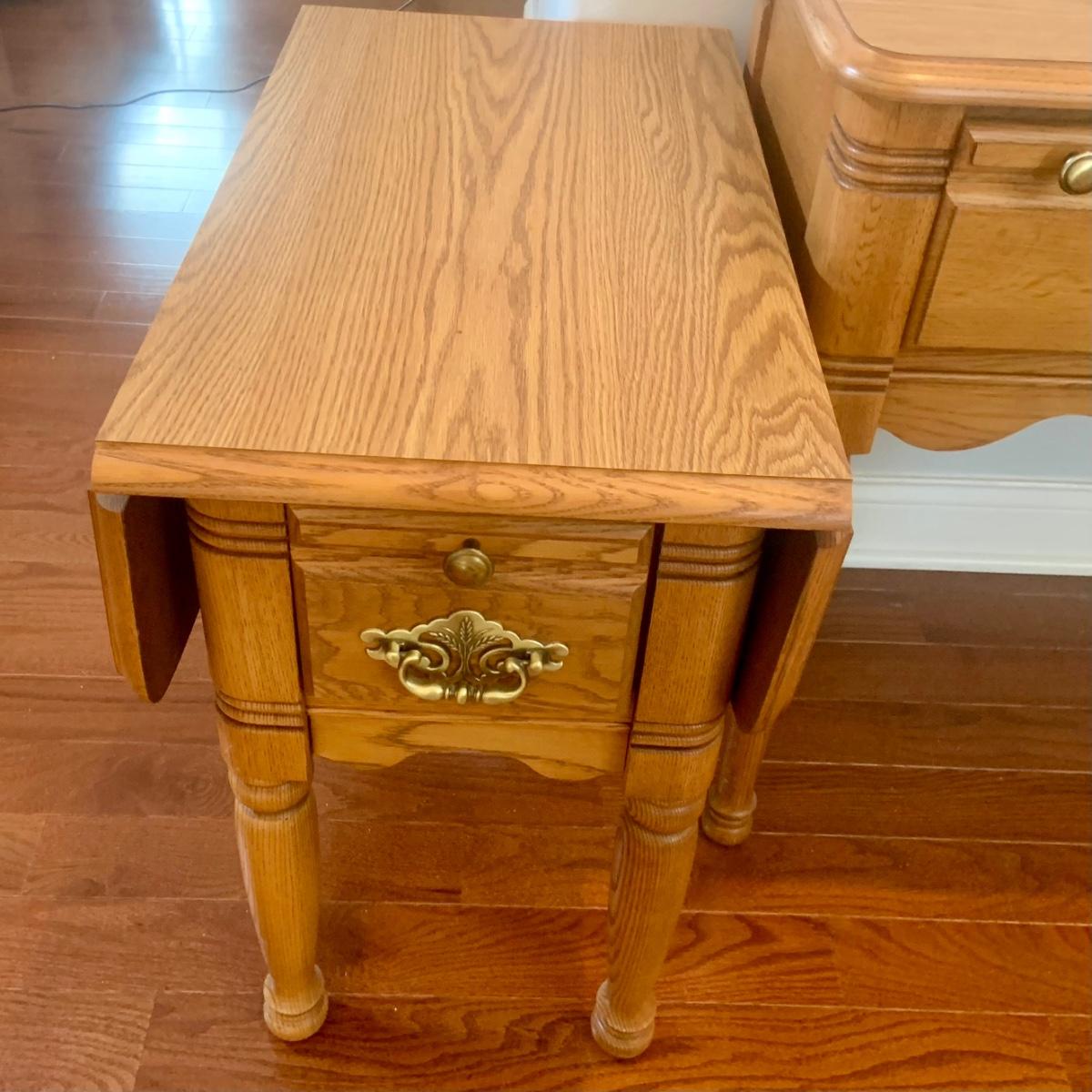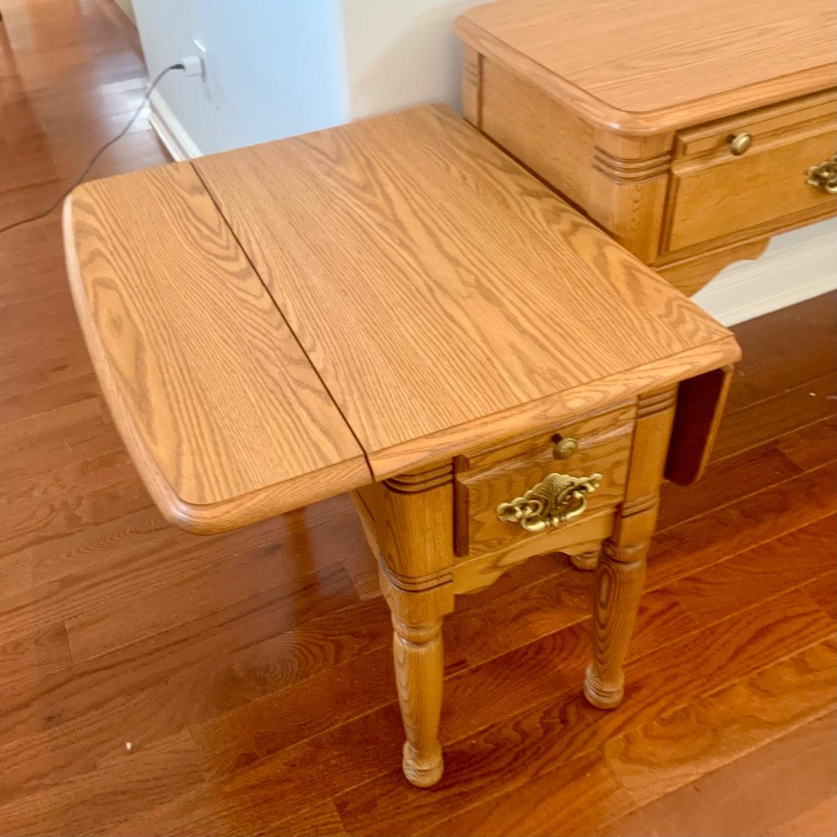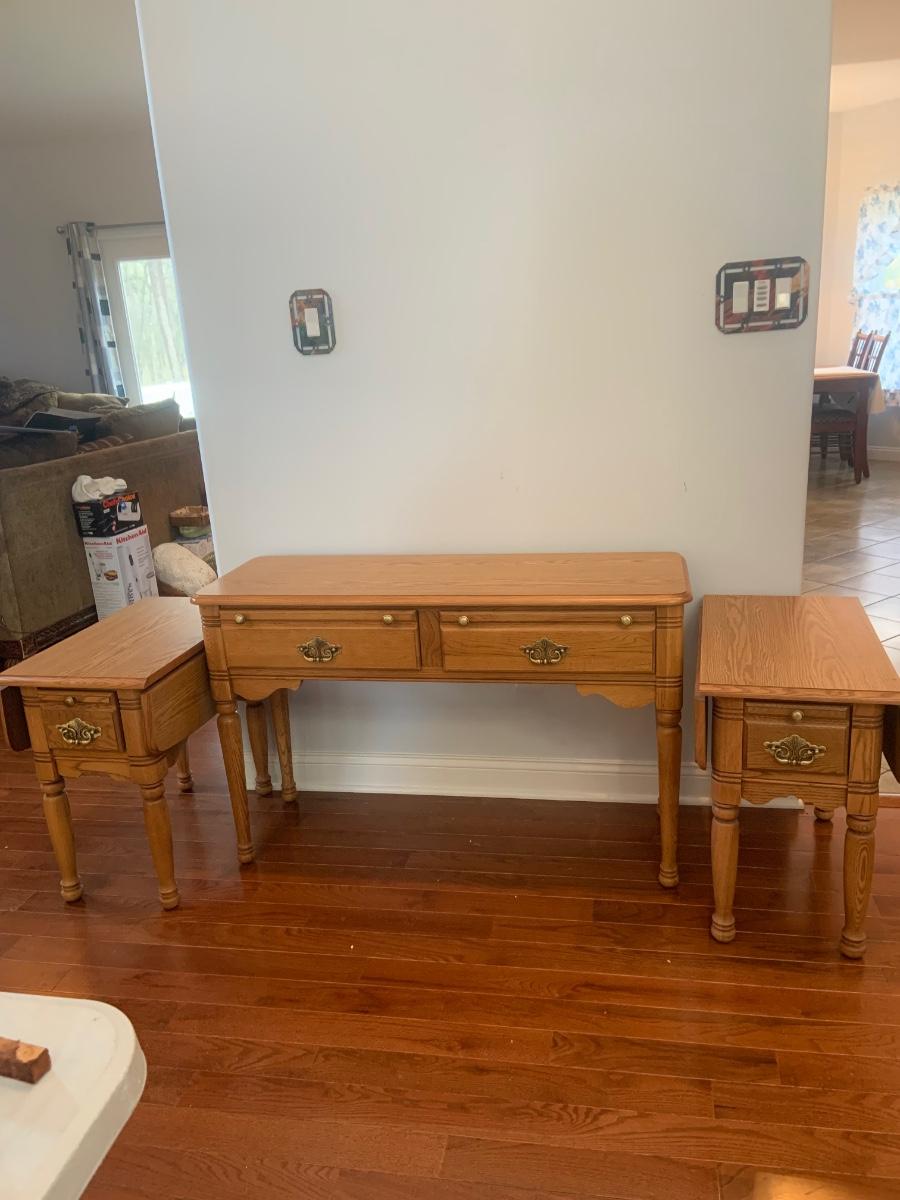 One of the drop leaf end tables need repair - the piece that hold up the leaf broke off but is included. The end tables measure 14 x 19 x 24 with (2) 7" leafs