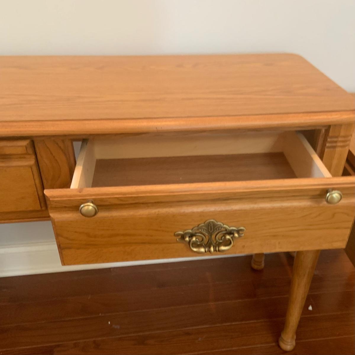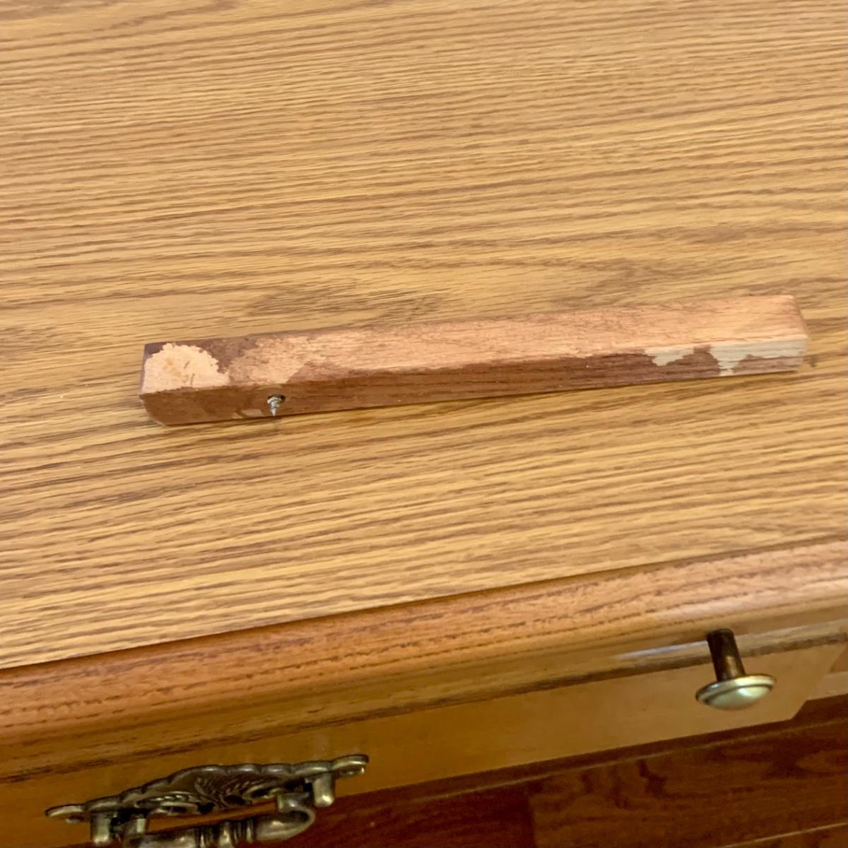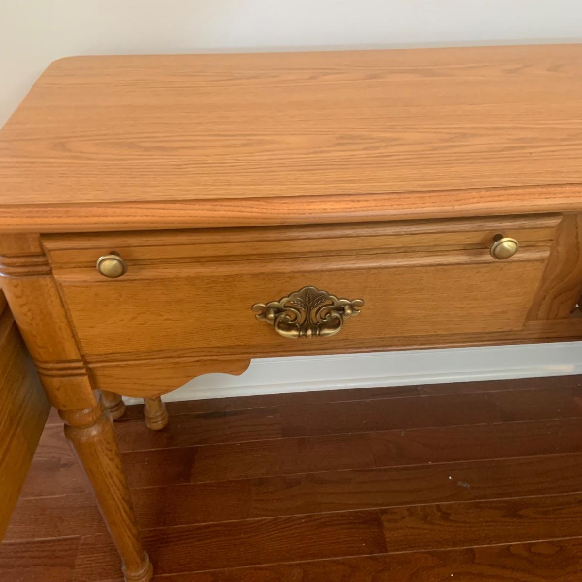 One of the drop leaf end tables need repair - the piece that hold up the leaf broke off but is included. The end tables measure 14 x 19 x 24 with (2) 7" leafs