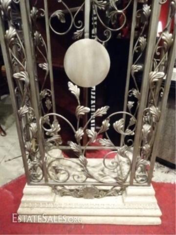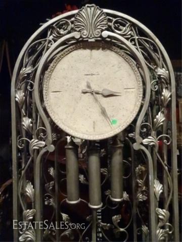 LOT 102A: TREVISSO GRANDFATHER CLOCK BY HOWARD MILLER, ARCH TOP, METAL VINE AND LEAF MOTIF, ANTIQUE PLATINUM FINISH, STONE FINISH BASE AND CLOCK FACE, QUARTZ DUAL CHIME MOVEMENT PLAYS WESTMINSTER OR AVE MARIA CHIMES WITH AUTO NIGHTTIME SHUT-OFF, 82.25"H X 30"W X 16"D, NON-WORKING CONDITION - NEEDS NEW WORKS RE: OLD BATTERIES LEFT IN CLOCK, SKU812.09