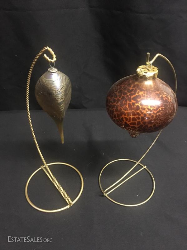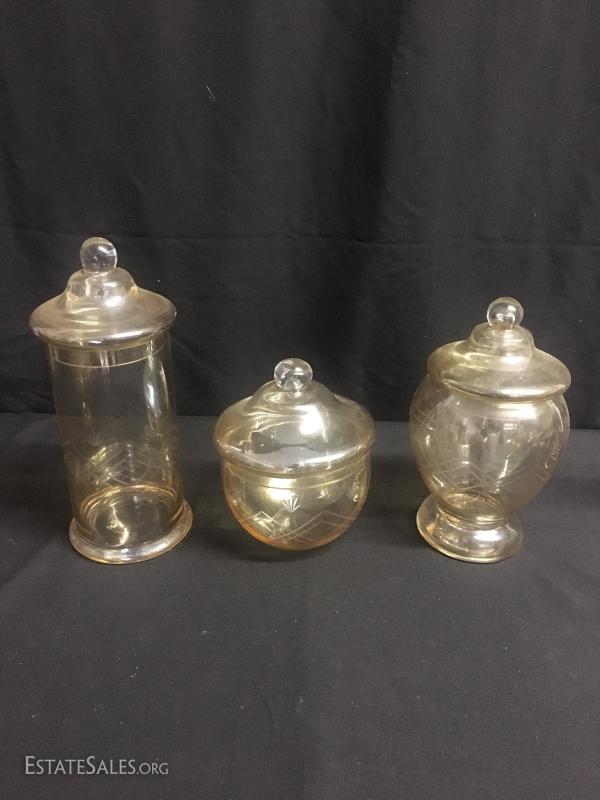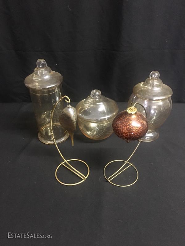 3 etched smoke-colored glass canisters and two glass ornaments with stands. Tallest canister is 11.5" tall. This lot is available for shipping or local pick up in waynesville, NC.