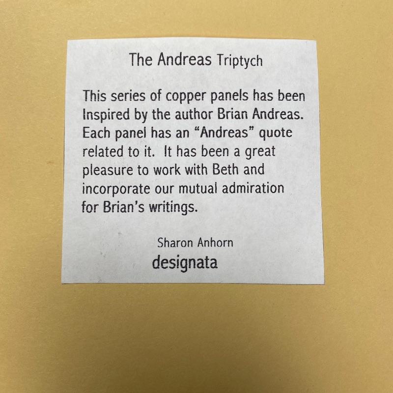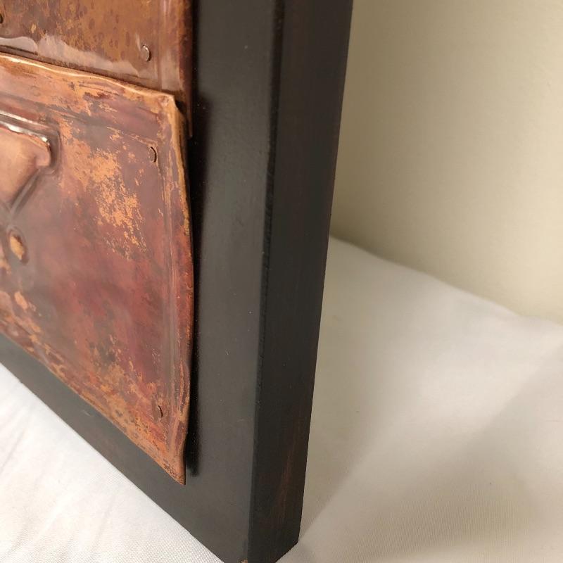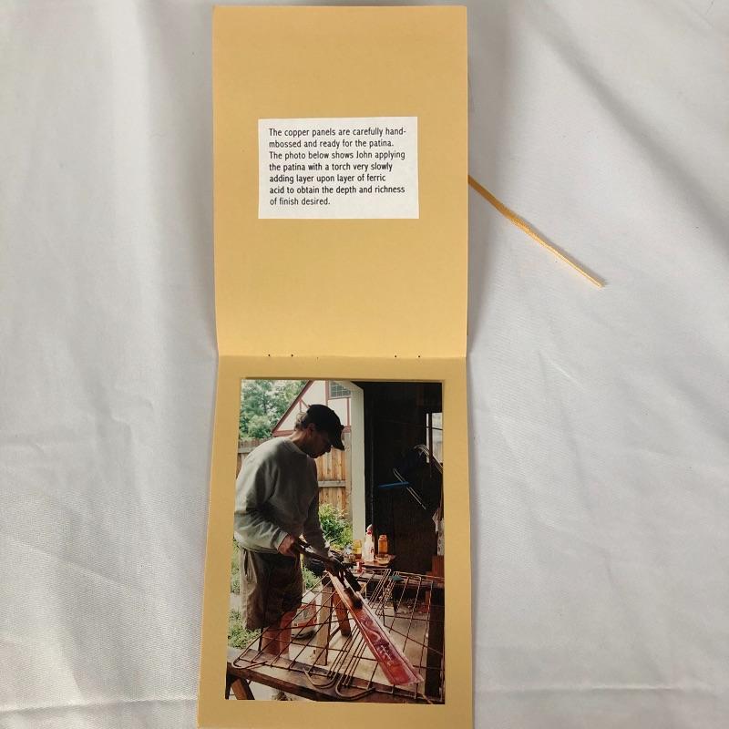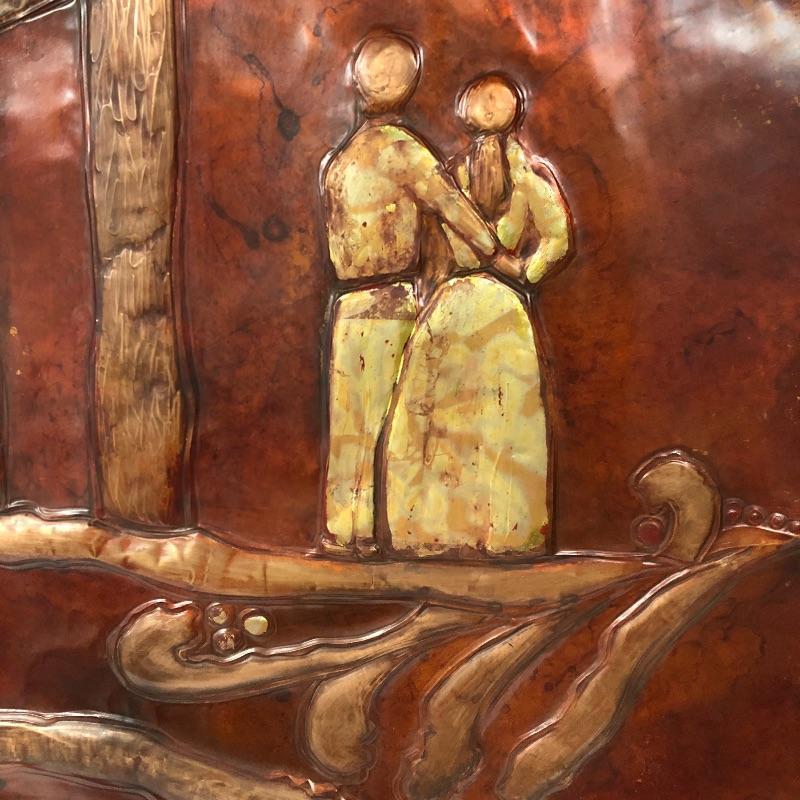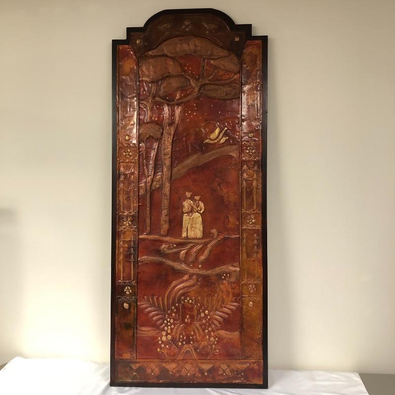 This piece in the first in a set of three pressed copper pieces commissioned by Sharon Shuster Anhorn. It is made out of copper pressed on a wood board and was inspired by works of Brian Andreas. There are a few stains due to aging and rust on the back. Additional information can be found in the small booklet that accompanies this lot, see pictures. It measures about 60” x 25.” The other two panels are found in Lot 107 and 112. Buy one or buy the set. Last photo is to show perspective of size.