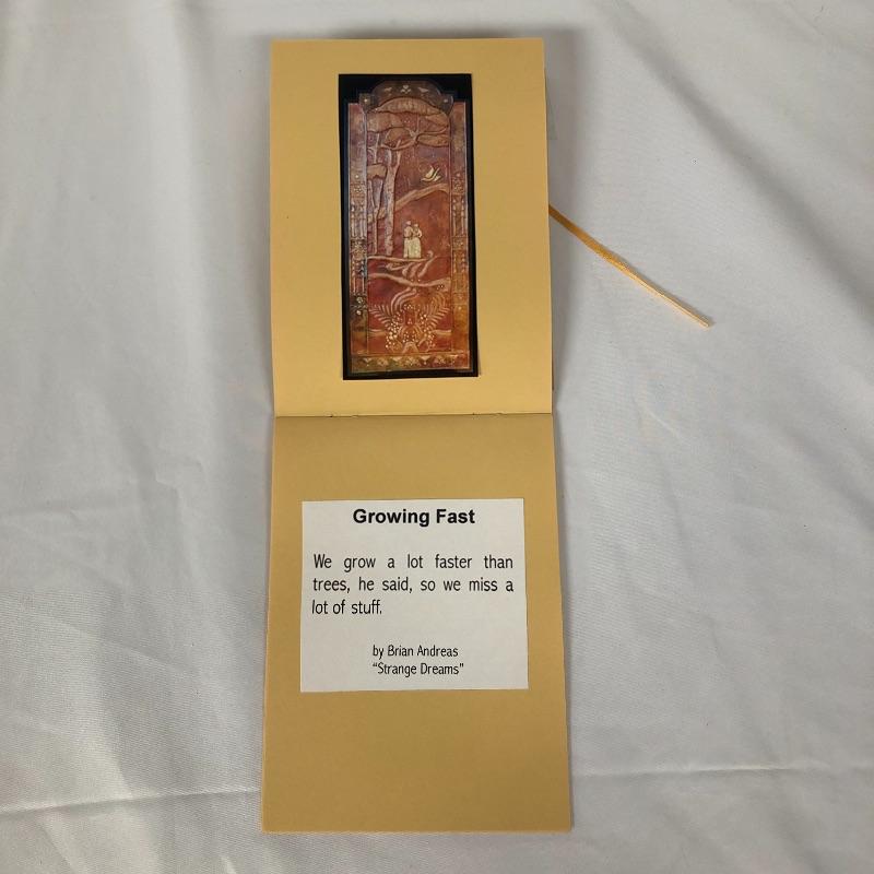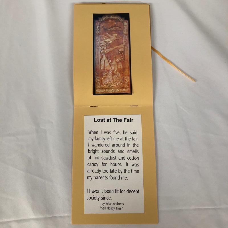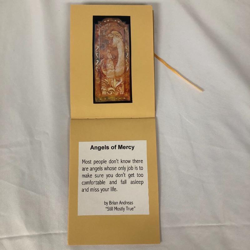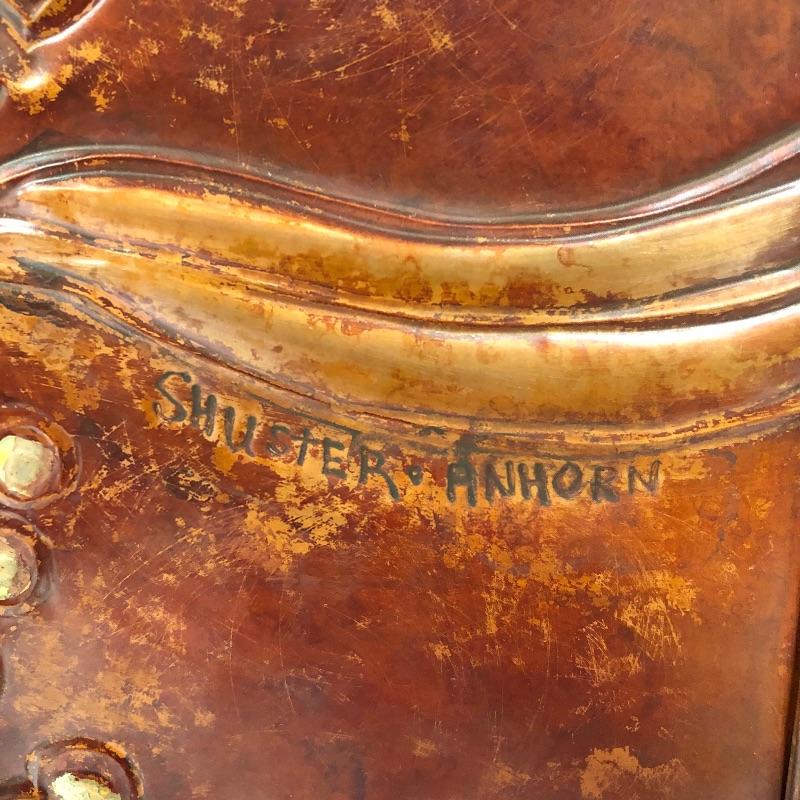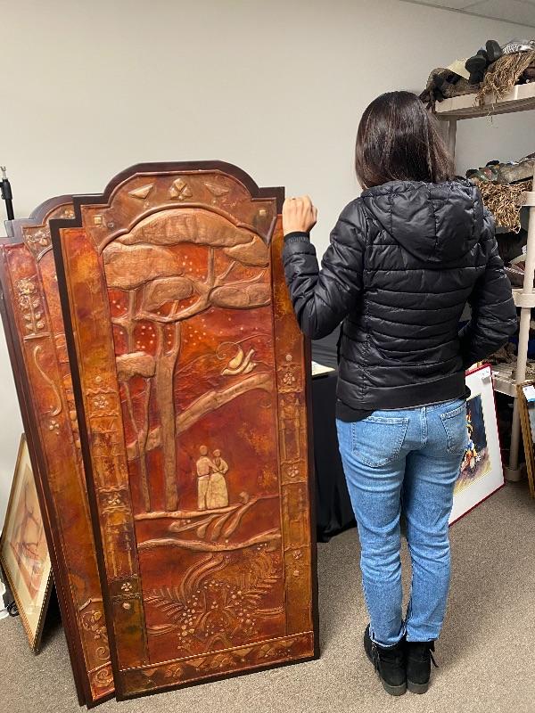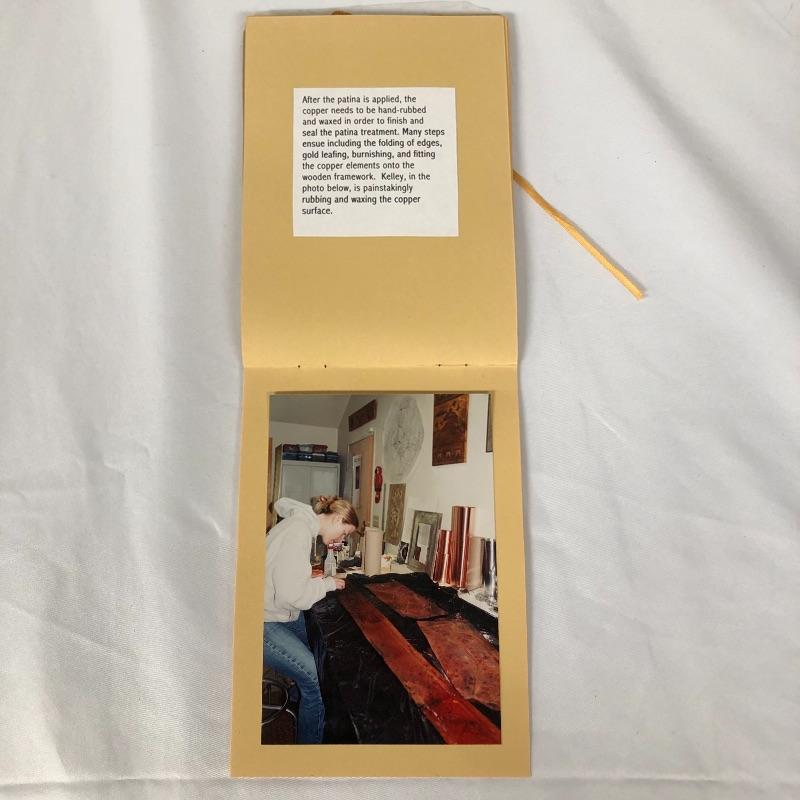 This piece in the first in a set of three pressed copper pieces commissioned by Sharon Shuster Anhorn. It is made out of copper pressed on a wood board and was inspired by works of Brian Andreas. There are a few stains due to aging and rust on the back. Additional information can be found in the small booklet that accompanies this lot, see pictures. It measures about 60” x 25.” The other two panels are found in Lot 107 and 112. Buy one or buy the set. Last photo is to show perspective of size.
