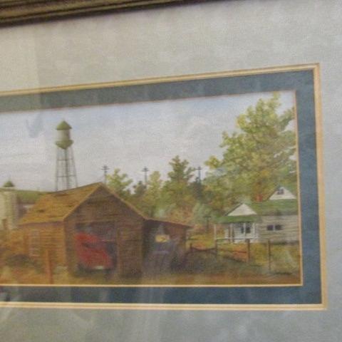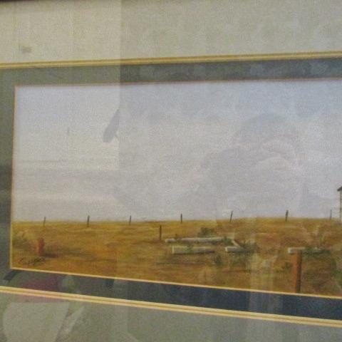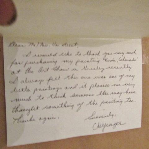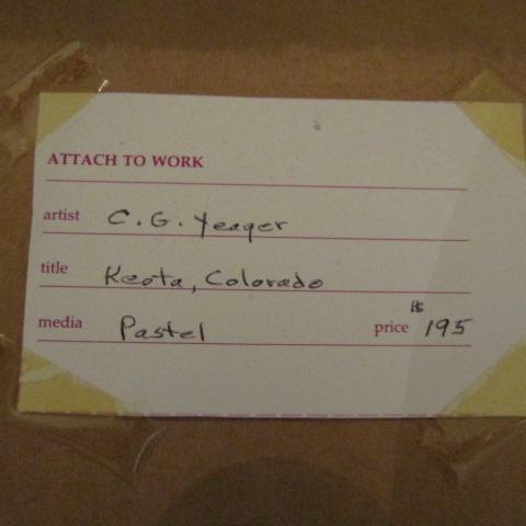 PASTEL PAINTING BY CG YEAGER TITLED "KEOTA, COLORADO" IS A CALMING PICTURE OF A COUNTRY SETTING. ATTACHED TO THE PICTURE IS A THANK YOU CARD FROM THE ARTIST IN HIS OWN HAND, .