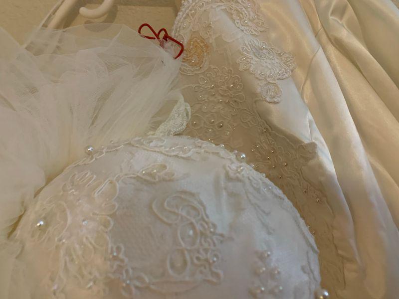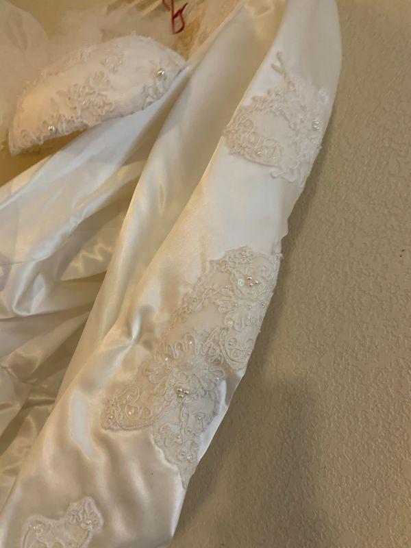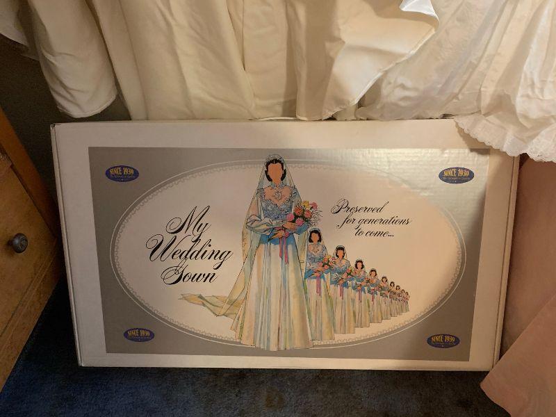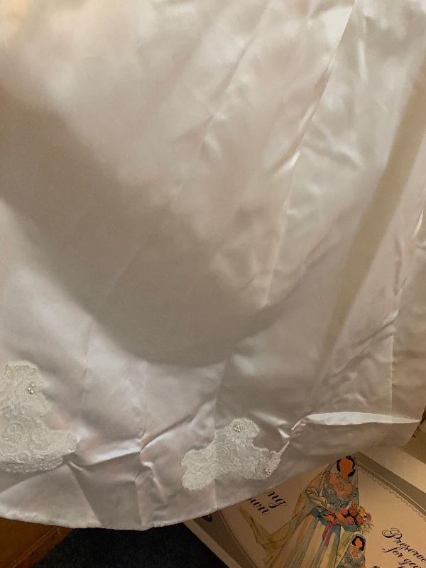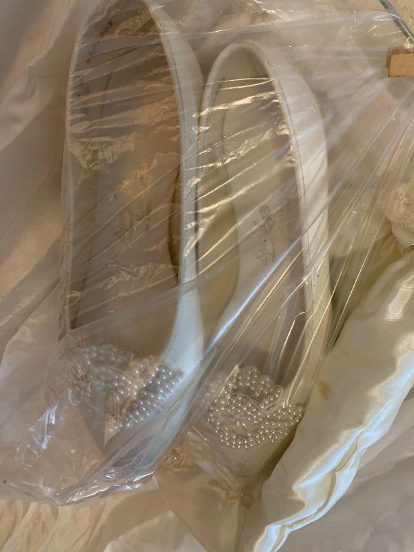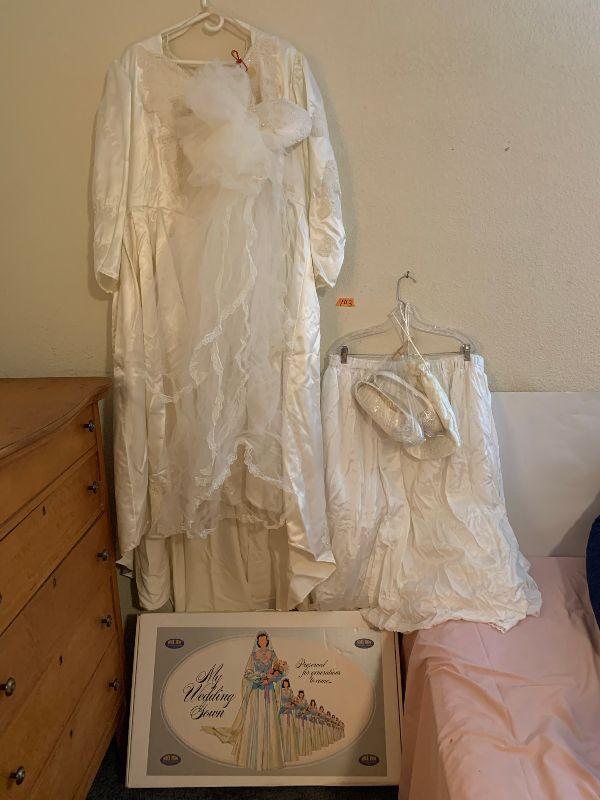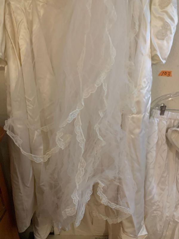Wedding dress 3X As is some light staining. Veil, shoes size 6, slip and box