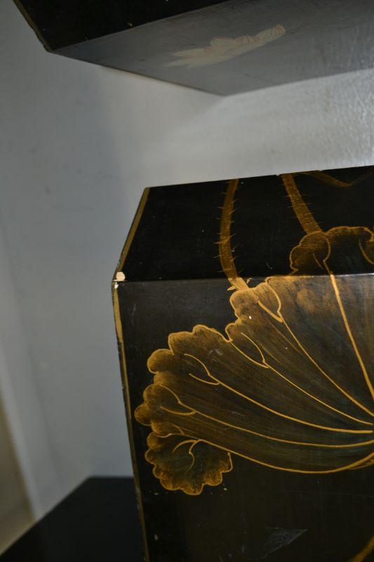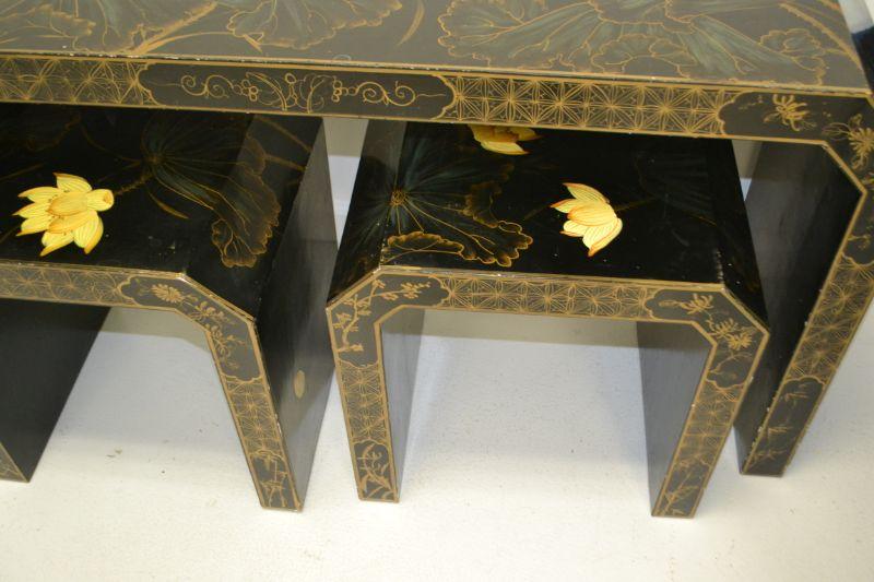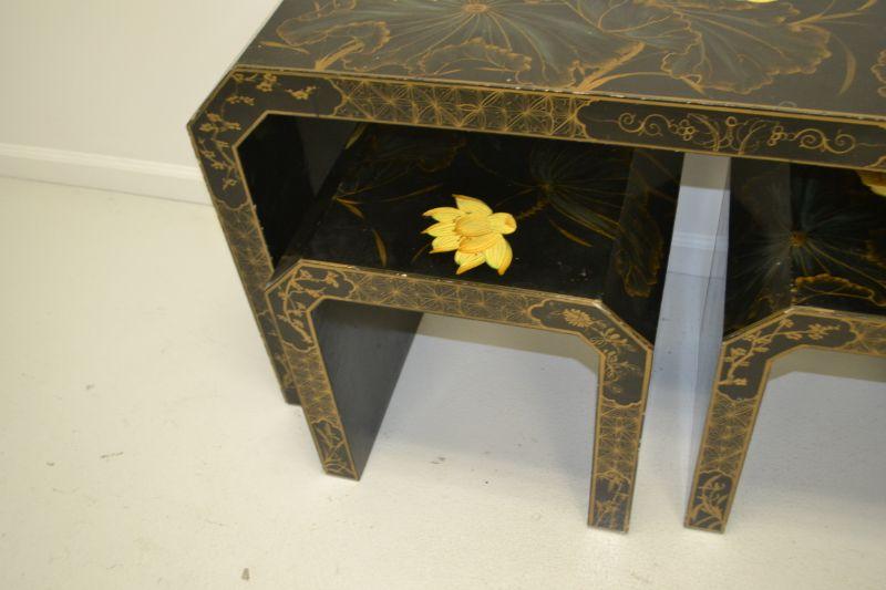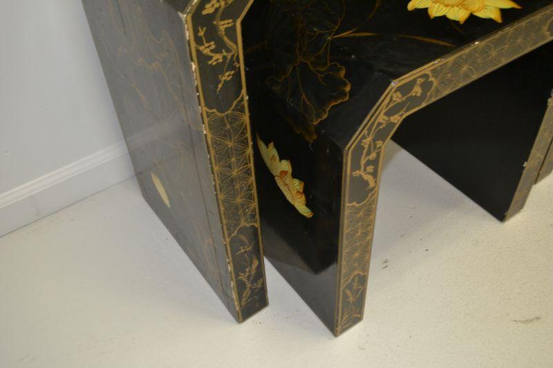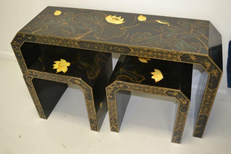 LOT 103 DECORATIVE ASIAN MODERN LACQUERED CONSOLE TABLE AND TWO STOOLS