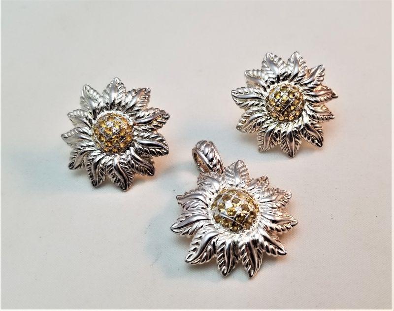 Heavy sterling silver Judith Ripka sunflower style pendant/enhancer with a pair of matching lever back pierced earrings. Set with citrine colored CZs. Enhancer 1.5" long, earrings 1 inch across. No box. Good condition.