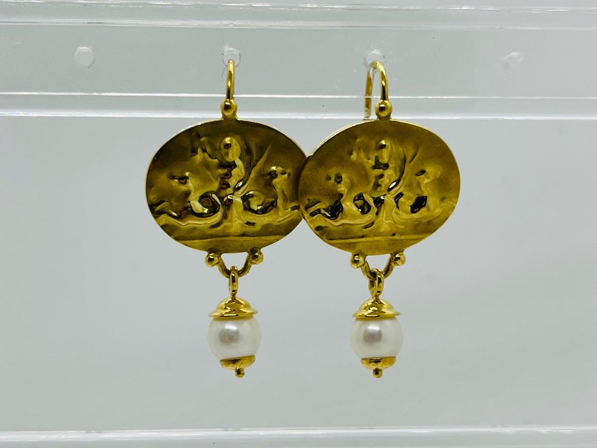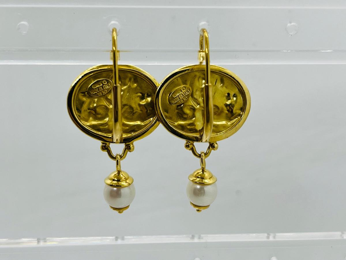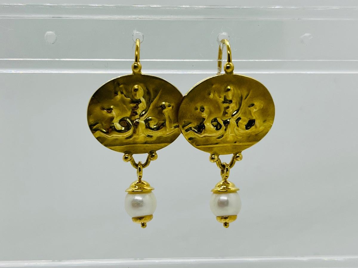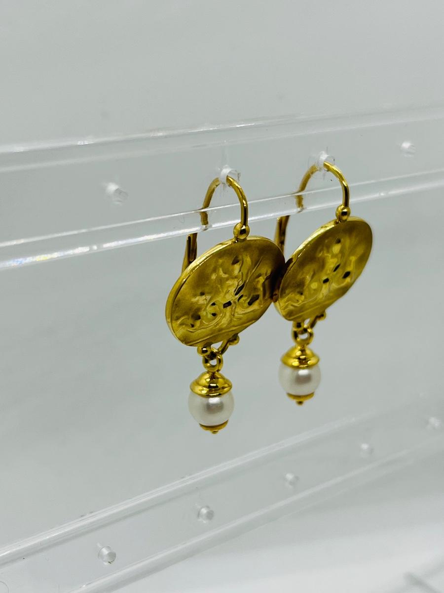 Lot 103: 6.4g 14k Venetian leverback dangle earrings with freshwater pearl dangle
