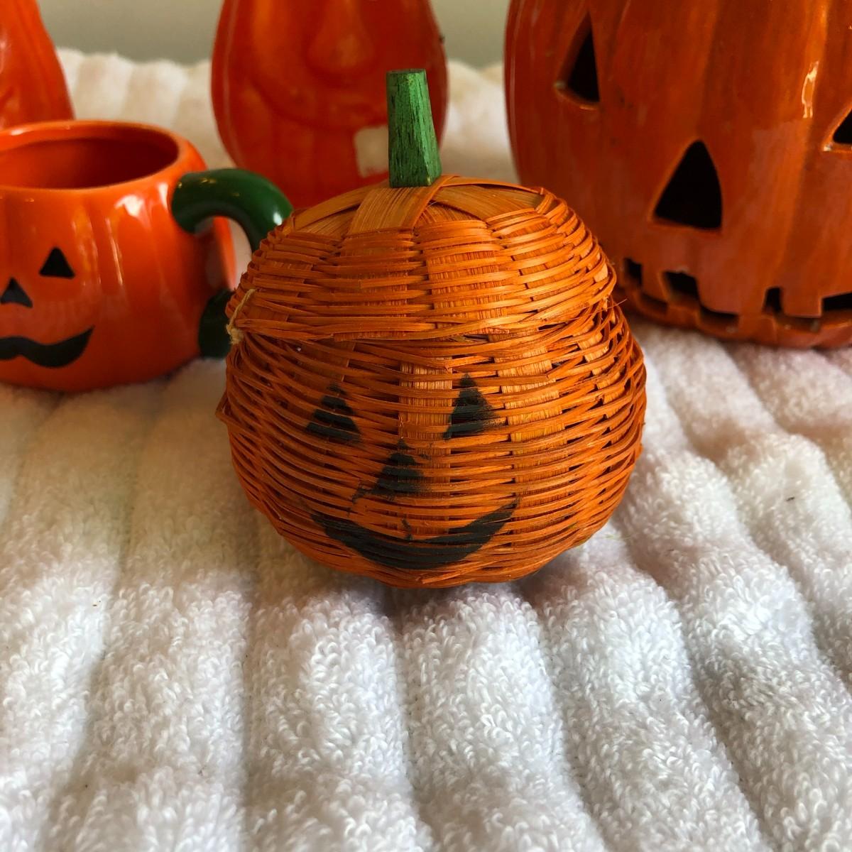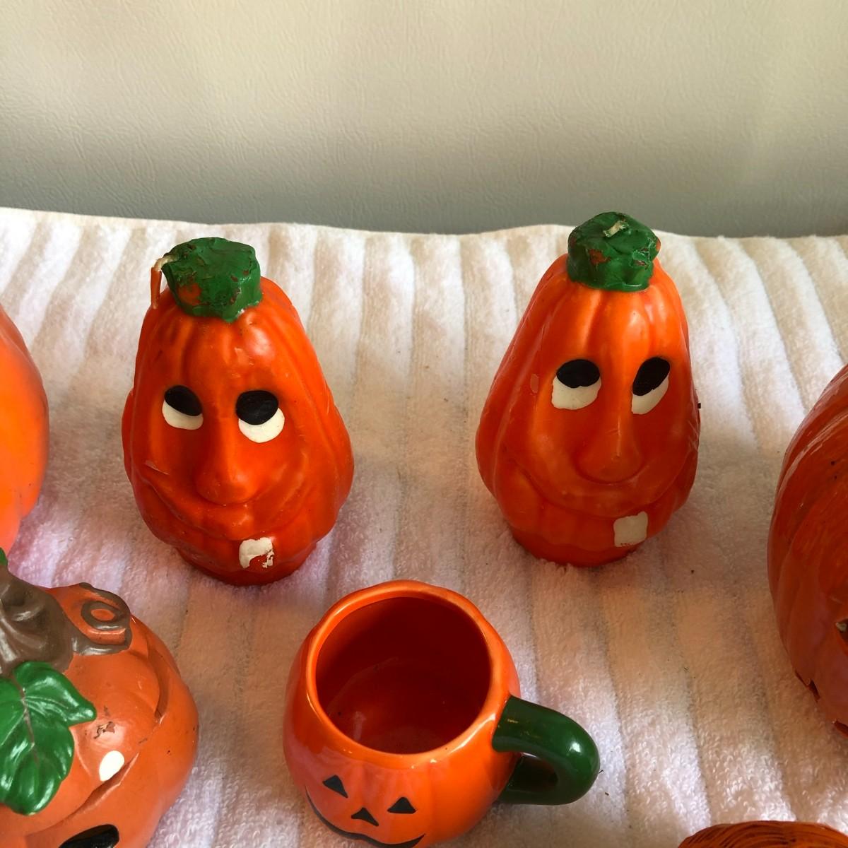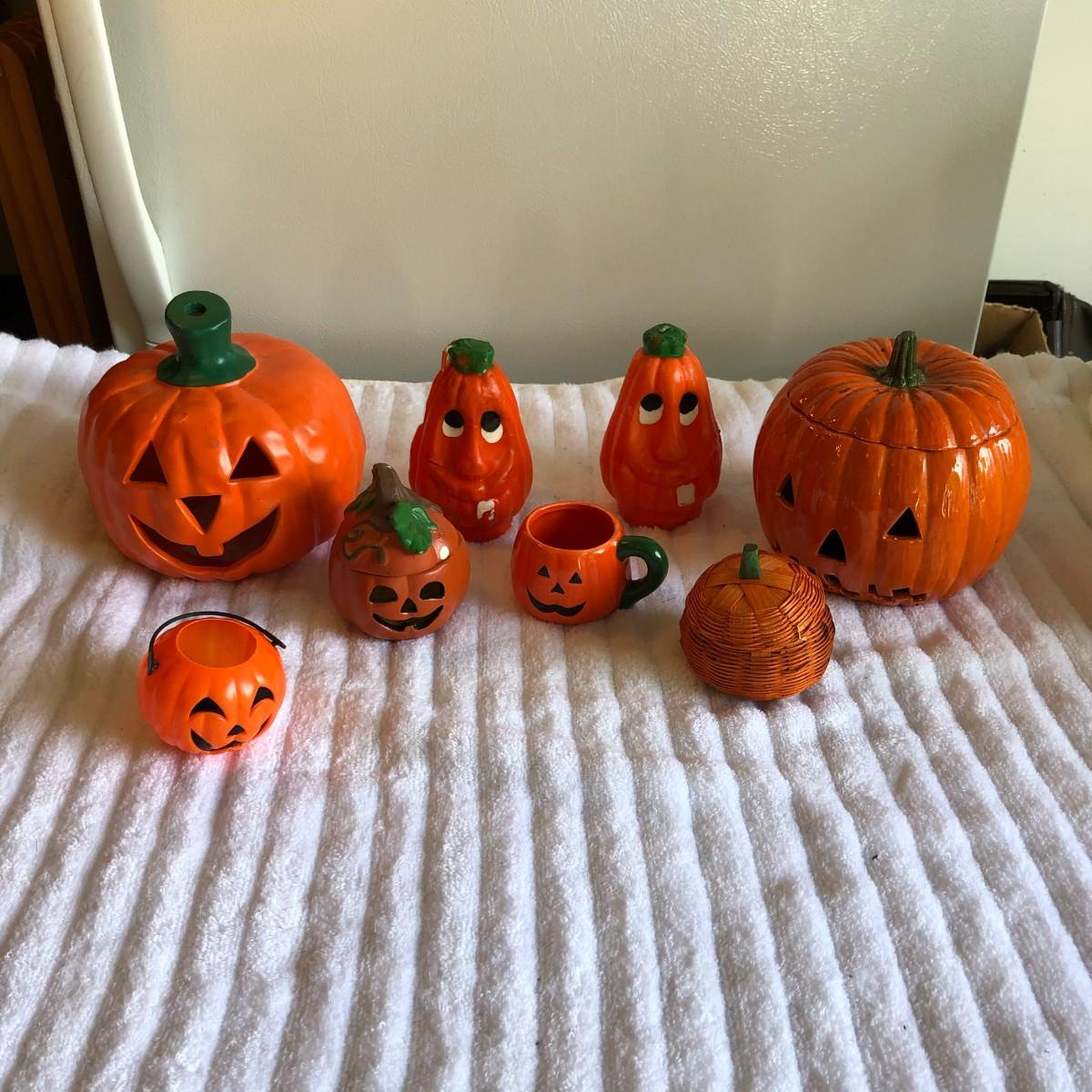 A variety of pumpkins ready to decorate in October. There are two candles, a wicker basket pumpkin, a small plastic bucket, and the rest are ceramic. The lid on one has been repaired which just adds to the Halloween appearance!