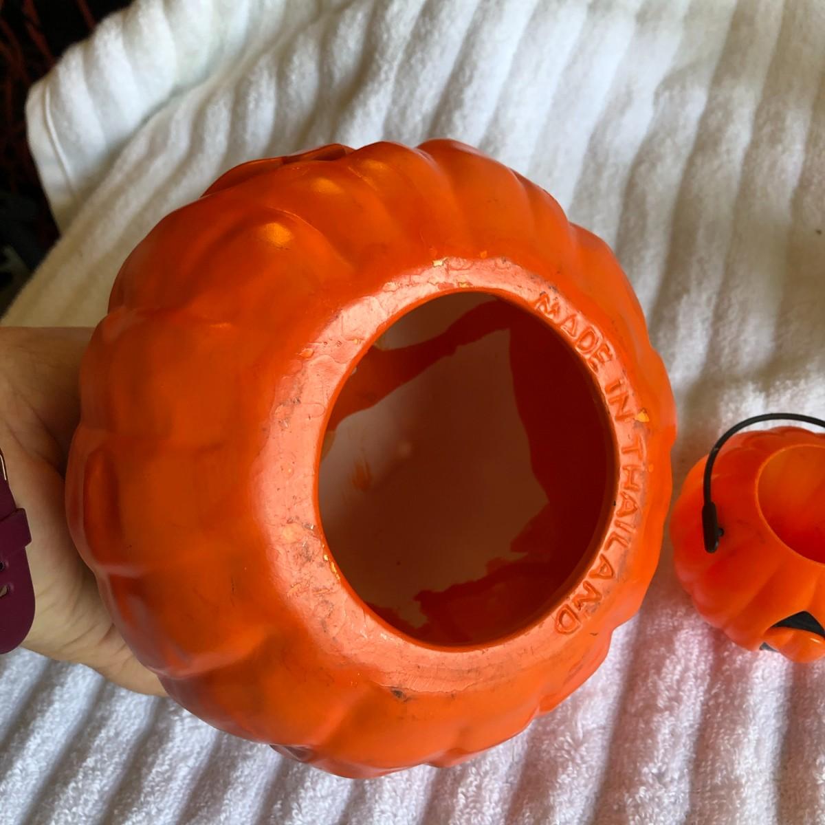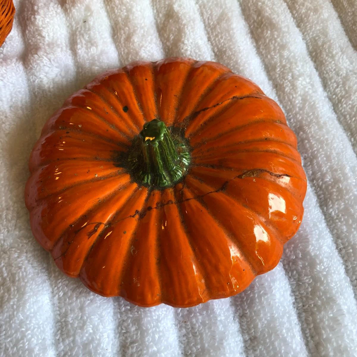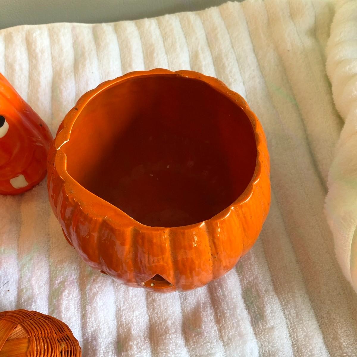 A variety of pumpkins ready to decorate in October. There are two candles, a wicker basket pumpkin, a small plastic bucket, and the rest are ceramic. The lid on one has been repaired which just adds to the Halloween appearance!