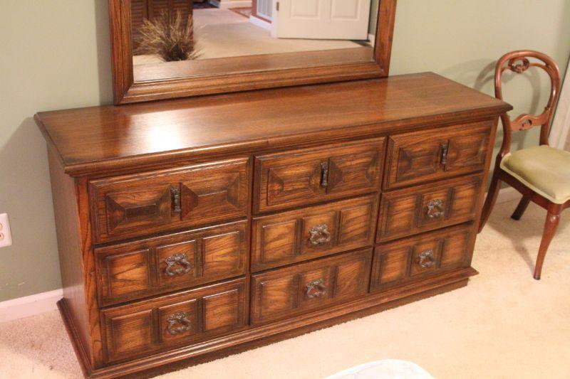Made in Wilkesboro, NC of solid wood in the 70's. Back is plywood. Dark wood stain finish. 3D geometric design on 6 drawers with two different types of hardware. dimensions 61" w x 18" d x 31" h. Attached mirror is removable. Dimensions 42" w x 33" h. Very few scratches. Nothing significant.