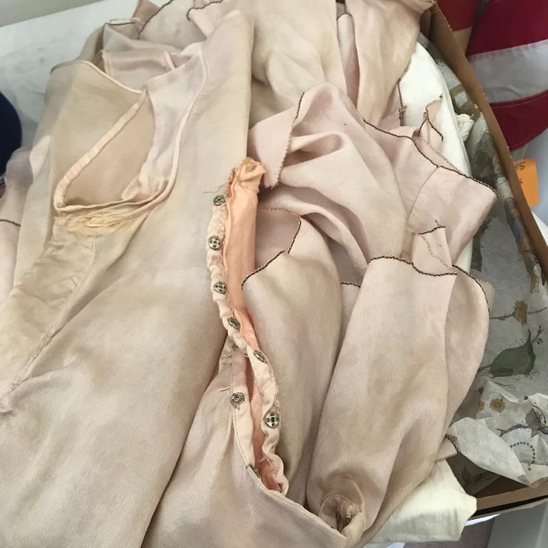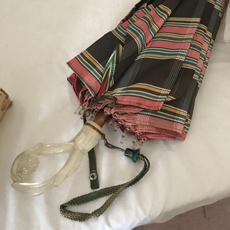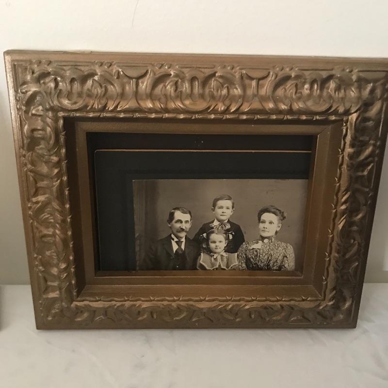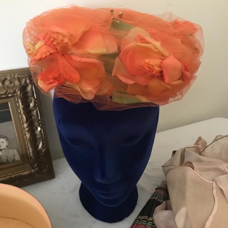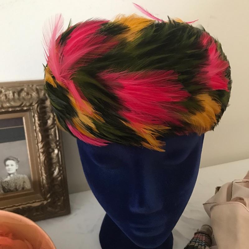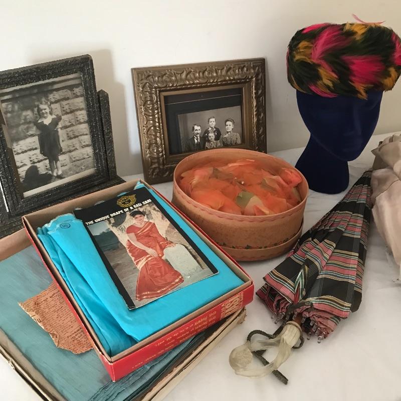 Lot includes awesome feather hat, antique frames and photos, antique hat in box, silk fabric, a parasol, and antique clothing. Blue hat stand/head not included. See pics. Shipping available.
