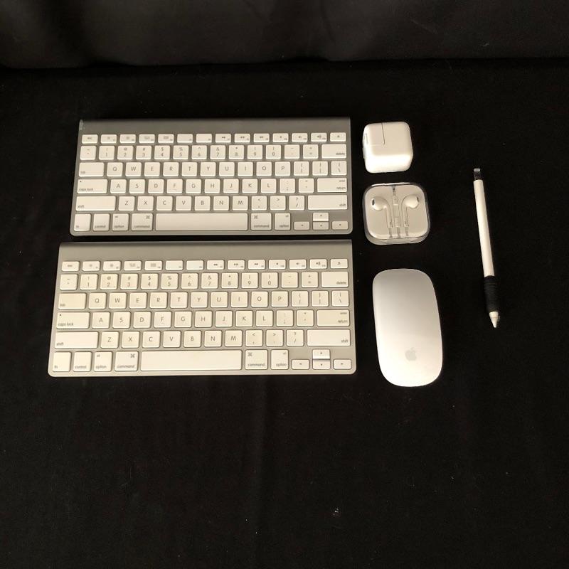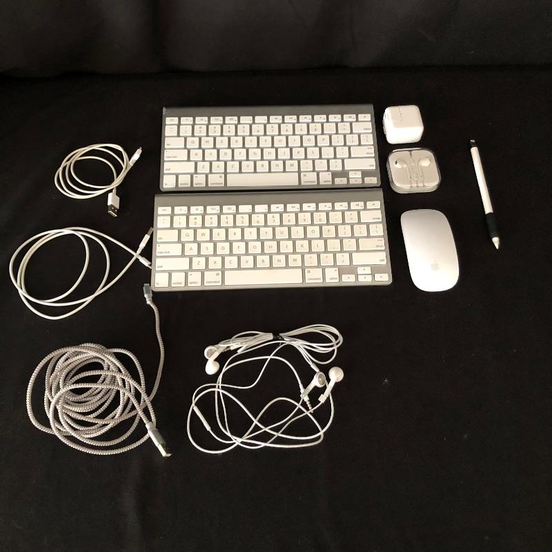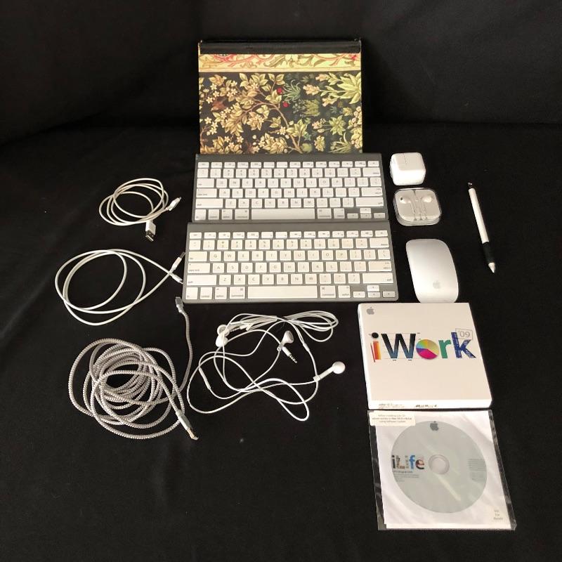This collection of Apple products is great for the Apple fan and includes a 2008 MacBook Pro with a 2.4 GHz Intel Core 2 Duo, 4GB memory 250GB hard drive with DVD with charger,two A1314 Bluetooth keyboards, Apple Pencil, Magic Mouse, two Lightning cables, thirty pin cable, iLife and iWork 09 software, a nature themed 6.75” x 9.5” iPad case, charging block and three sets of headphones. Keyboards, mouse and pencil were not tested as batteries are dead. MacBook Pro worked when tested.