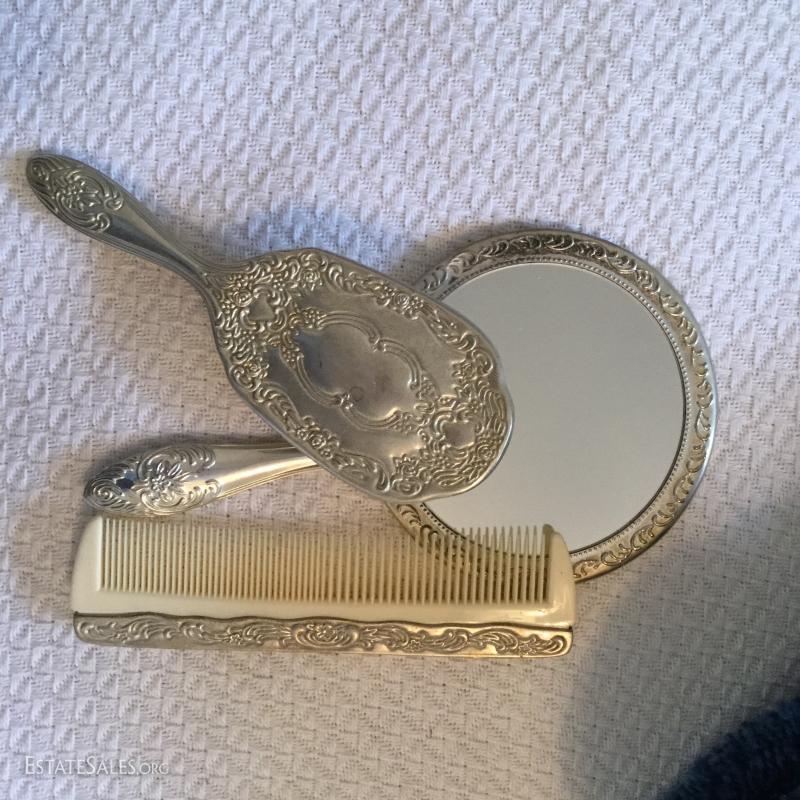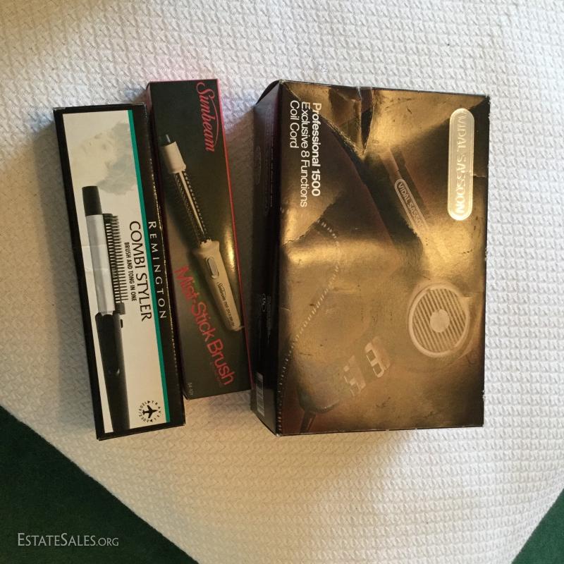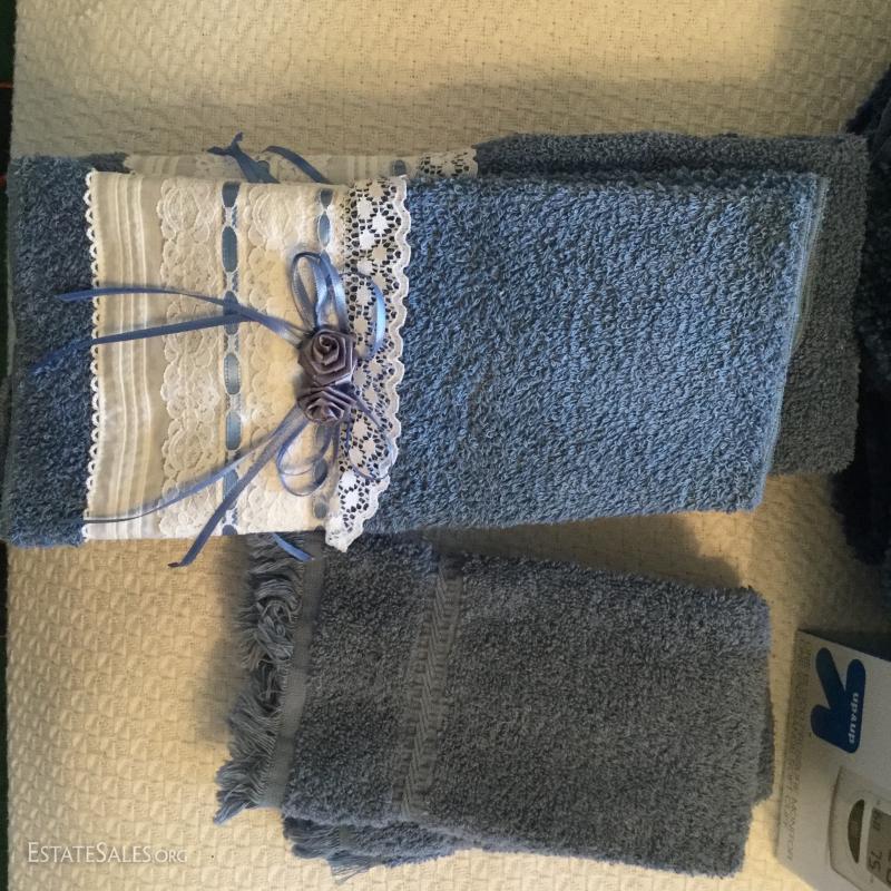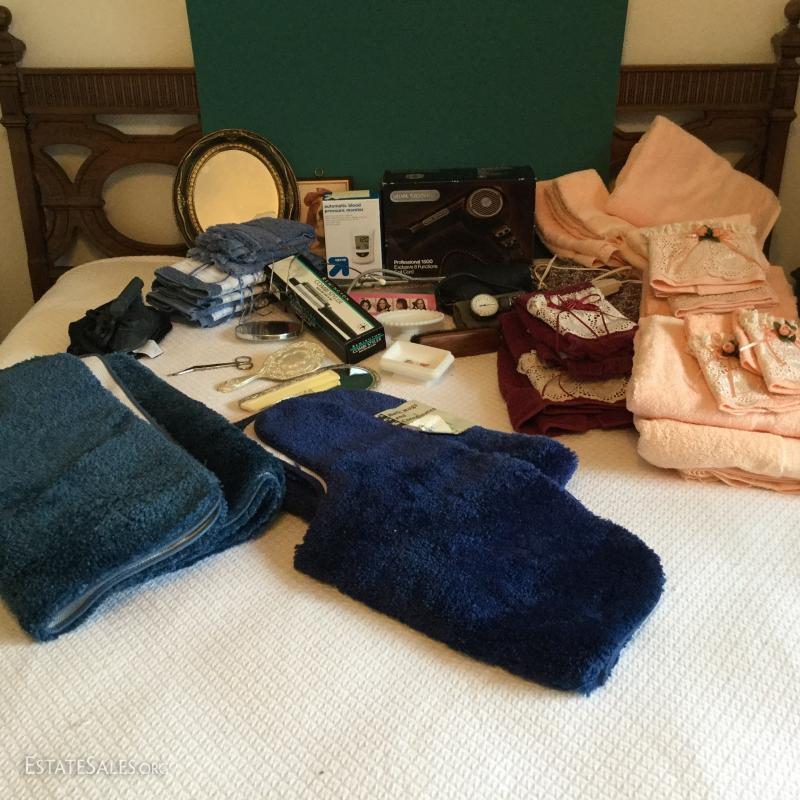 Miscellaneous Lot of brand new, lace detail Towels and hand towels to match, Automatic blood pressure monitor, Sunbeam Mist Stick Brush, Silverplate mirror & comb, Remington Combi Styler, 2 milk glass soap dishes and a small hanging mirror. Local pick up only Columbus, NC