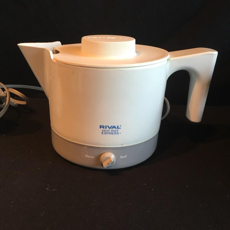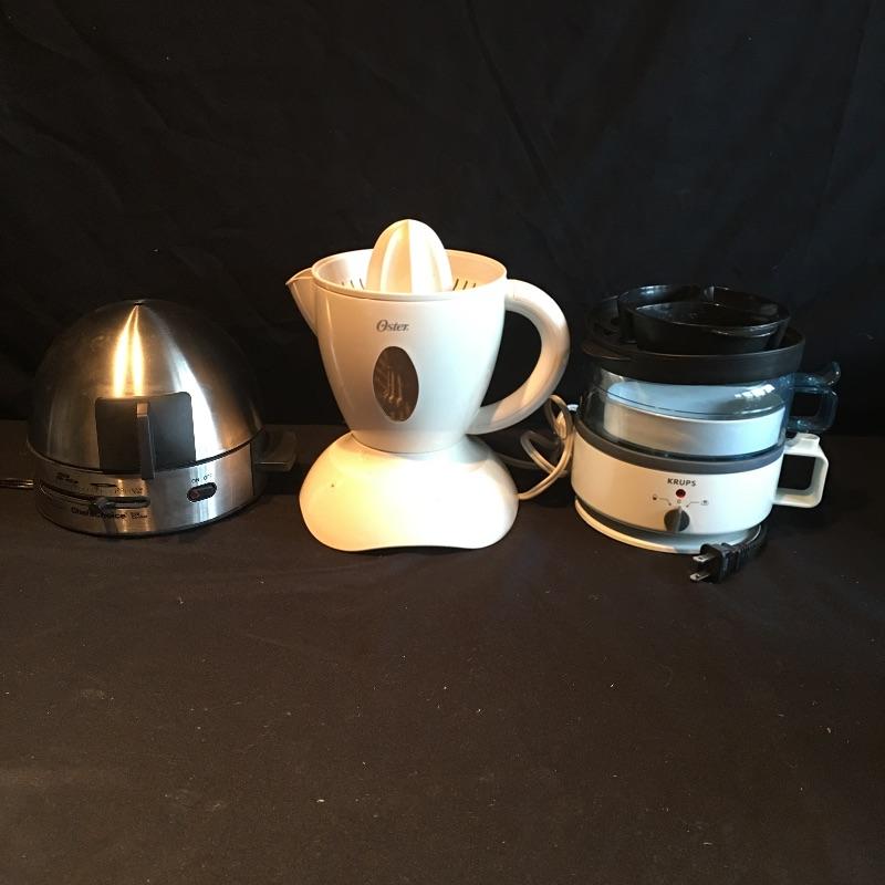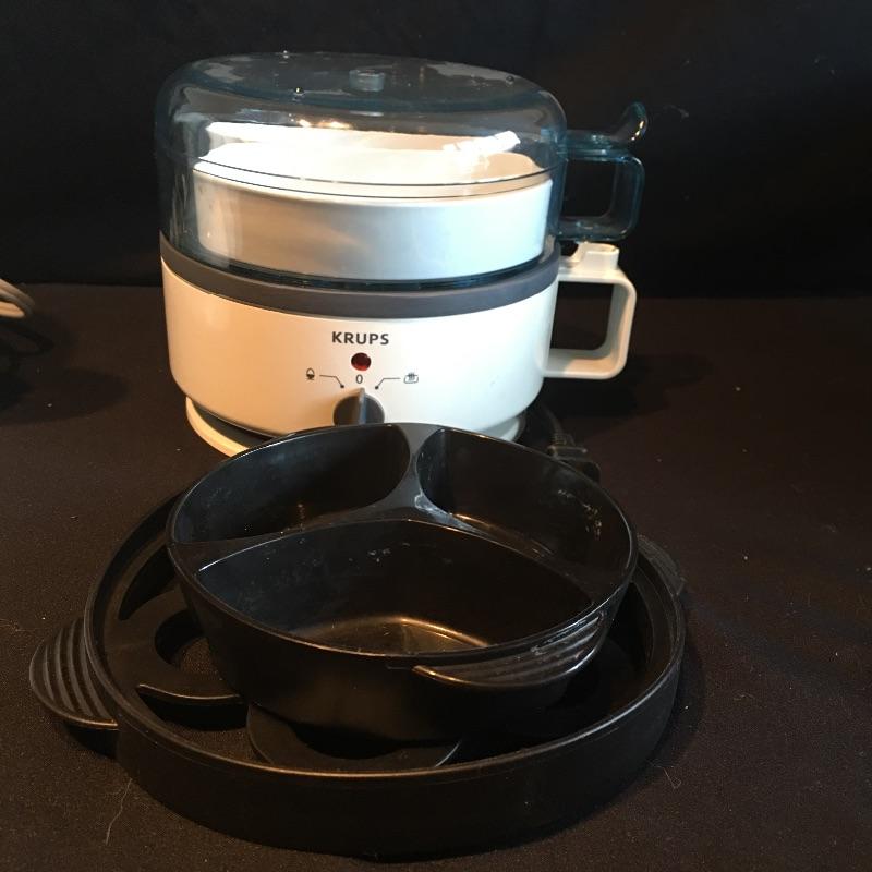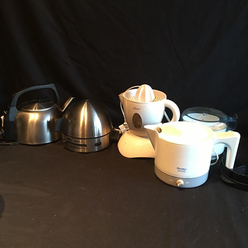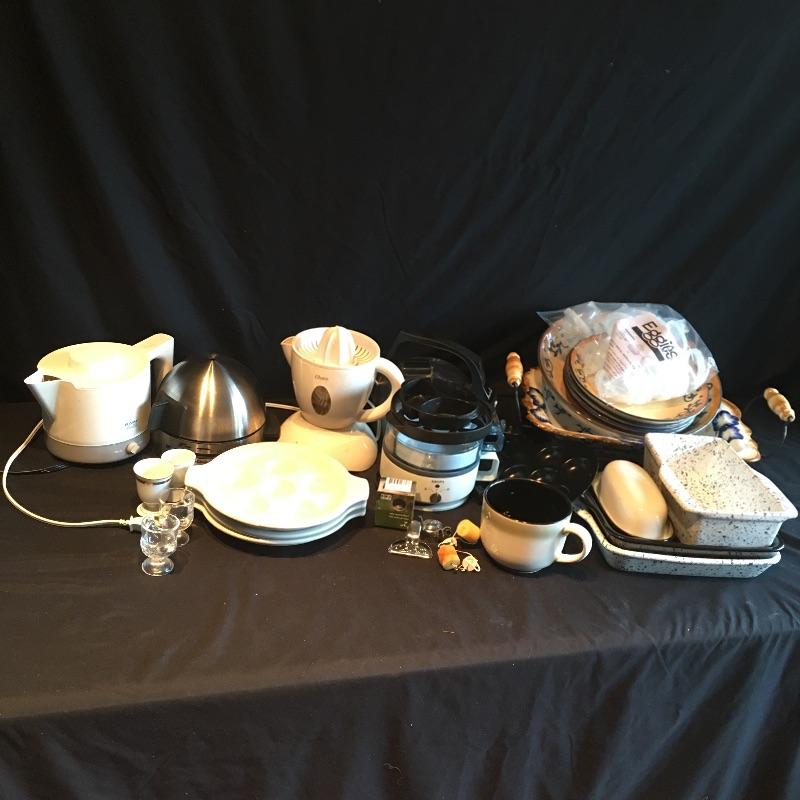 This lot of breakfast essentials includes includes Krups and Chefs Choice egg cooker, Oster juicer, Rival and Russell Hobbs kettles, three Dr Douglas Wonder Baker pieces, three Hall egg plates, Temp-Tation serving dish with metal tray, tea strainers, large serving bowl and four bowls by Lidia and more. Cook yourself a fabulous breakfast with this array of breakfast essentials. All electric items powered on. Lidia serving bowl measures 13”D x 2.75” tall.