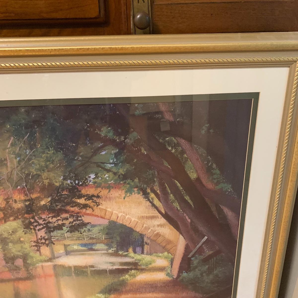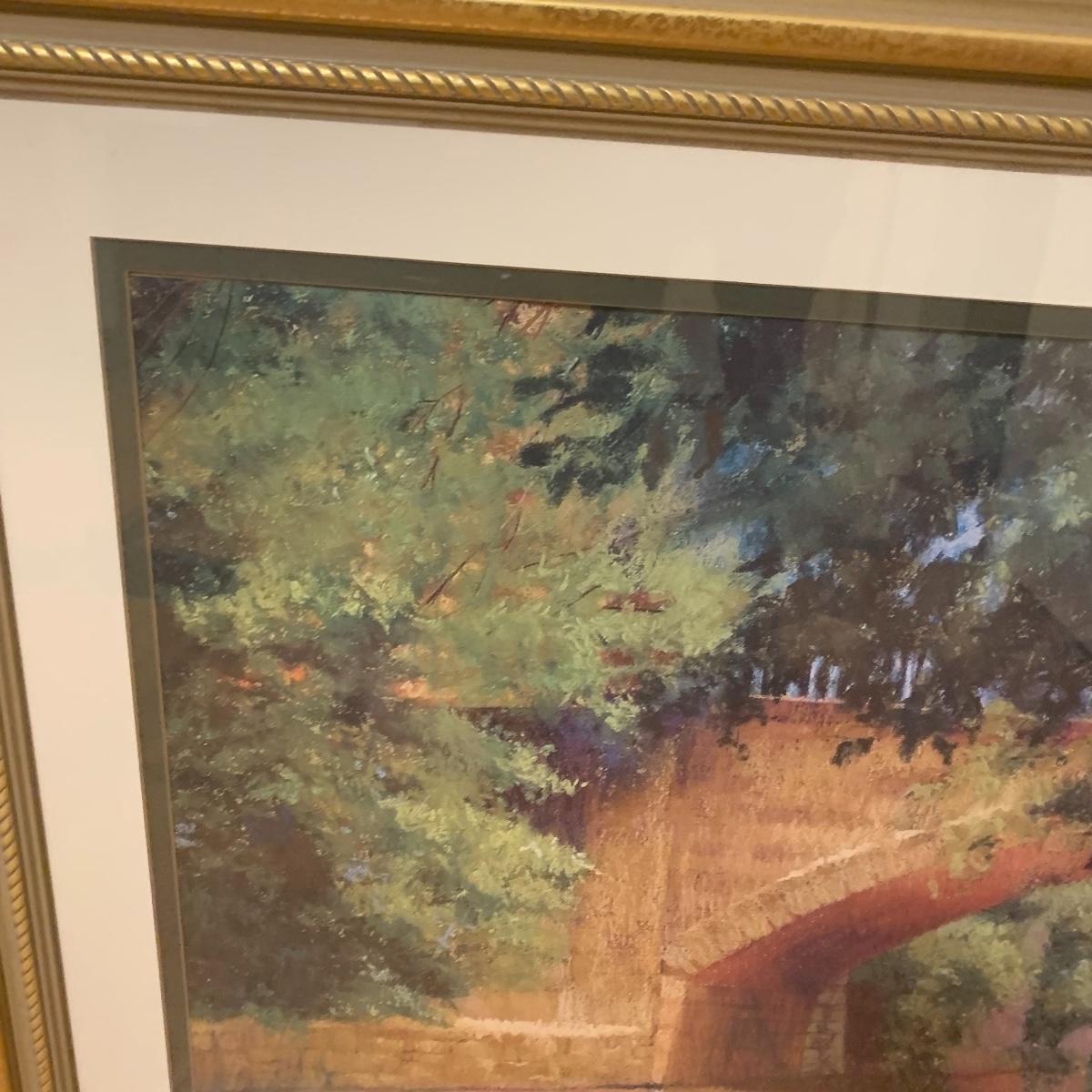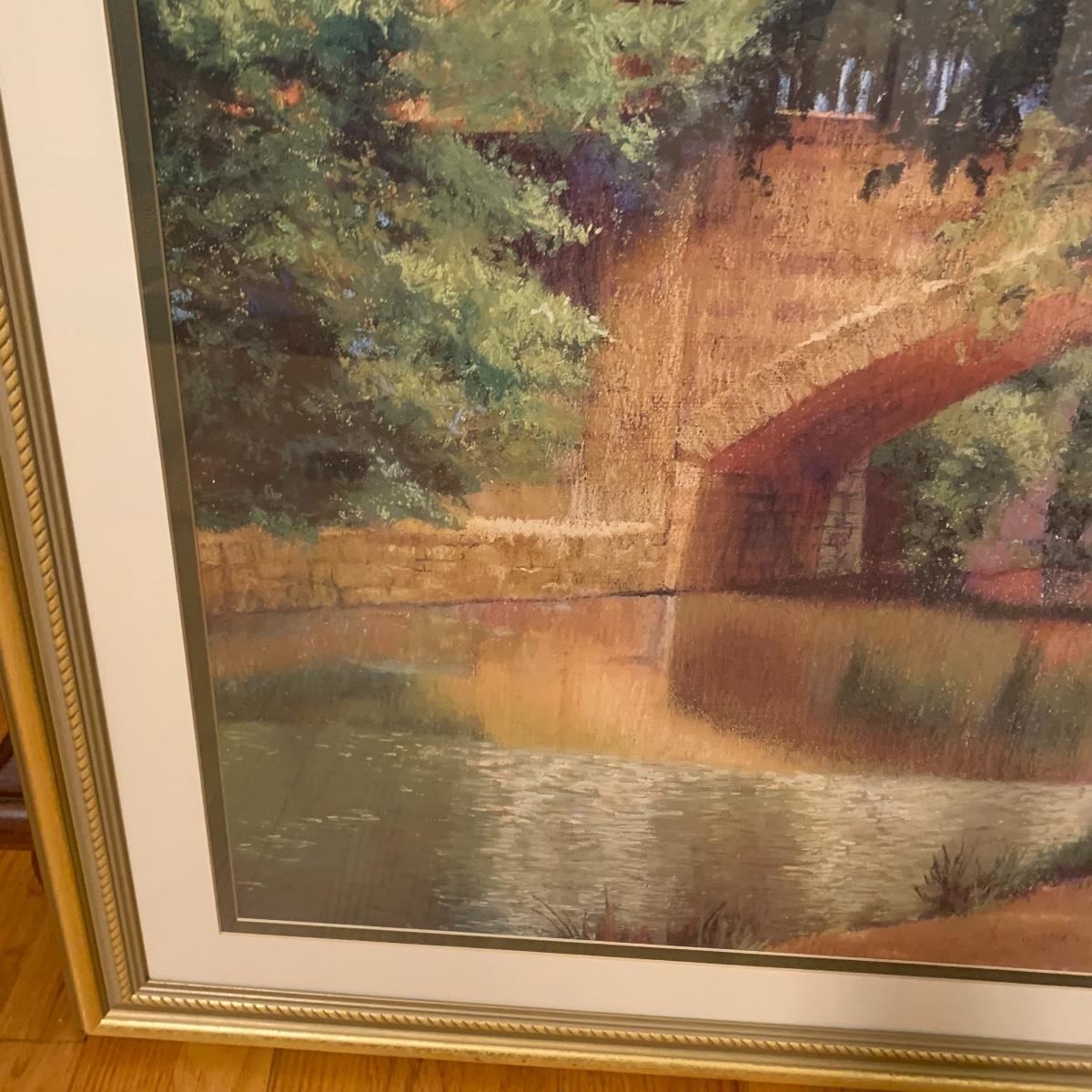 Adorn your home with this gorgeous print! This picture depicts an arched bridge and foot path with trees over hanging a beautiful river. The color texture and depth of this print really make it stand out. This piece appears to be pro framed and is housed in a gold colored frame featuring rope molding. It measures 42” X 32” and is in great shape.