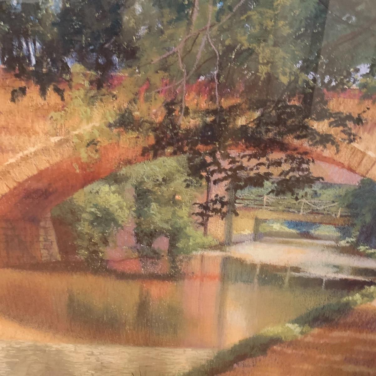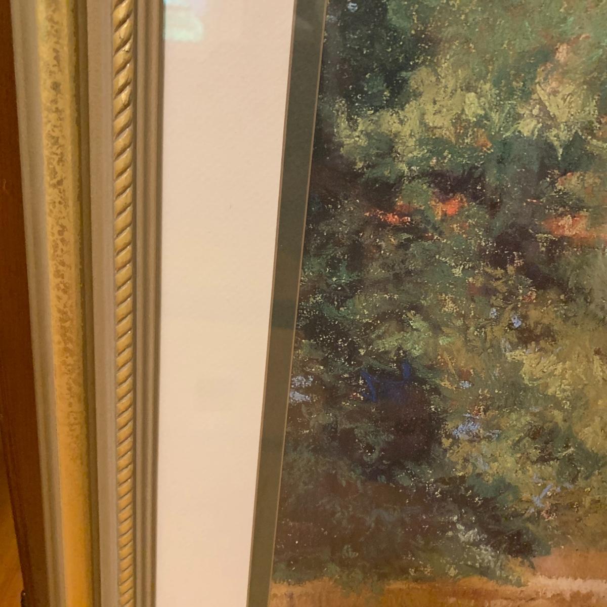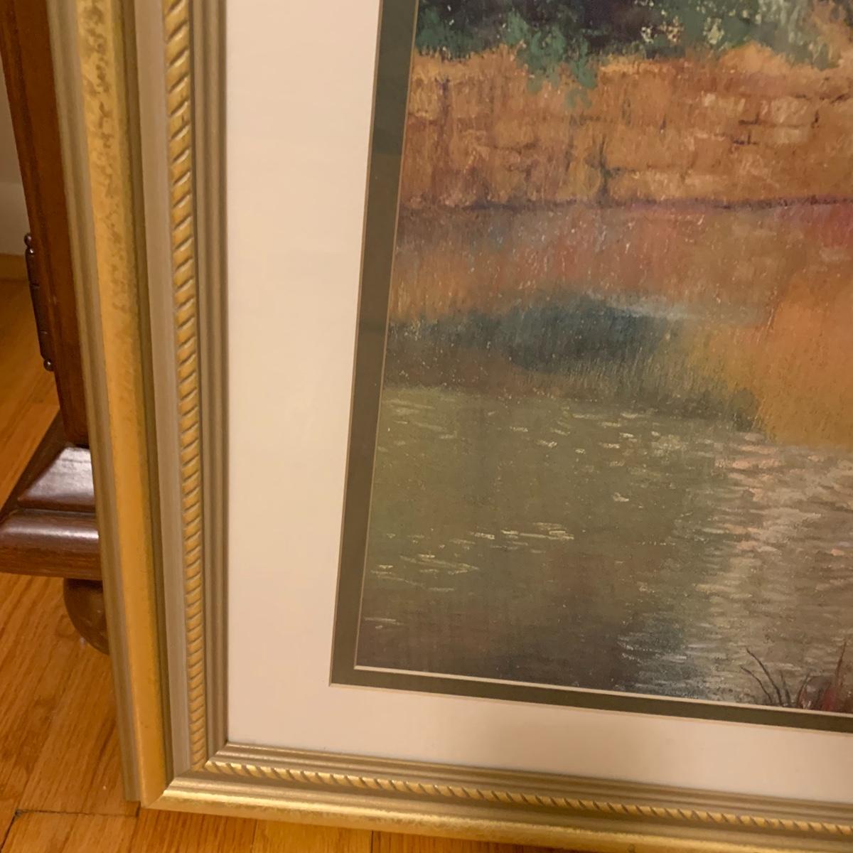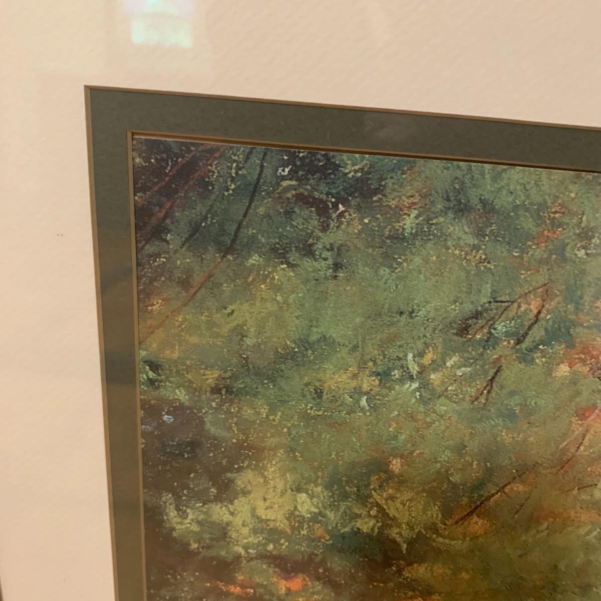 Adorn your home with this gorgeous print! This picture depicts an arched bridge and foot path with trees over hanging a beautiful river. The color texture and depth of this print really make it stand out. This piece appears to be pro framed and is housed in a gold colored frame featuring rope molding. It measures 42” X 32” and is in great shape.