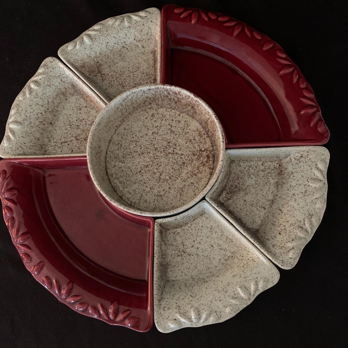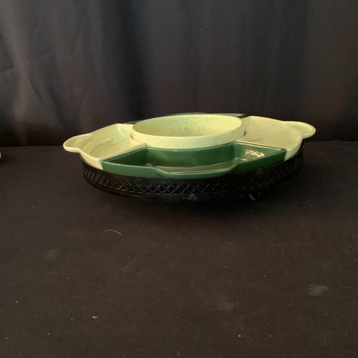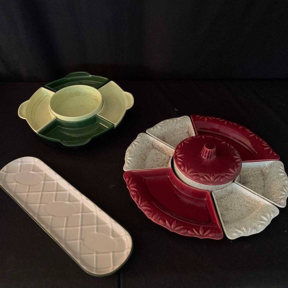 The guests at your next party will love this classic chip and dip set. This group includes a set of six tray that form a 16” circle (see pic). The manufacturer mark reads “Marsh 8003 Calif”. The next item in this lot is a beautiful set that includes four treys that form a circle around lidded dip pot. This set comes on its own revolving 12” carousel. The last is a 16” bread tray. All these items are in great condition.