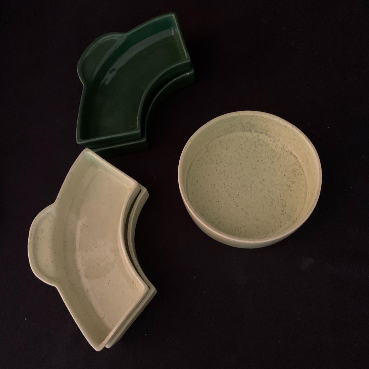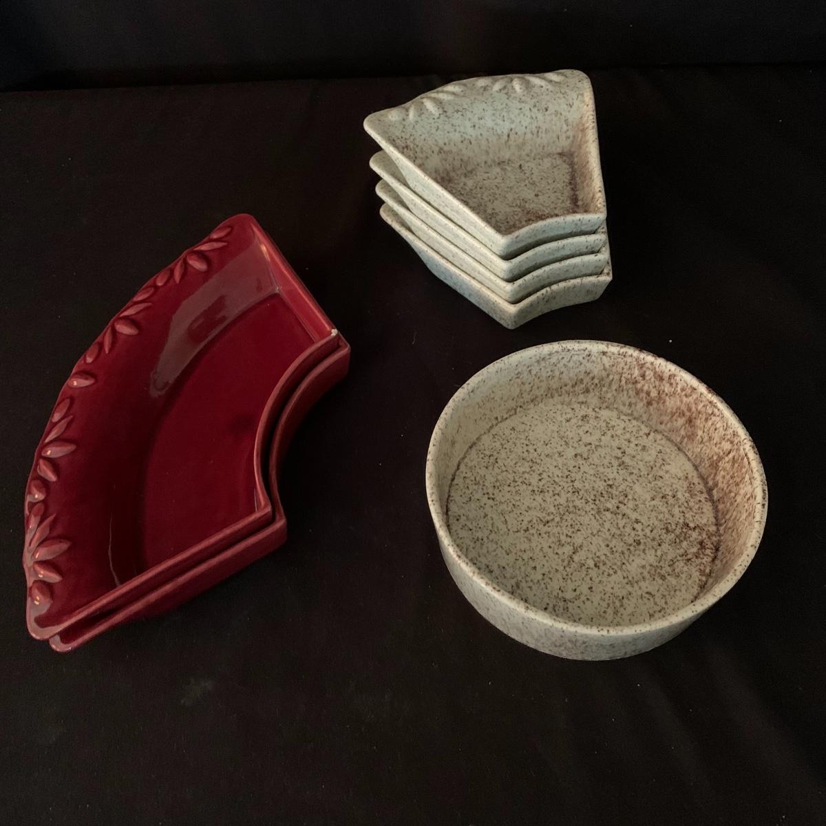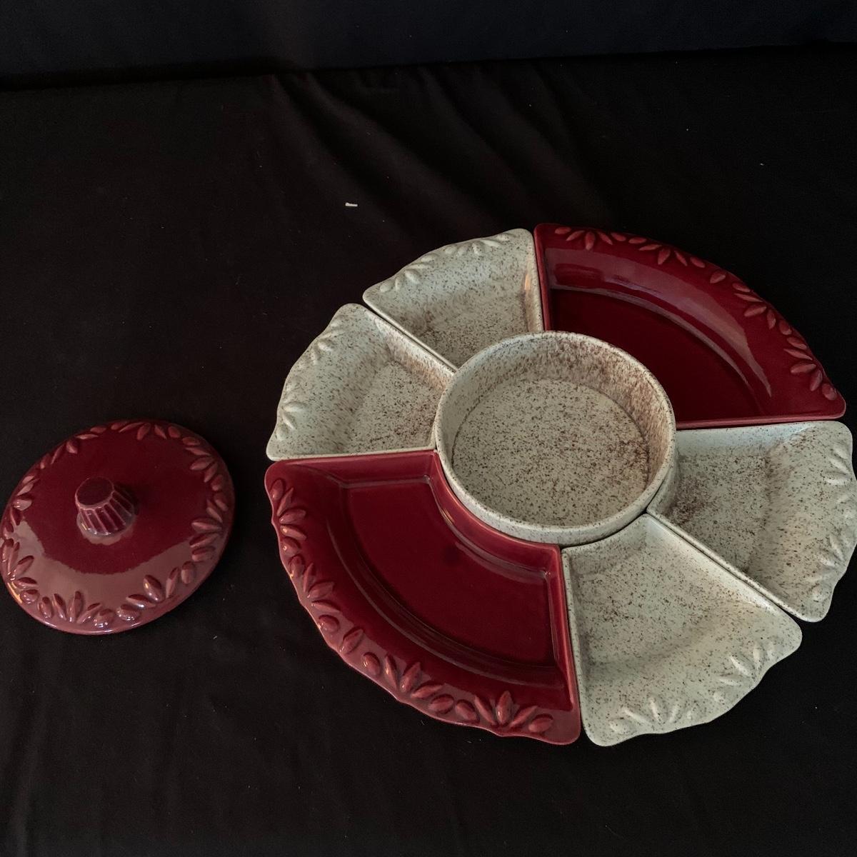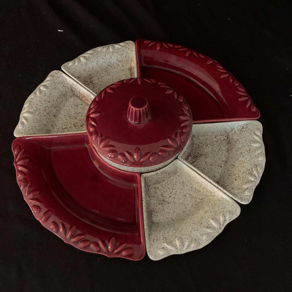 The guests at your next party will love this classic chip and dip set. This group includes a set of six tray that form a 16” circle (see pic). The manufacturer mark reads “Marsh 8003 Calif”. The next item in this lot is a beautiful set that includes four treys that form a circle around lidded dip pot. This set comes on its own revolving 12” carousel. The last is a 16” bread tray. All these items are in great condition.