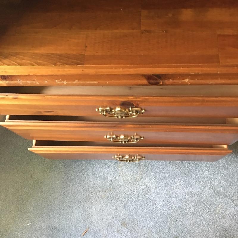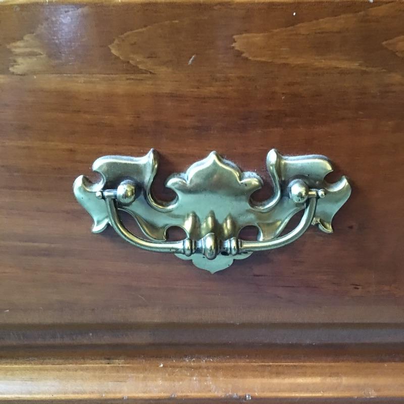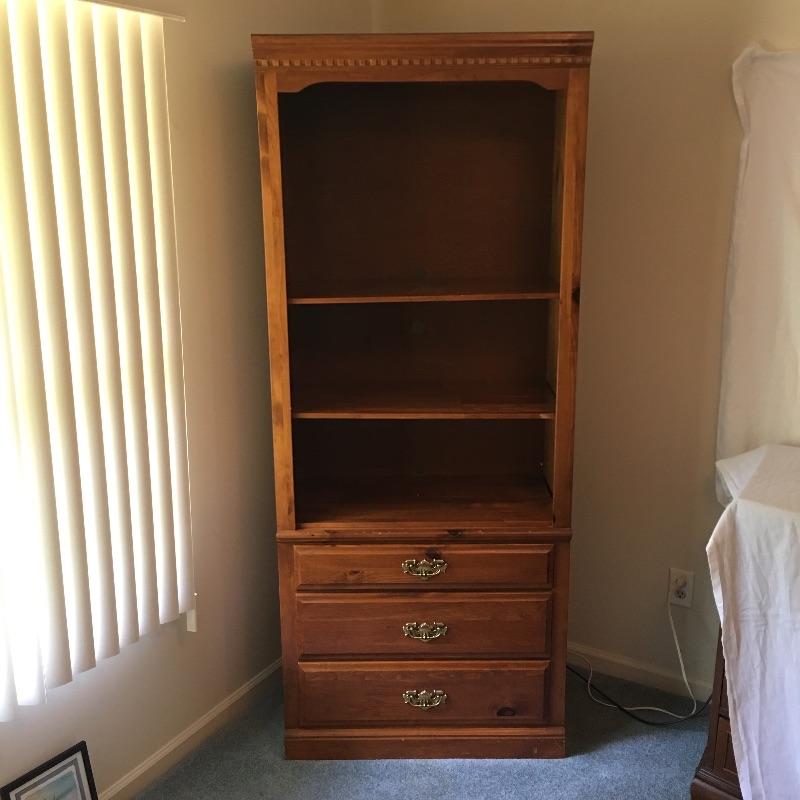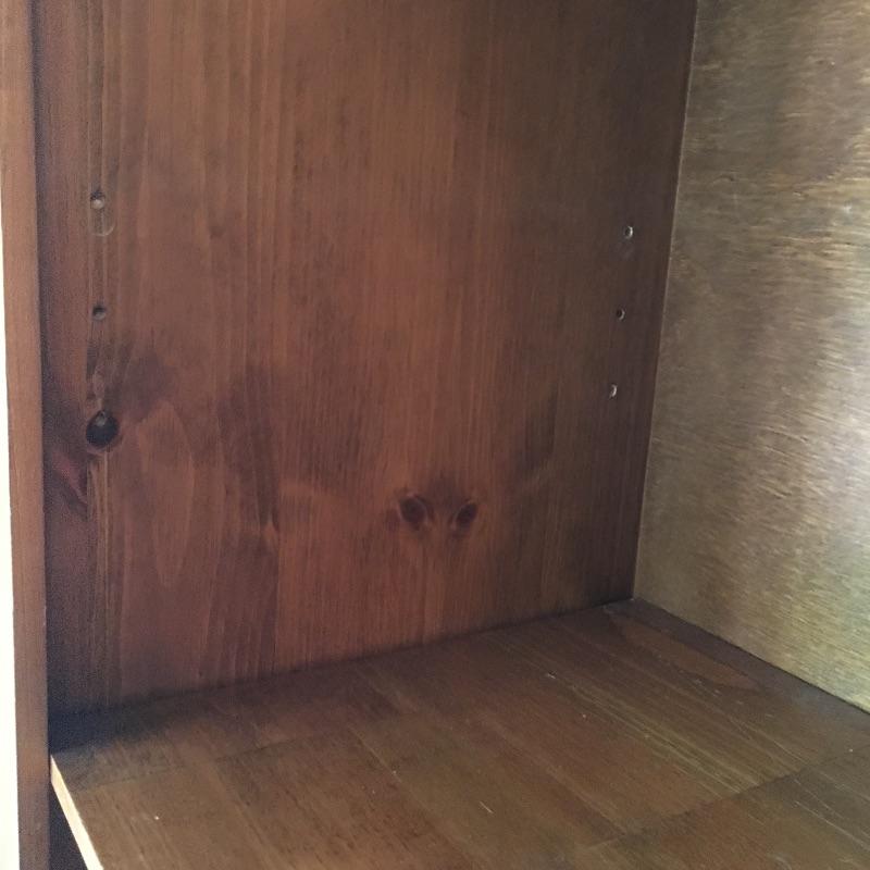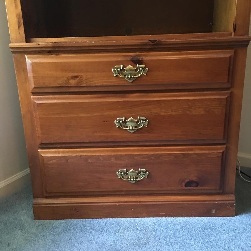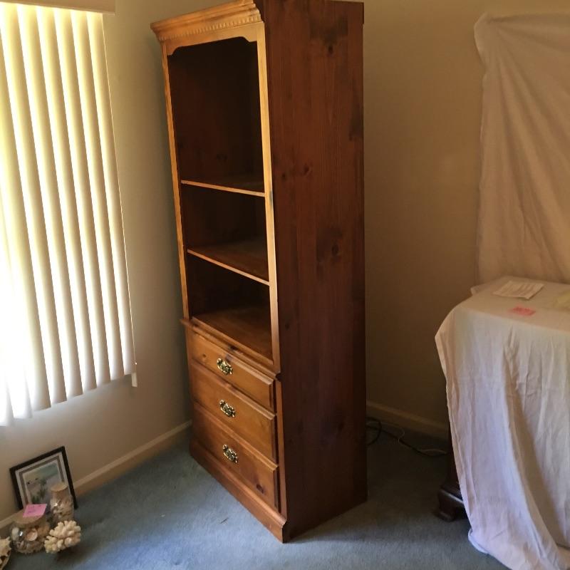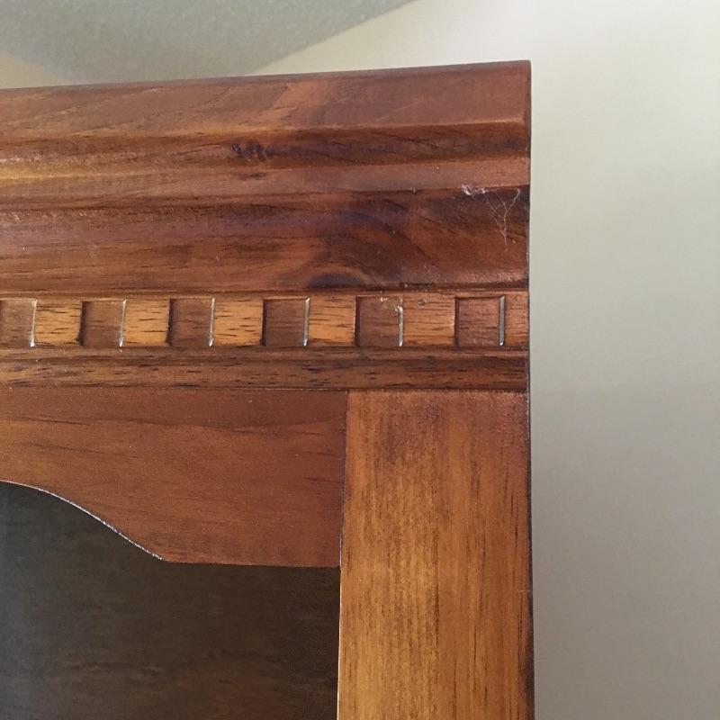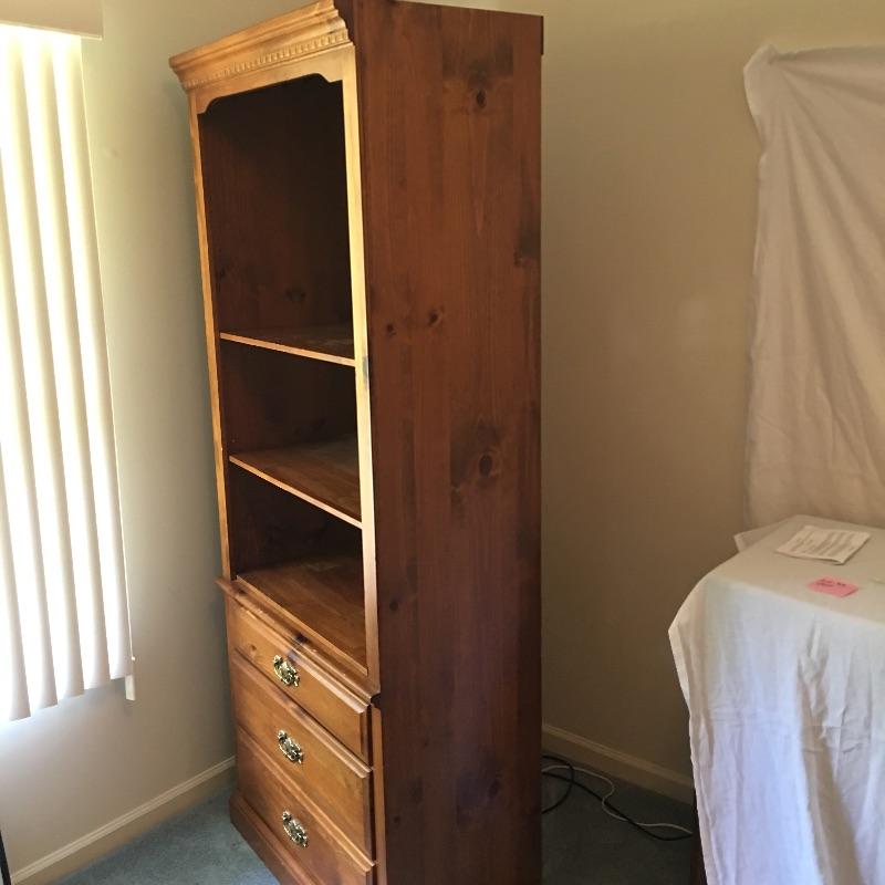 Display cabinet with three dovetailed drawers and three adjustable shelves. A great way to showcase your collectibles and store the things you don’t want seen. Item does have some minor scuff marks shown in images. Cabinet measures 16” x 32” x 78”. Bring help item is substantial.