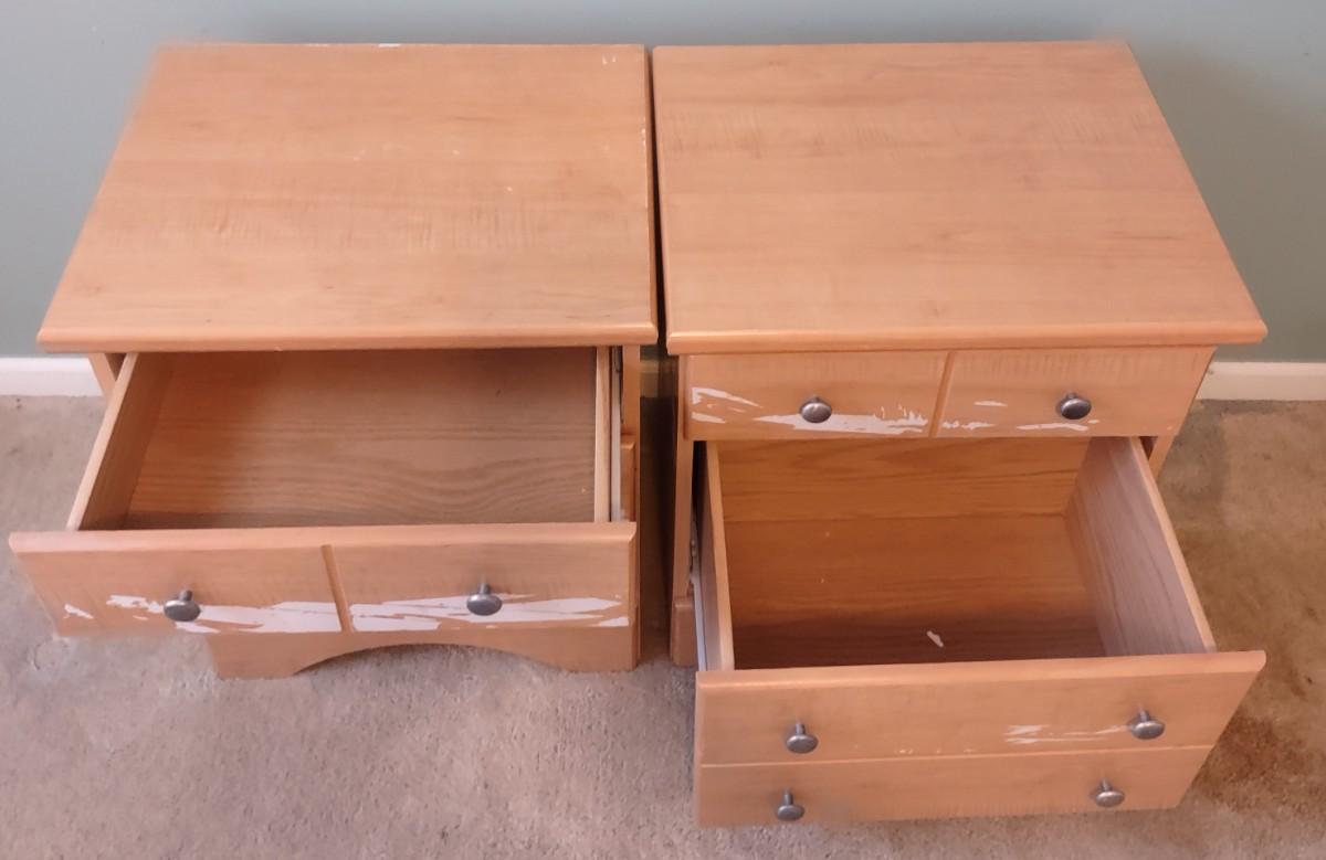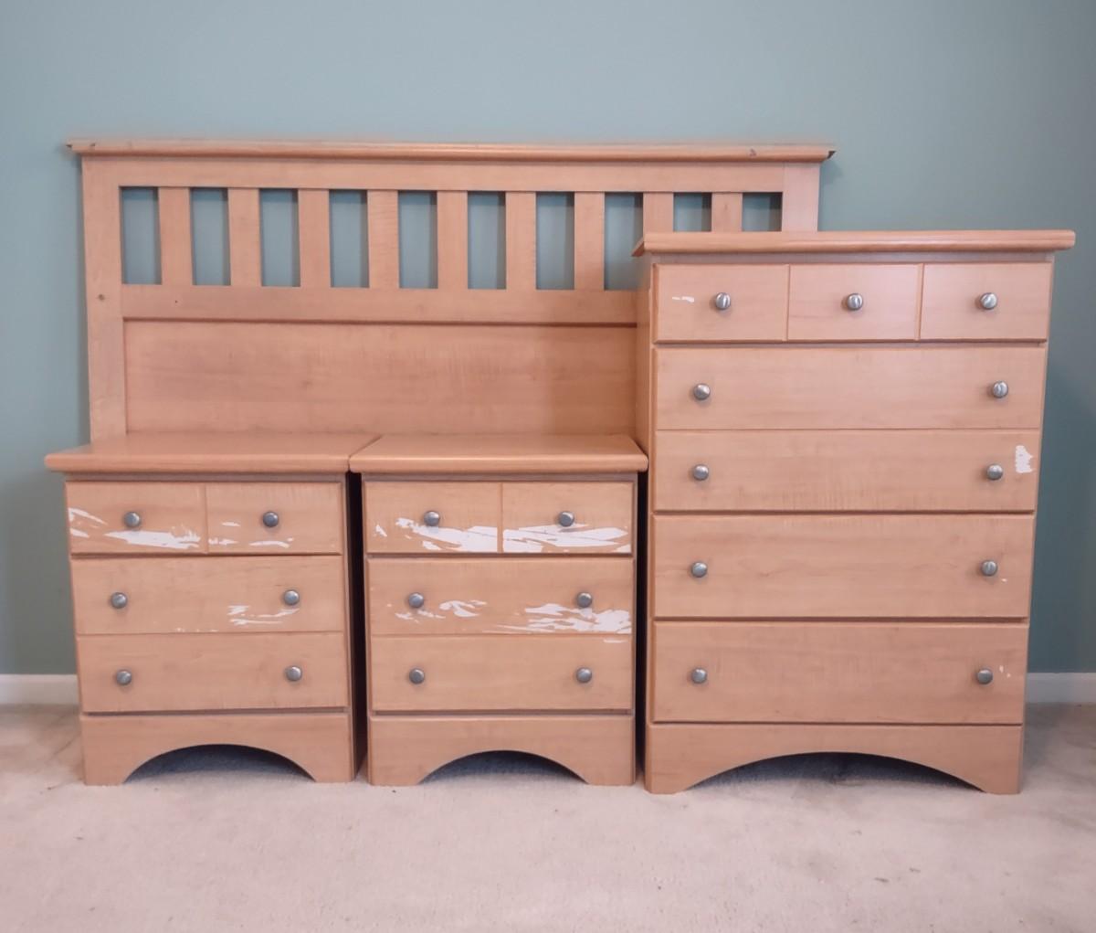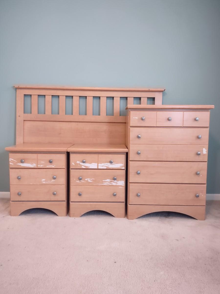 Good Bedroom Set For A Childs Room Or Simply A Restoration Project Dresser 29×18×14 Nightstands 21×17×25 Headboard 63×49. Please see all pictures as they are the best representation of the items. The pictures show condition, measurements if taken, and what is included in the lot. Due to the large amount that we photograph and the time frame, we are not always able to take measurements. All items unless noted, are pre-owned and have been used. If you purchased furniture, you must bring help. We do not allow one person to carry large furniture out on their own. Bring help, tools and a truck for the safety of our client’s homes, and your personal safety. Company policy. Thank you.