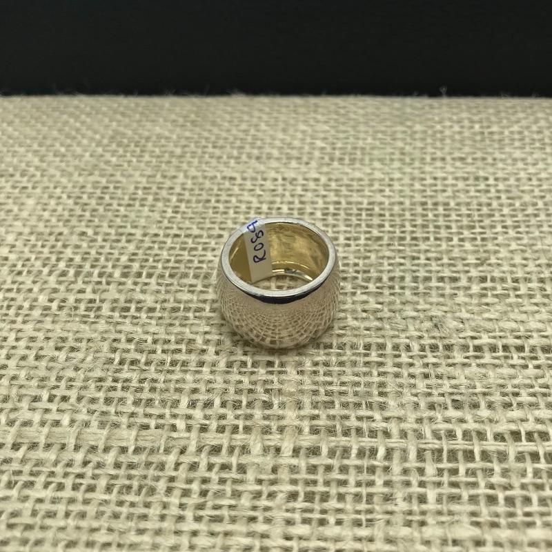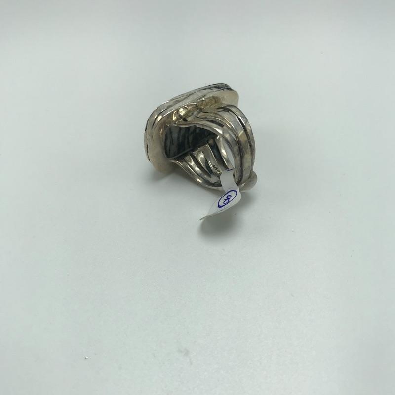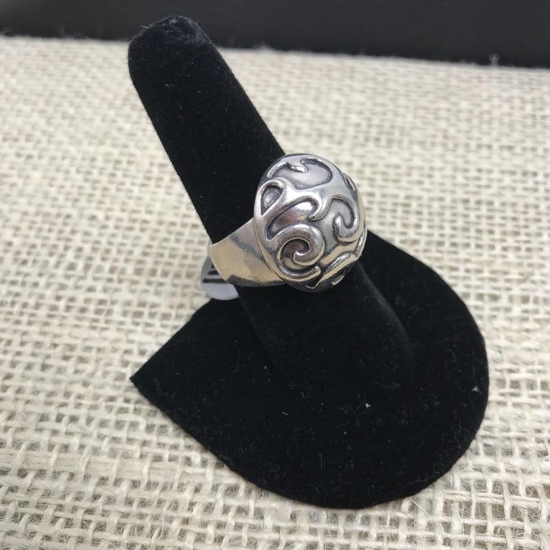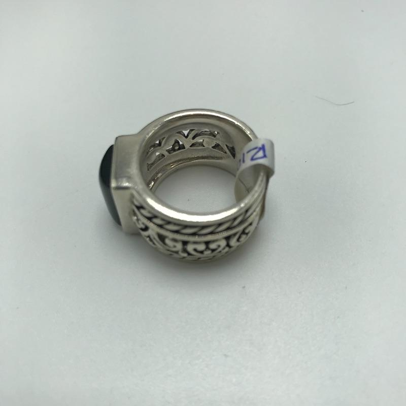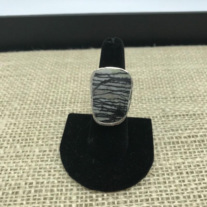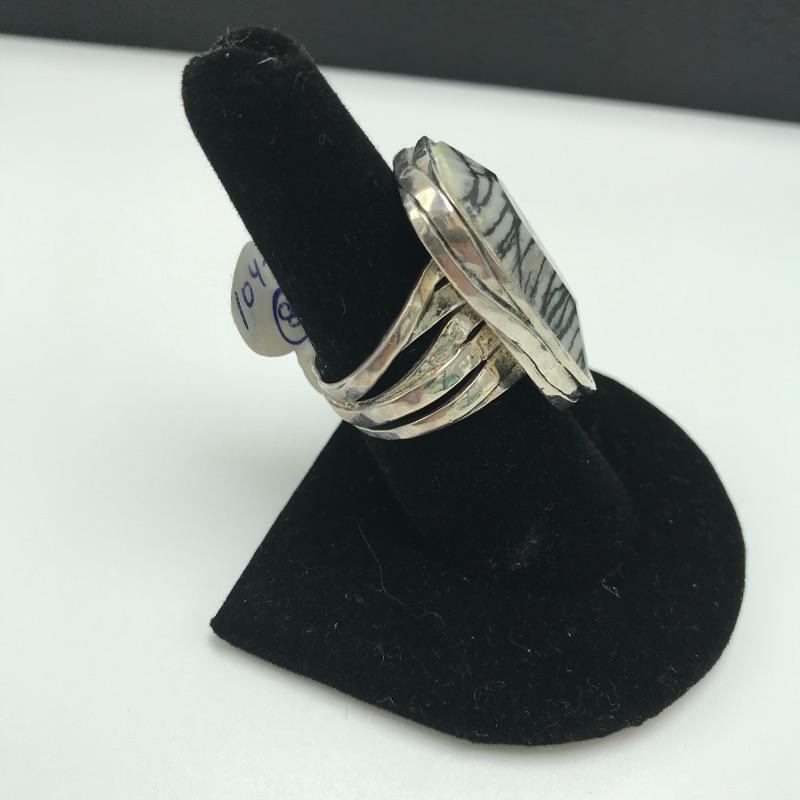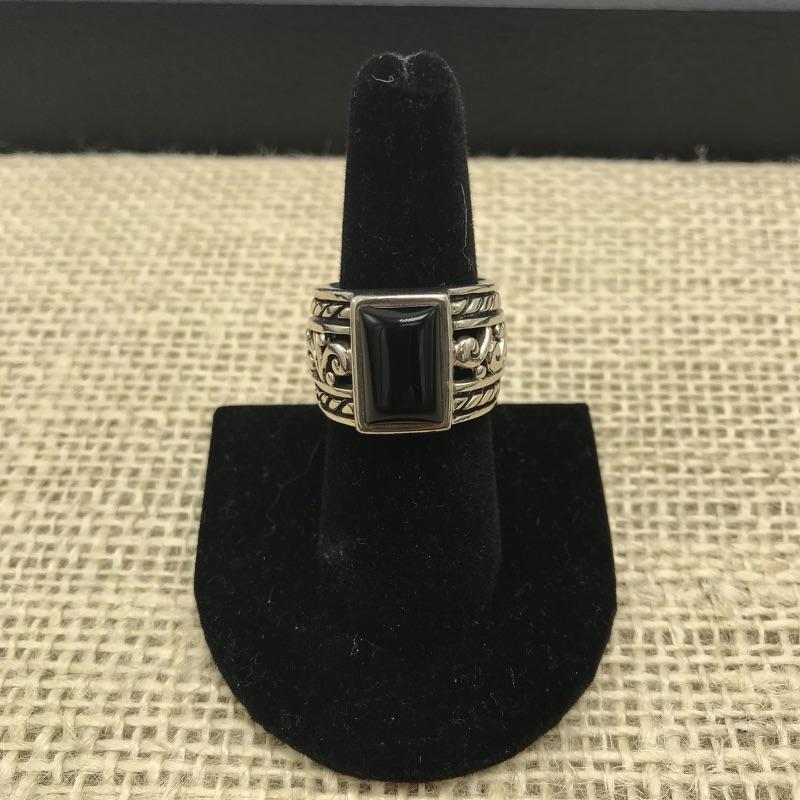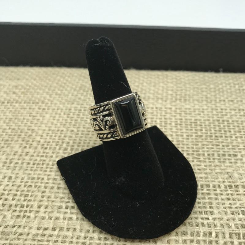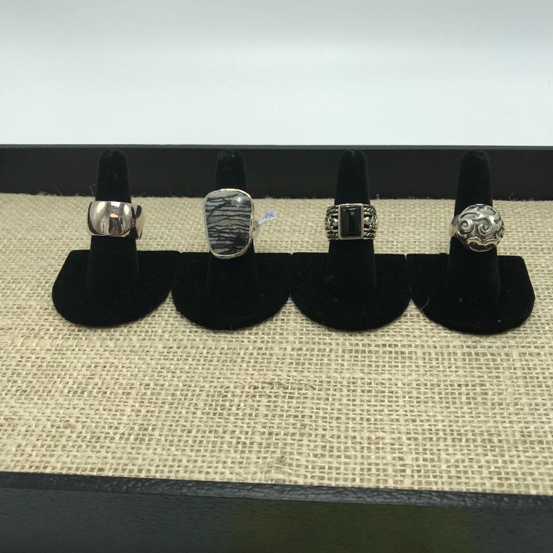 Four statement Sterling Silver rings sized 8 on their tags, all seem just slightly larger. First pictured is a artistic sphere shaped ring, next a large sterling cuff ring. Next pictured is a large black onyx with a thick sterling band. Last, but not least, an abstract ring featuring a large agate stone with sterling bands. See photos.