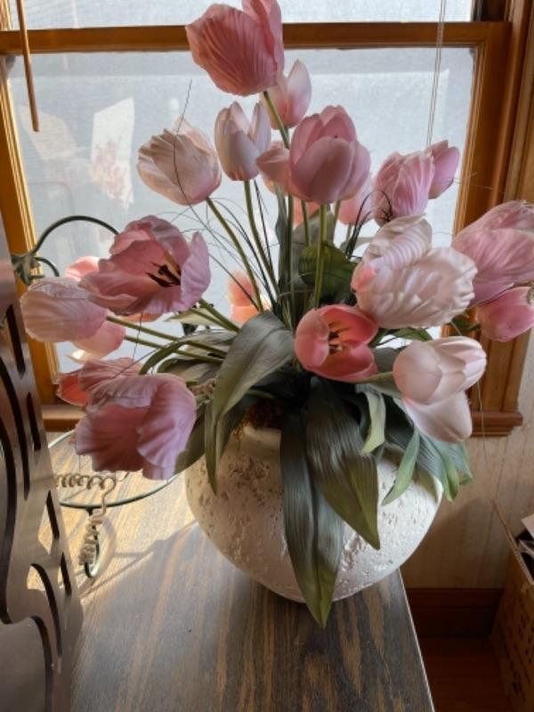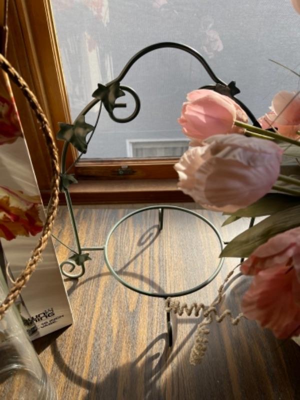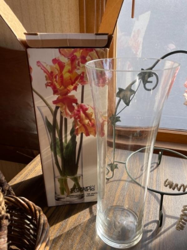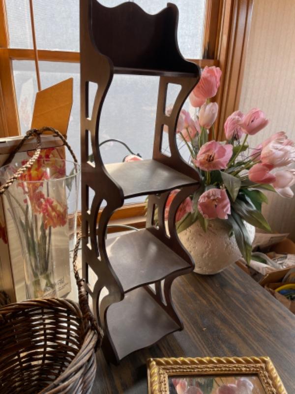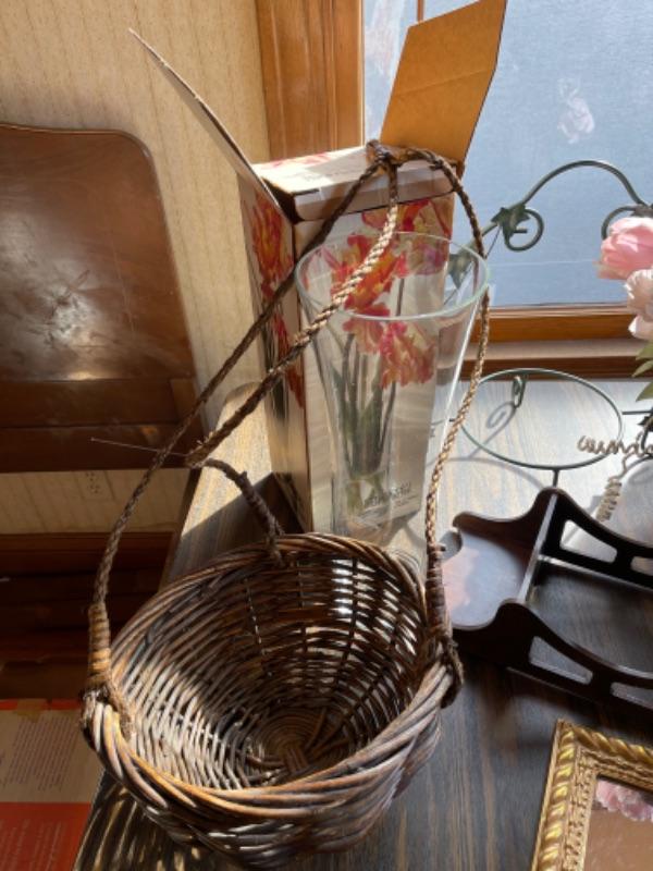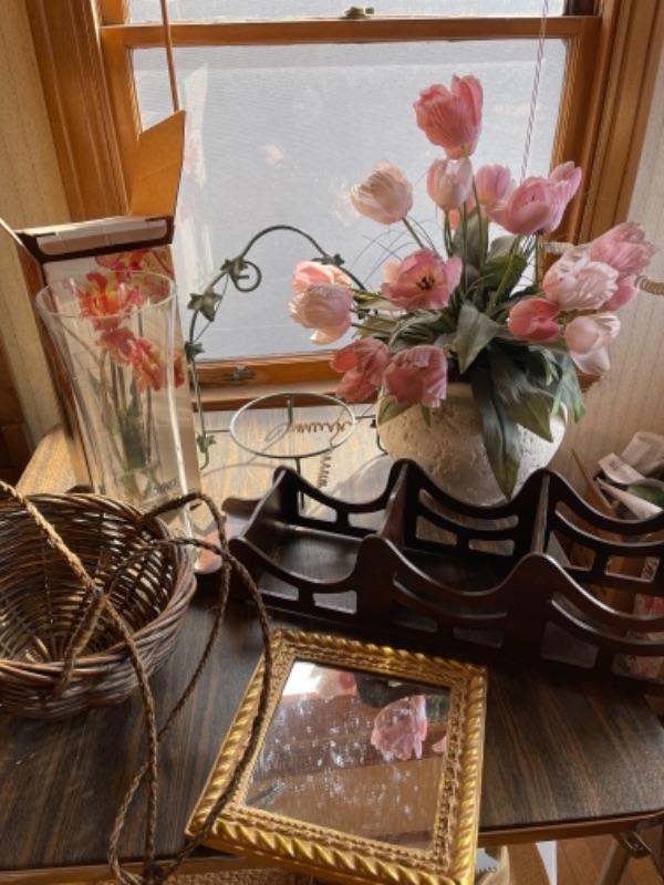 Lot 103. Framed mirror, hanging planter basket, knick knack shelf planter stand, large 16” glass vase, ceramic planter with faux tulips--Was $20 - - Now $10
