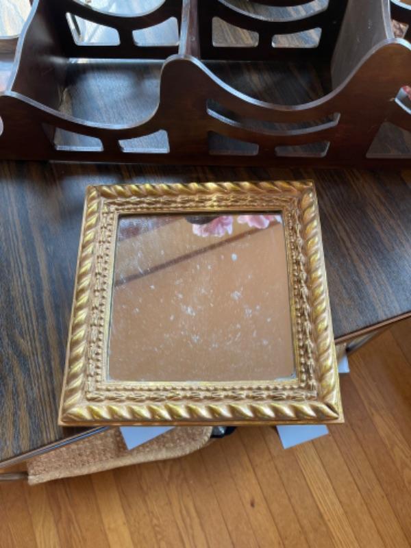 Lot 103. Framed mirror, hanging planter basket, knick knack shelf planter stand, large 16” glass vase, ceramic planter with faux tulips--$10