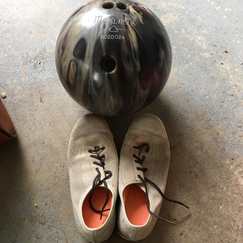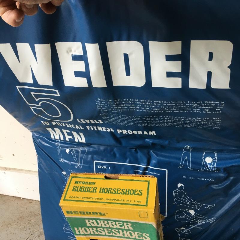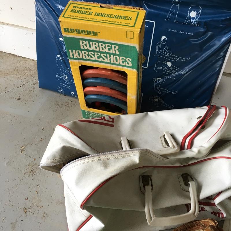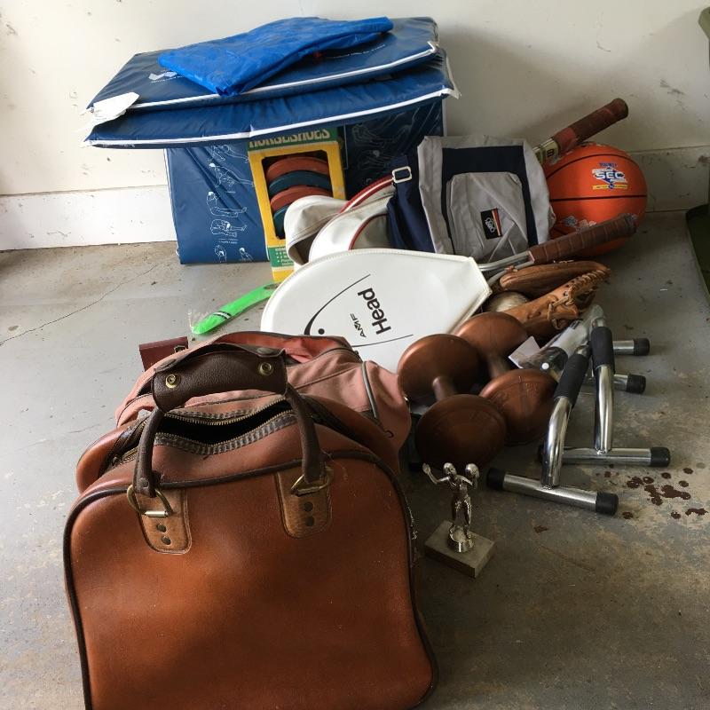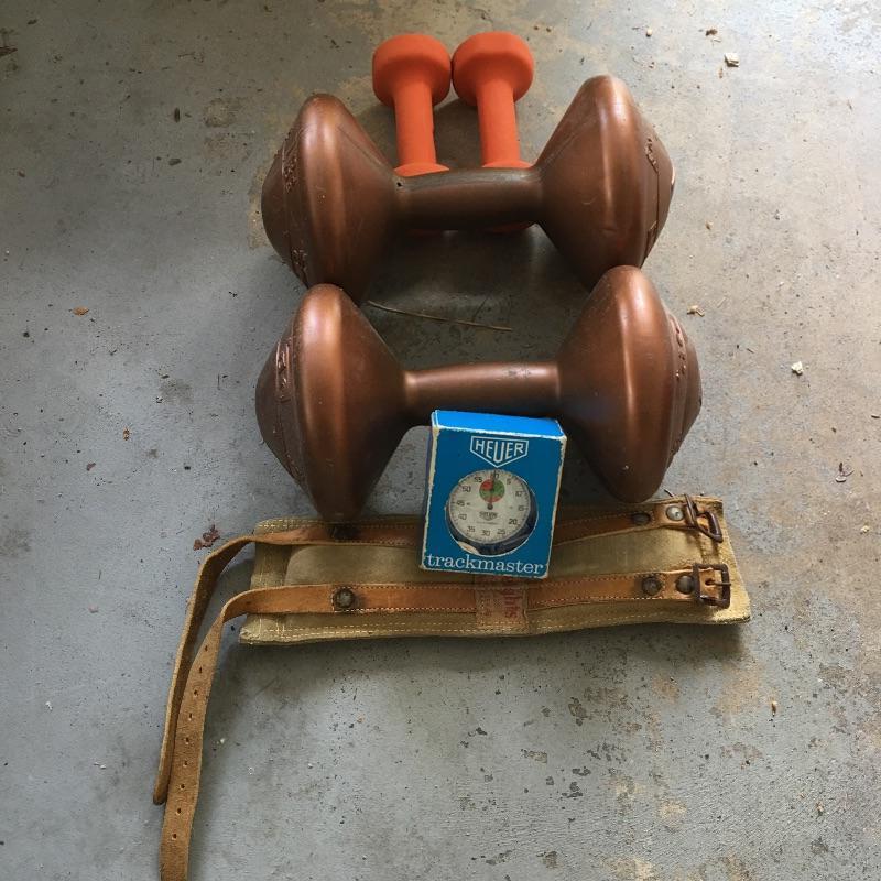 Heuer stopwatch and fitness essentials. Lot includes Heuer 8047 blue stopwatch in box, dumbbells, bowling balls and shoes in size six and twelve, rubber horseshoes, exercise mat, push up stands, tennis racquets and more. Get into shape this spring with this great lot.