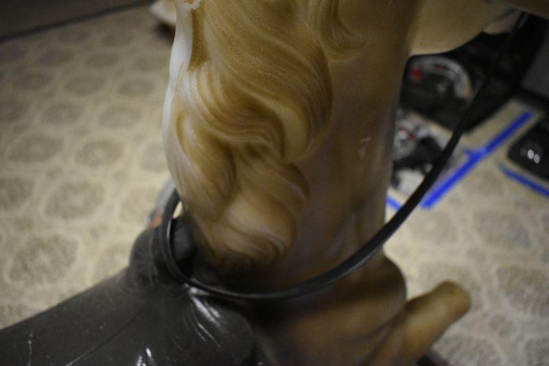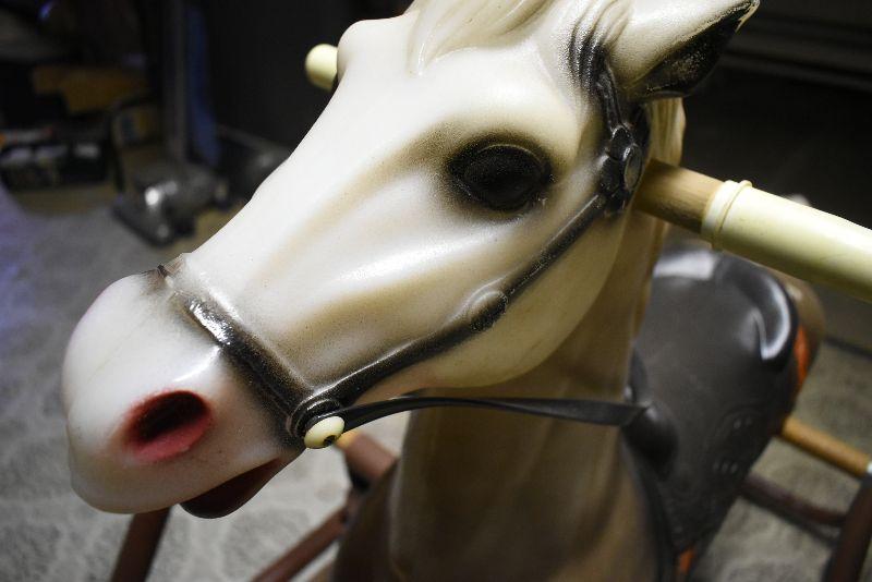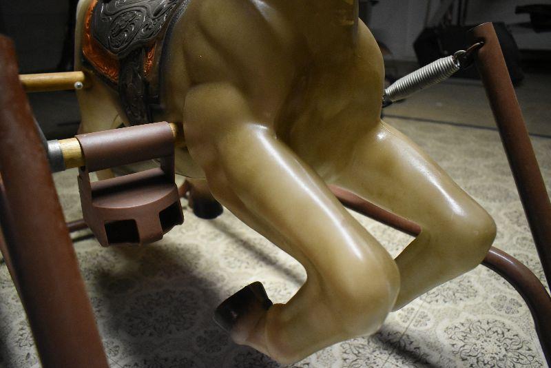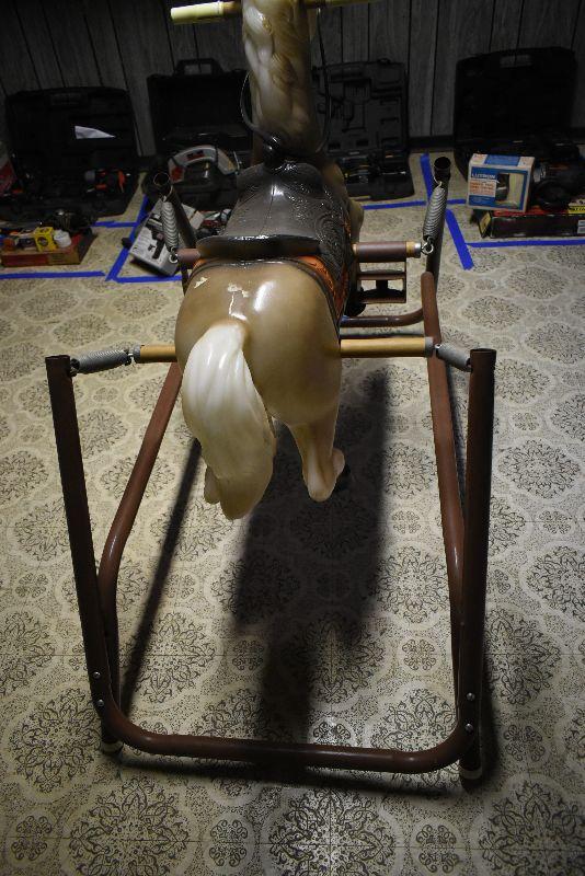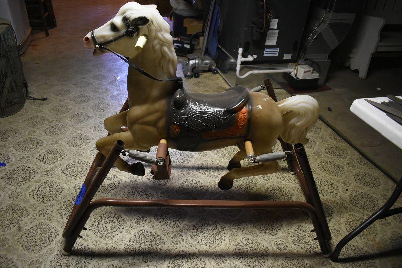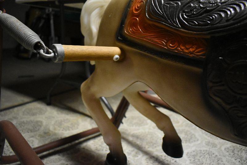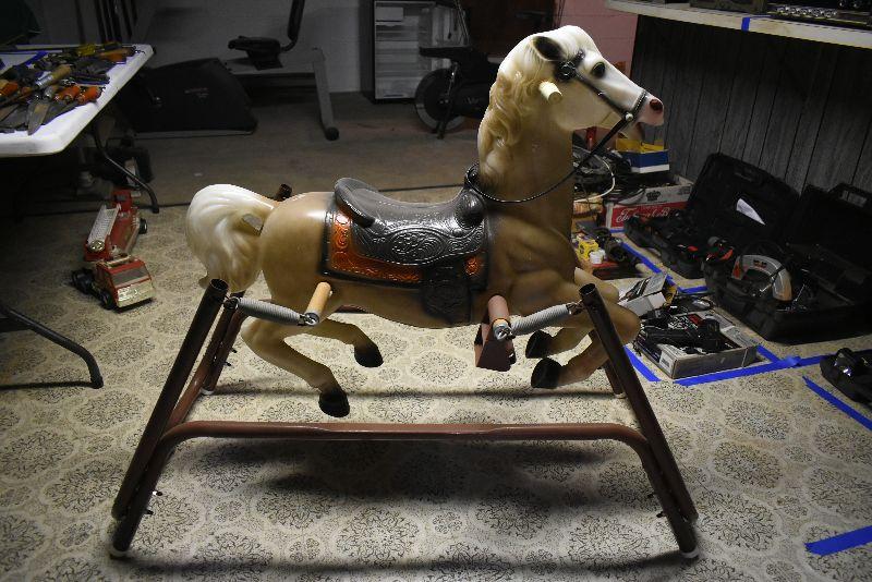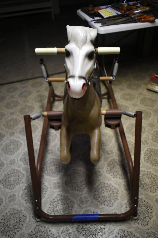Vintage hobby horse, metal frame. Horse is in good condition, only flaw is the plastic on handles is split. Springs are good. Bring help to move from second floor.