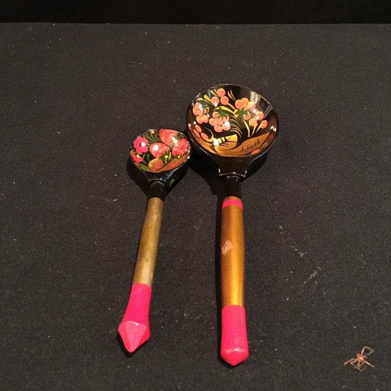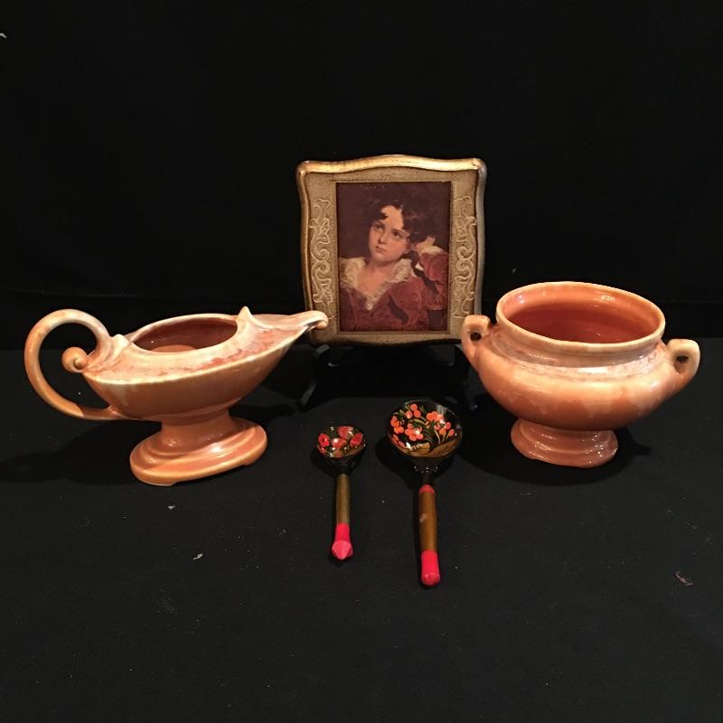 This selection of home decor will bring a warmth into your home with its soothing colors. Lot includes a felt like cloth lined wooden Japanese box, two decorative painted spoons and two unmarked ceramic urns. Box measures 6” x 6” x 1.75”.
