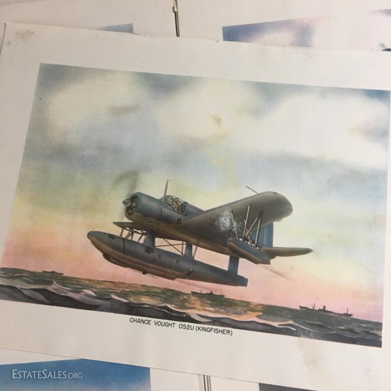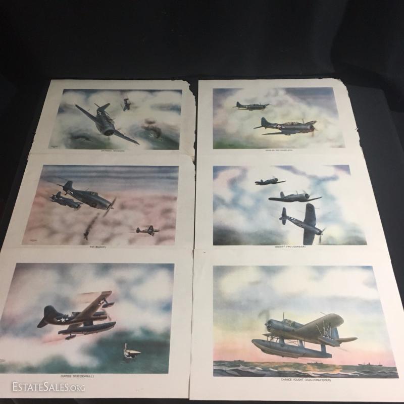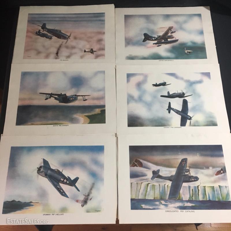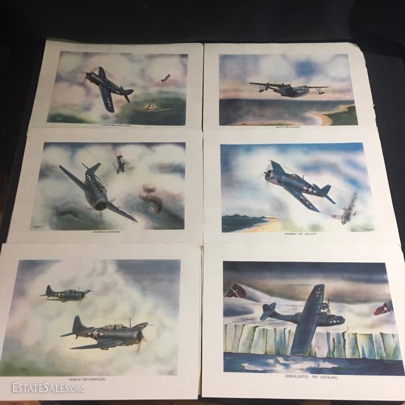 Nineteen lithographs of WW II airplanes by Irvin Holcombe. Some are doubles. Some are damaged. All measure 15"l x 11"w.