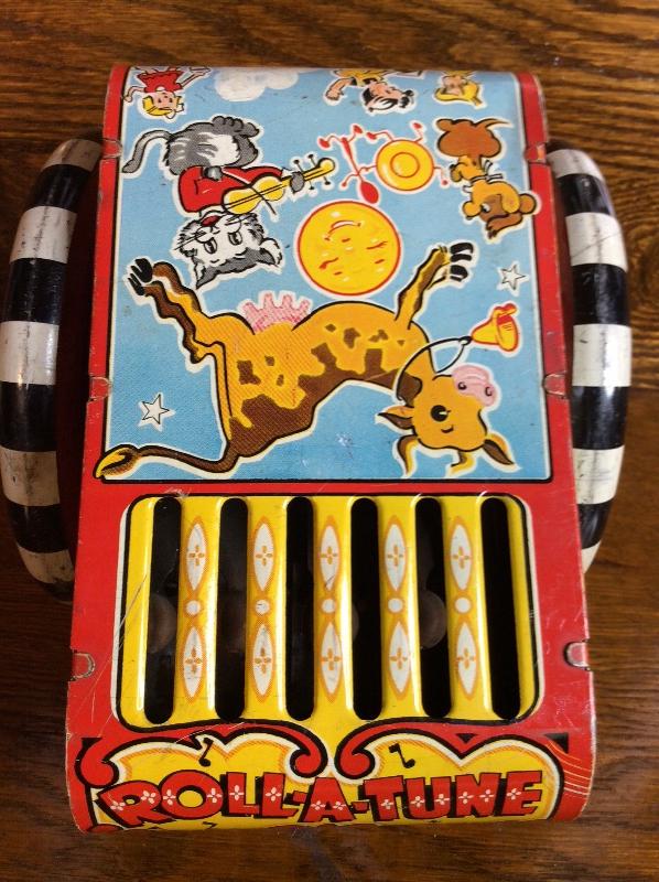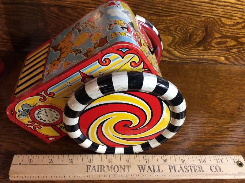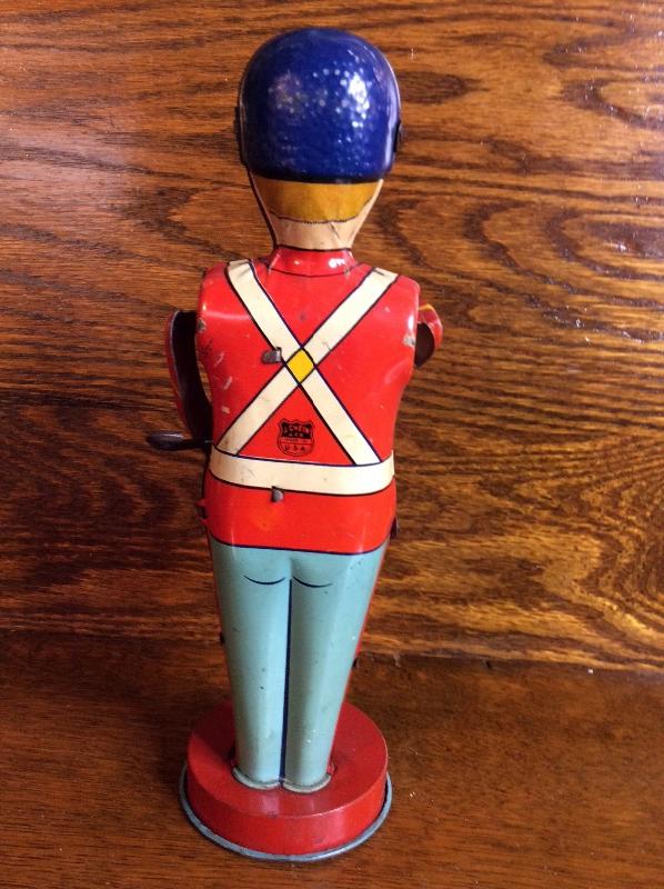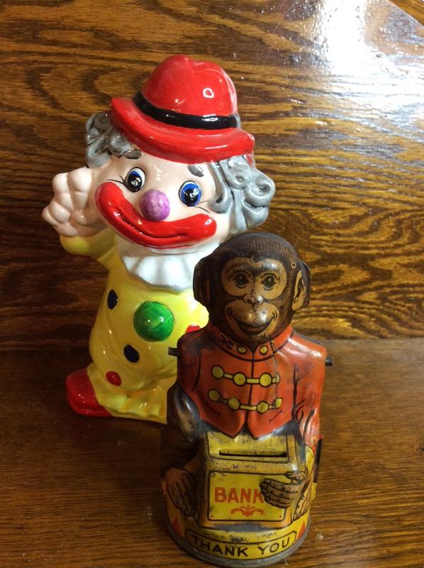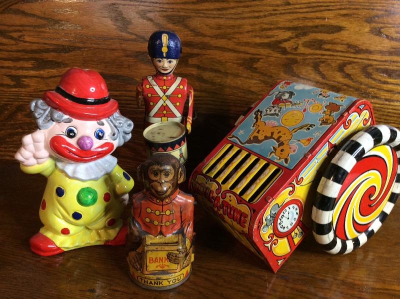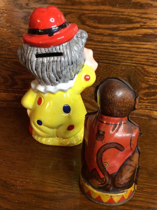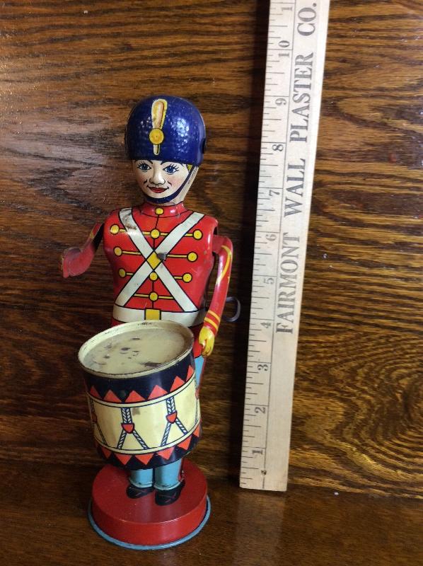 Vintage metal, wind up toys by Cheinco Company. Soldier works, monkey is missing arms, Roll a Tune plays a tune and the ceramic clown is a bank. Please see measurements, and all pictures for condition. Thank you for looking and have fun bidding. Db