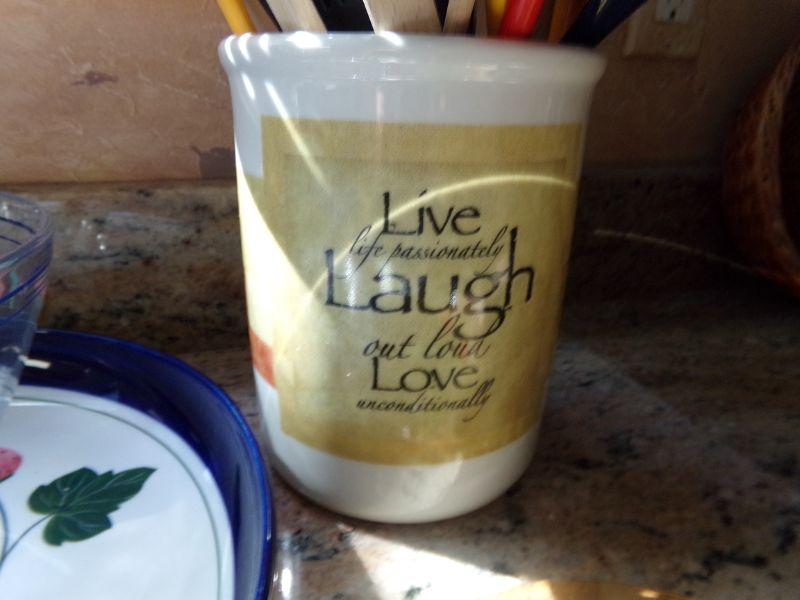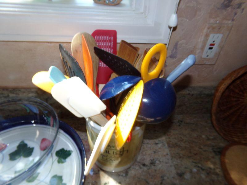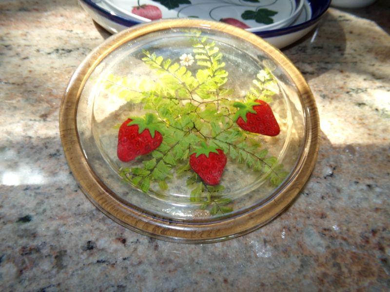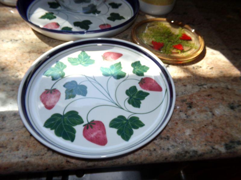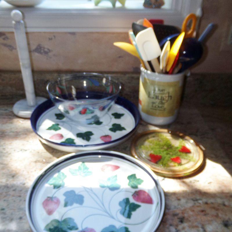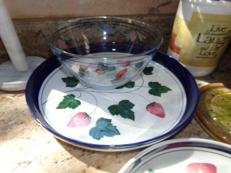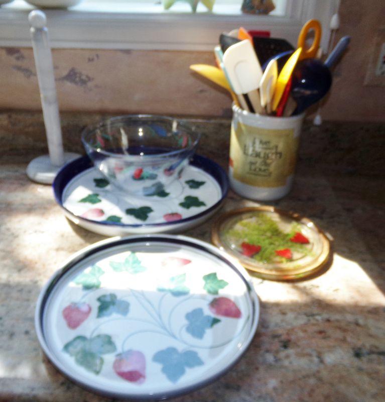 2 DANSK STRAWBERRY THEMED SERVING TRAYS, SERVING BOWL, HOT PAD, MANY UTENSILS IN HOLDER AND MARBLE PAPER TOWEL HOLDER