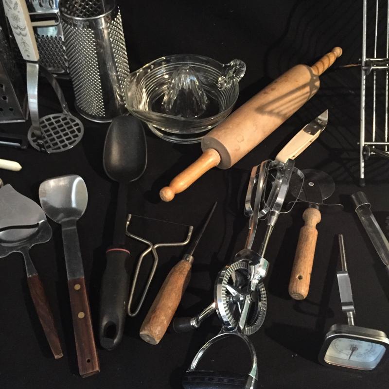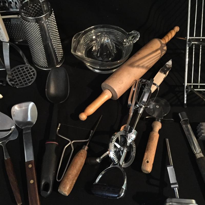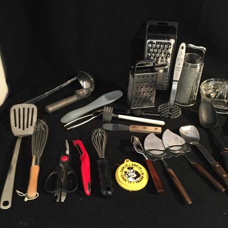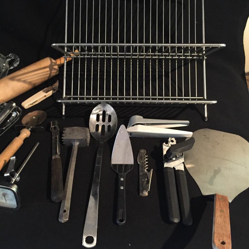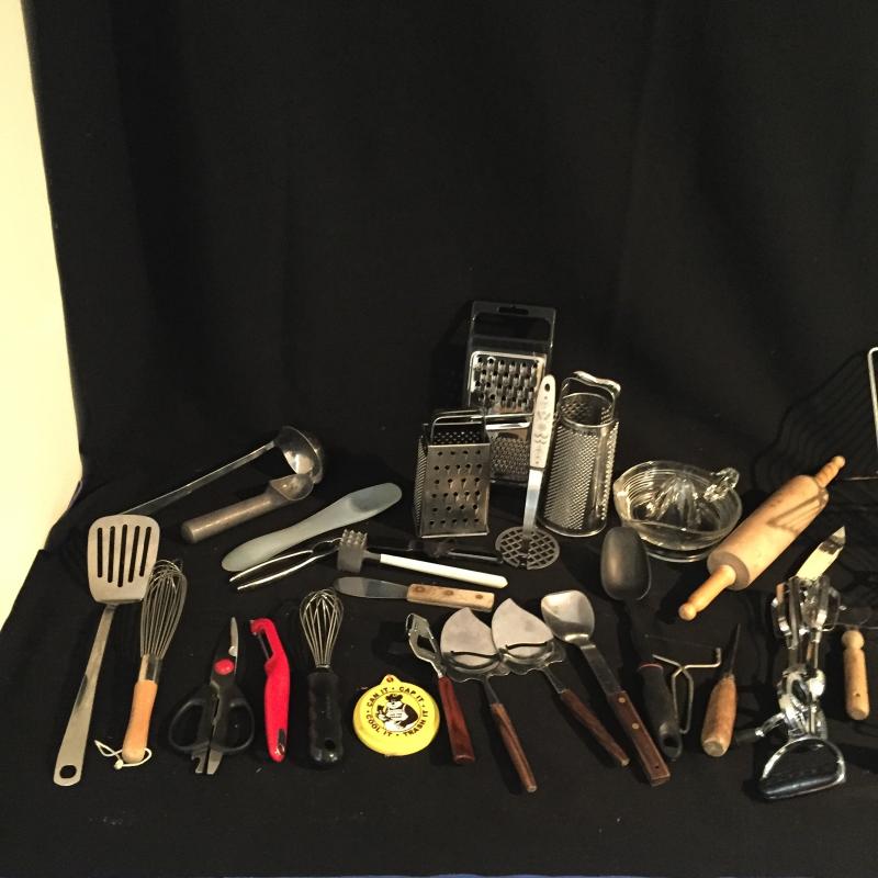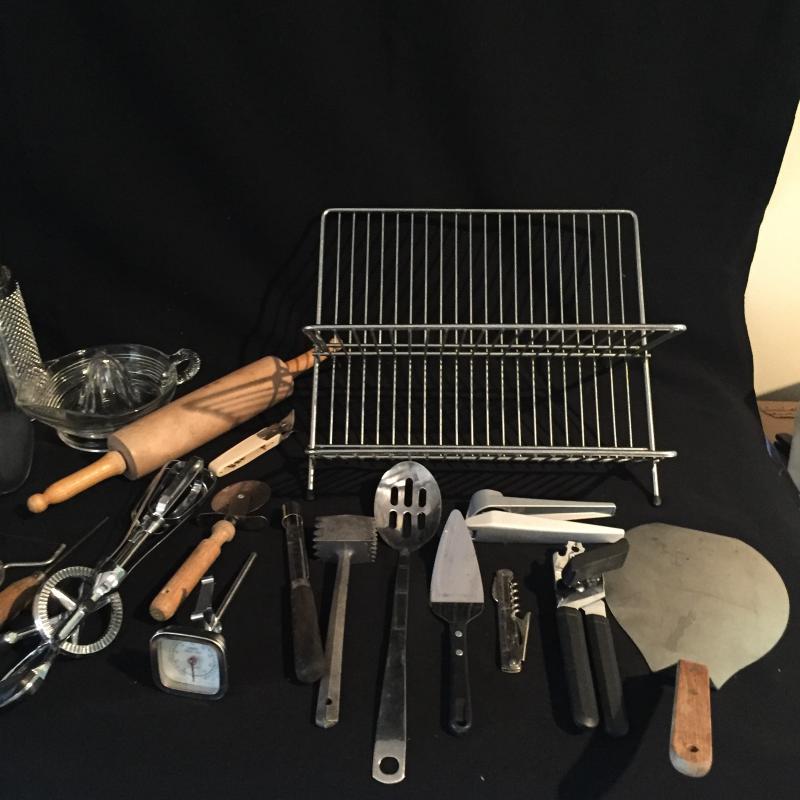 Large Collection of Kitchen Utensils. Graters,Hand Mixer,Pizza Cutter,Roller,Dish Dryer and More.