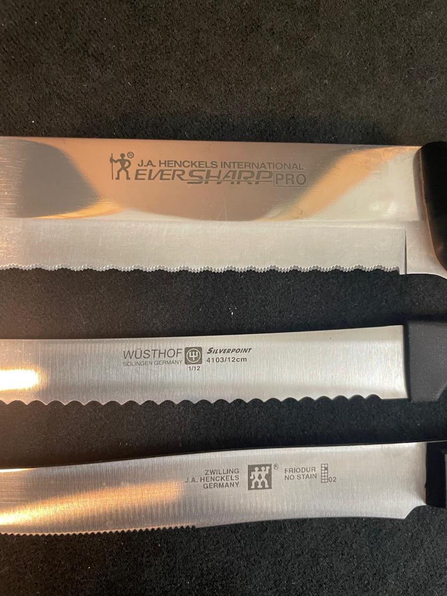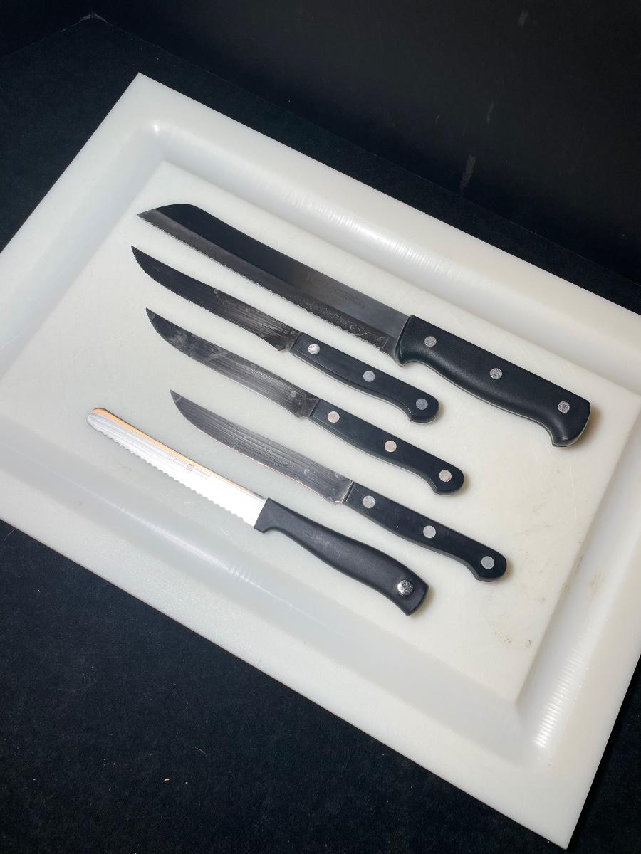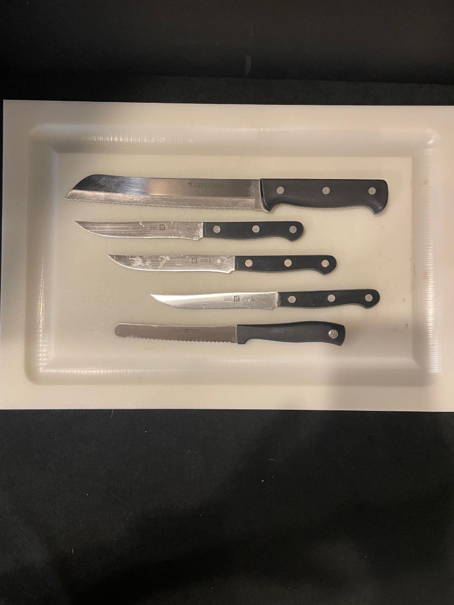 Incudes 1 Henckels Ever Sharp Pro bread knife, 3 Henckels steak knives, 1 wustof knife and a polycarbonate cutting board.