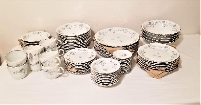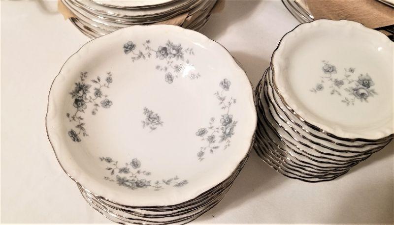 Large vintage set of Johann Haviland (Bavaria) dinnerware - you get everything you see here. 8 dinner plates, 7 salad plates, 12 soup bowls, 8 bread/butter plates, 12 butter pats, 8 small bowls, 8 cups/saucers, 5 serving bowls. Blue floral pattern with silver rim. NOTE: These cannot go in the dishwasher or microwave.