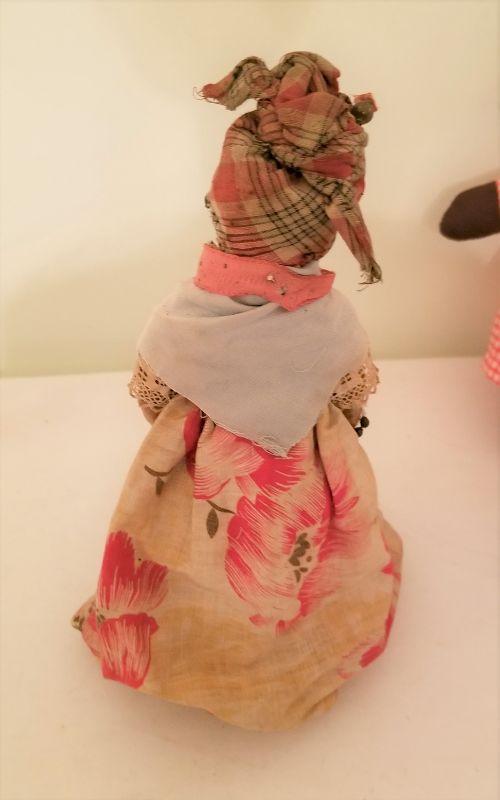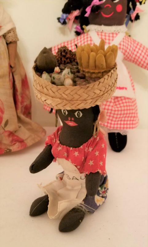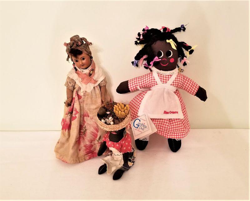 Three vintage dolls depicting people of color - one is a Creole lady (china head) with original clothing - 10" tall - cracked wrist - she is scarce. We also have a cloth vendor doll from Nassau - she can sit or stand (9" long) and a Gambina doll "Ninkie" - like new with tags - tag dated 1979 (11" tall). These used to be a popular New Orleans souvenir, but now.......let's just say they are hard to find.