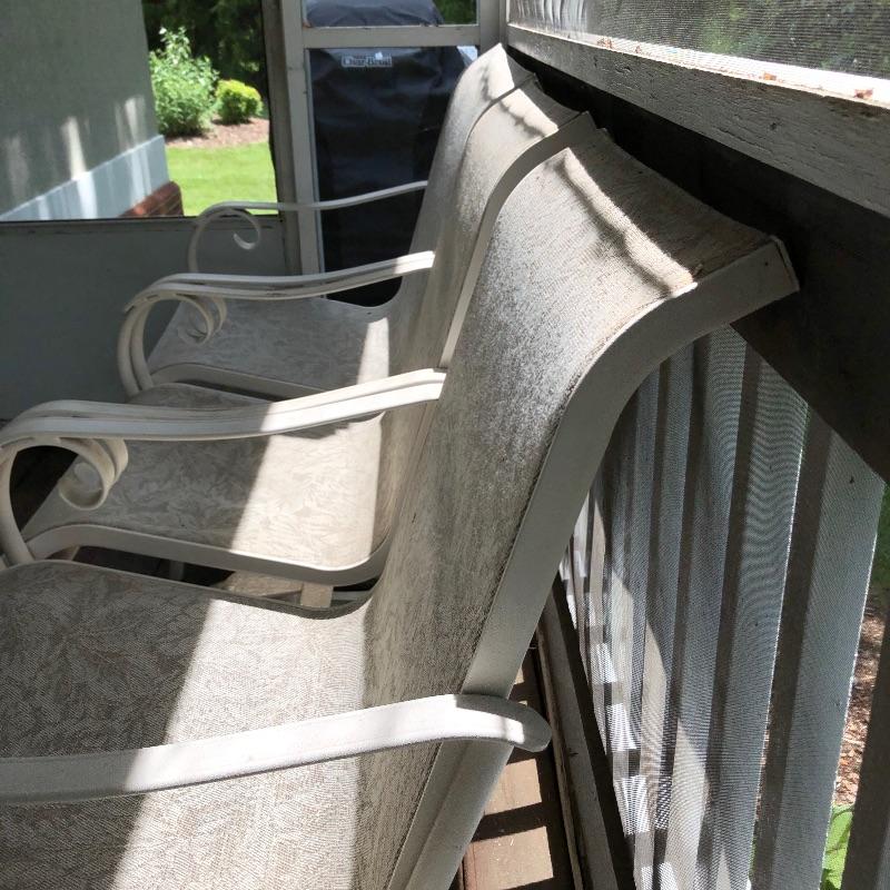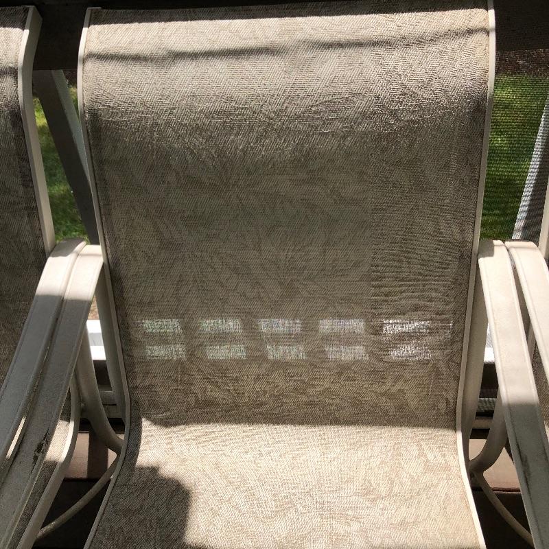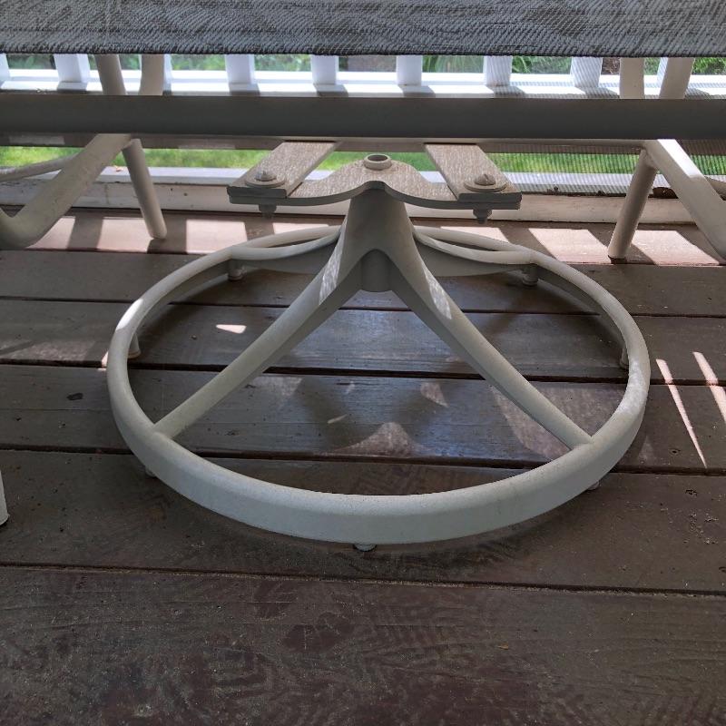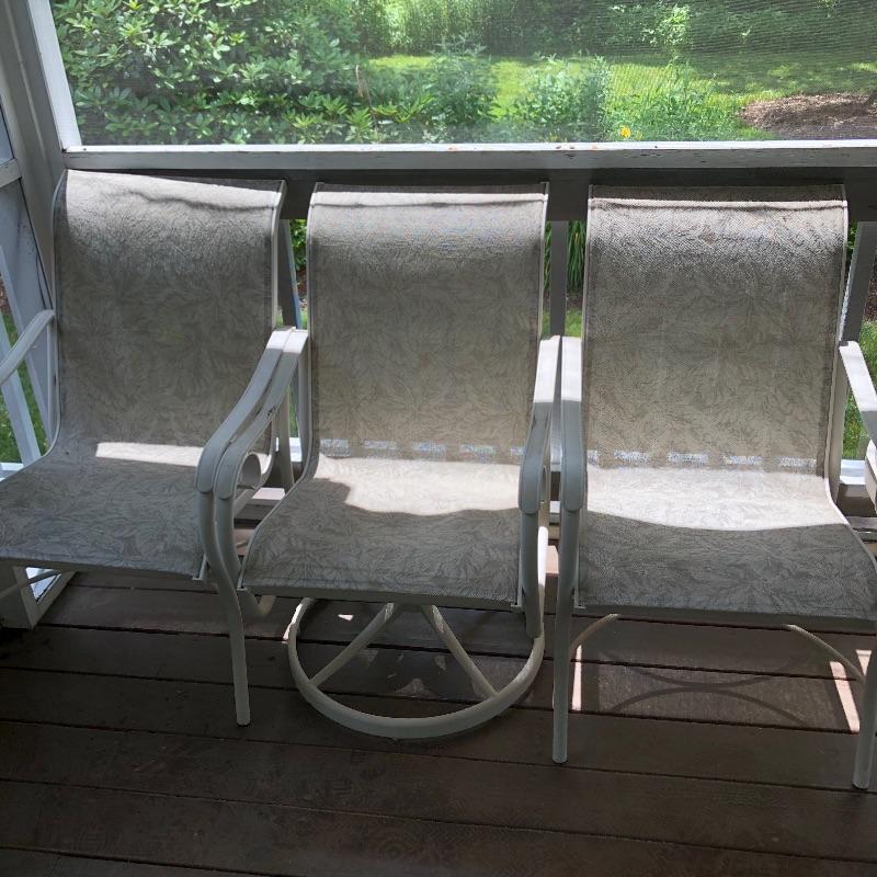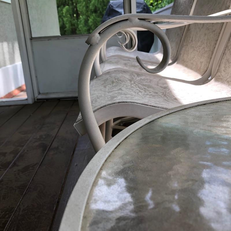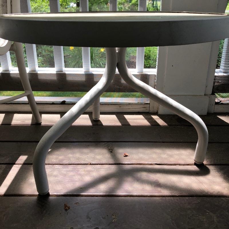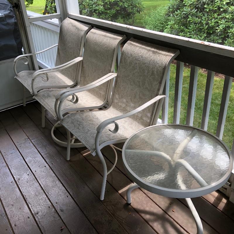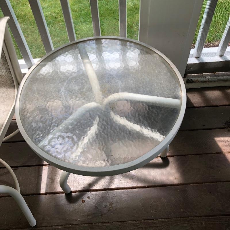 These matching outdoor furnishings go together very nicely and would be a great addition to an outdoor patio. Two of the chairs (22.5” x 18.5” x 34”) have regular legs, and then one of them has a rotating bottom. The chairs have floral designs on them. The table (24” x 24.5” x 18”) is glass topped with metal base, and it has a mottled glass effect when the light hits it just right. Local pickup only.