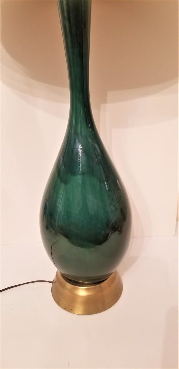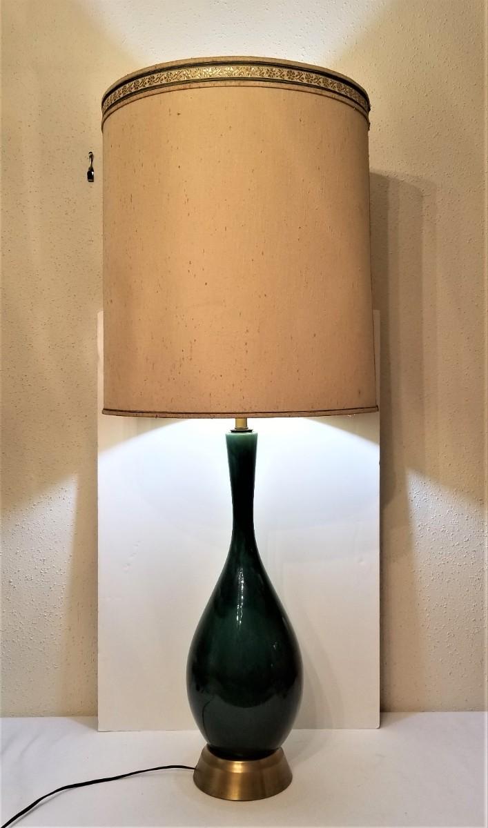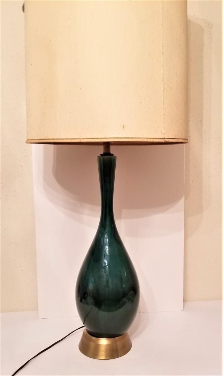 Cool Mid Century Modern table lamp - good working condition. no maker noted. Glazed pottery base (blue/green). w/shade. 40" tall.