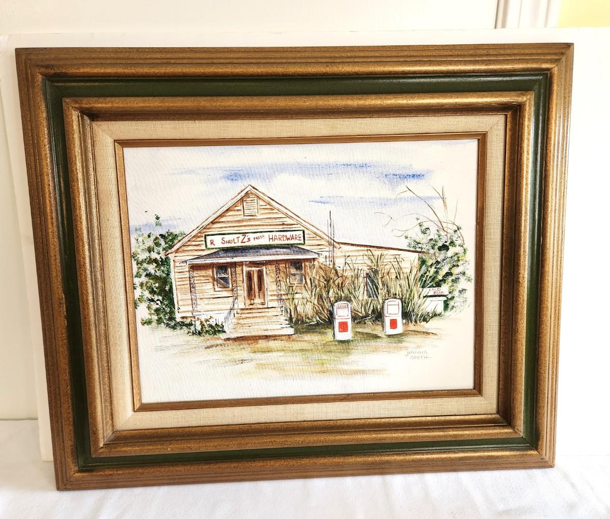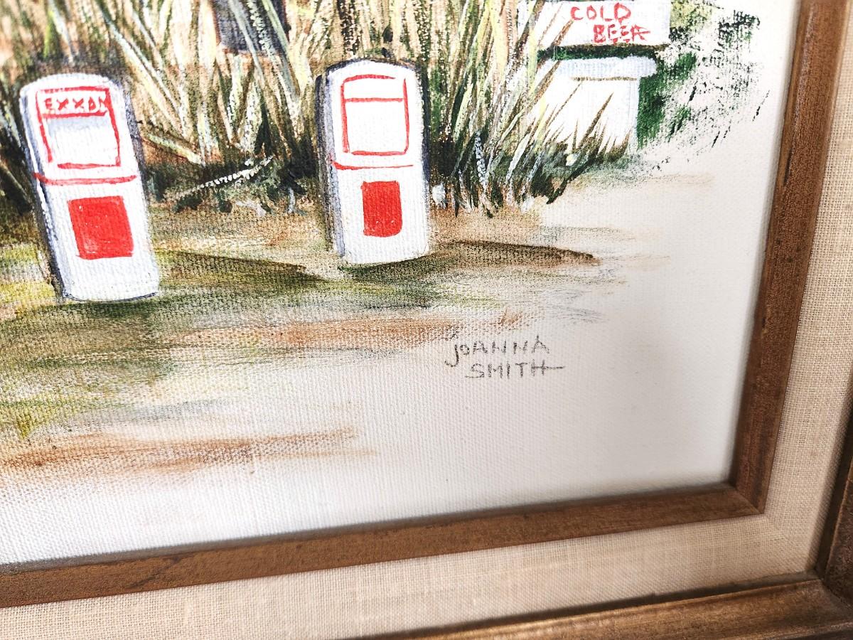 In the Primitive style - original painting - acrylic on canvas (framed) - "Bucktown" by Joanna Smith. 23" x 19.5". Good condition.