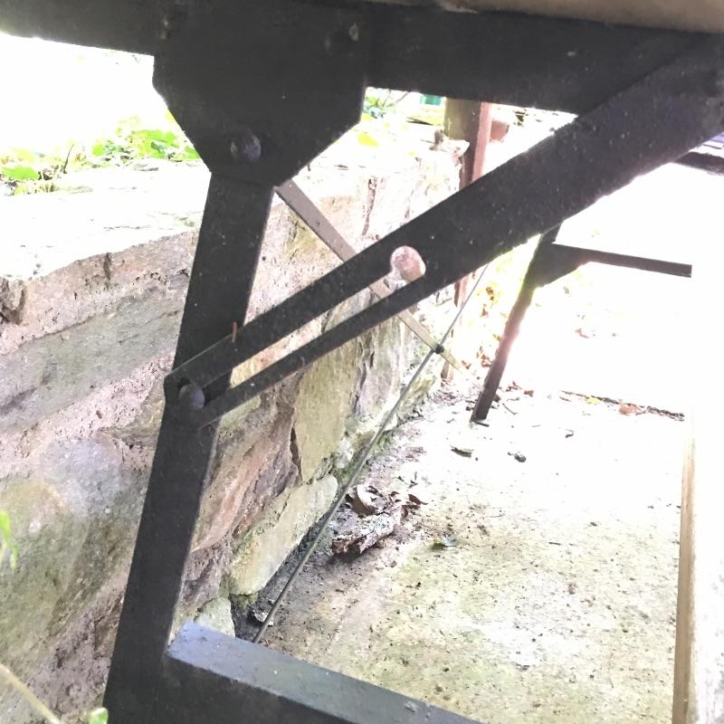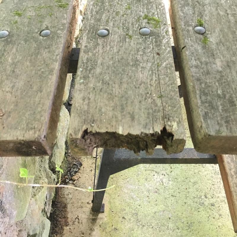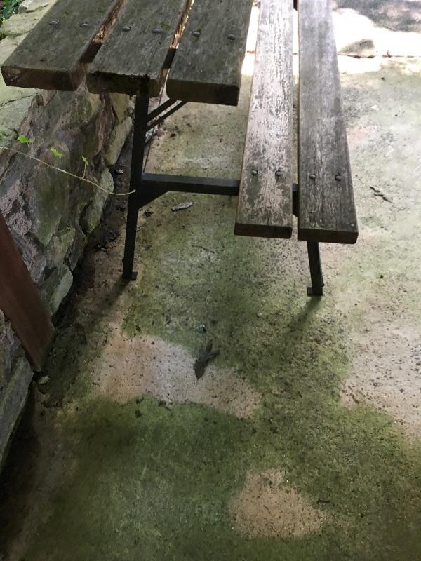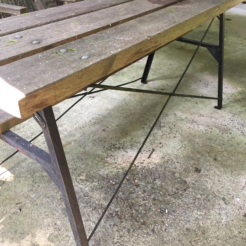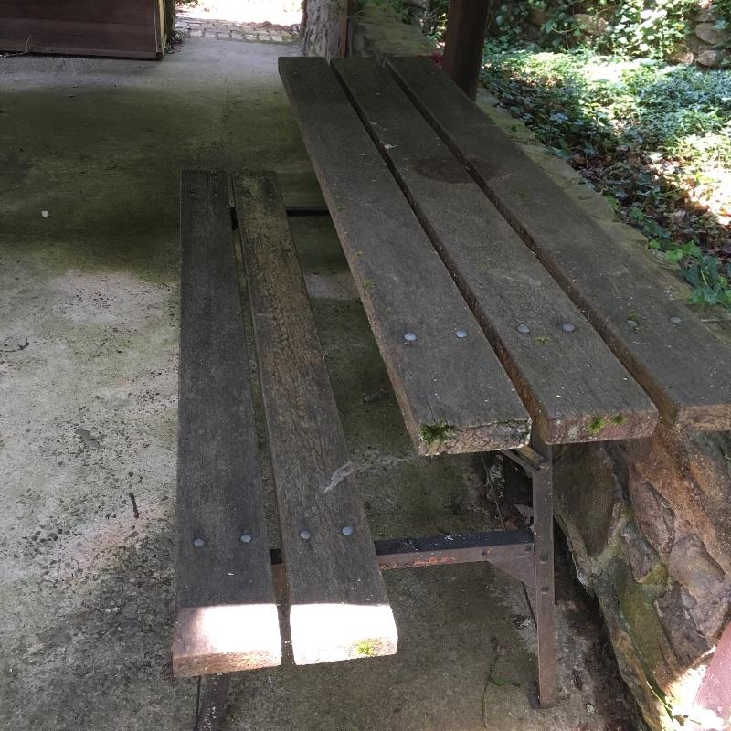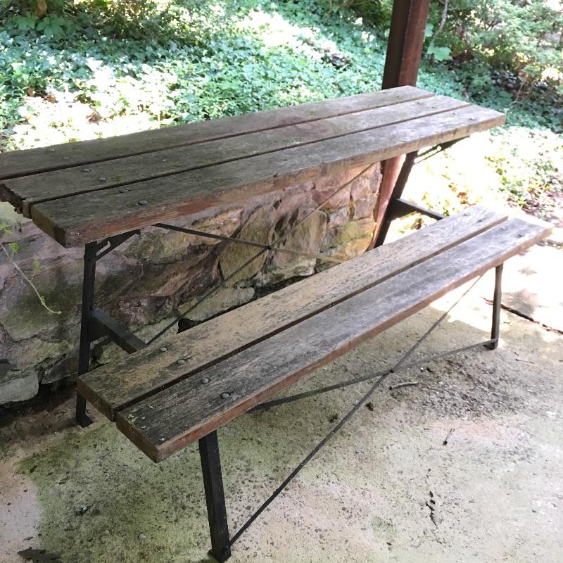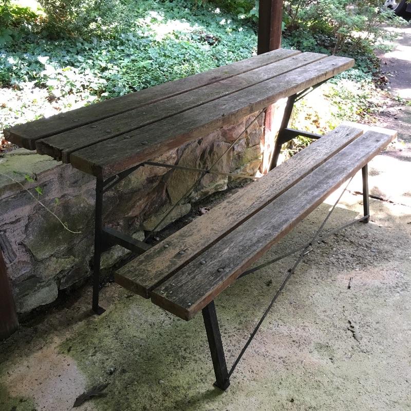 Half a picnic table that looks like it turns into a bench, but we cannot confirm as it is rusty and not moving. Table has rust on frame and a little wood degradation on two pieces but is still very solid. Table measures 30.5” x 72” x 33.5”.