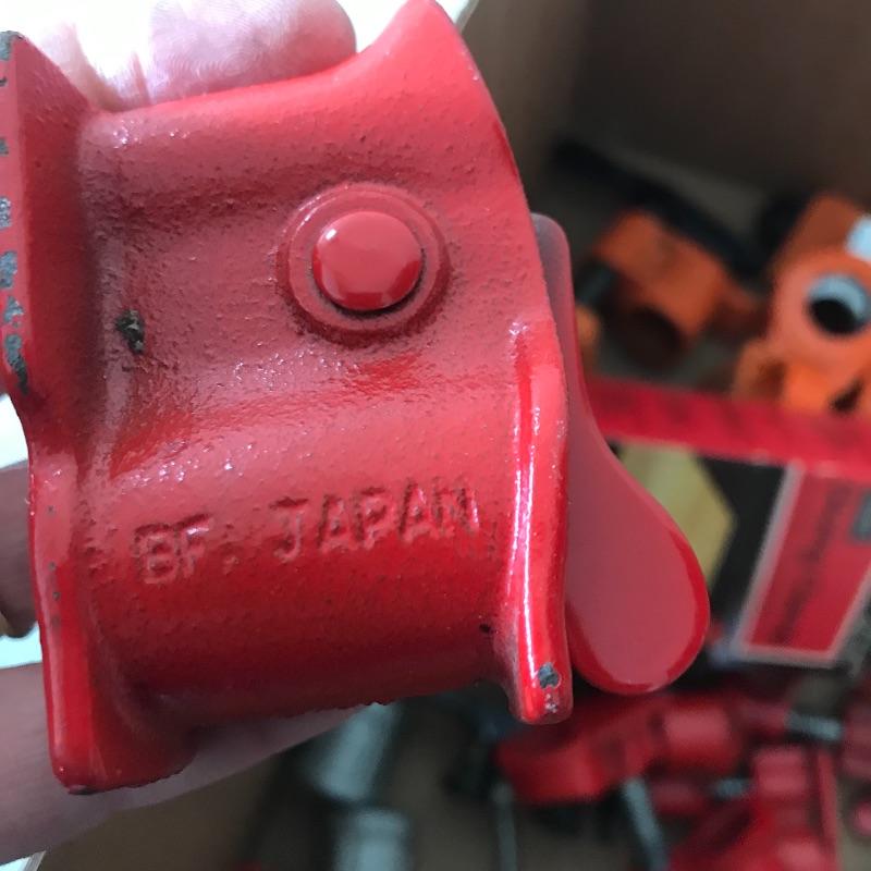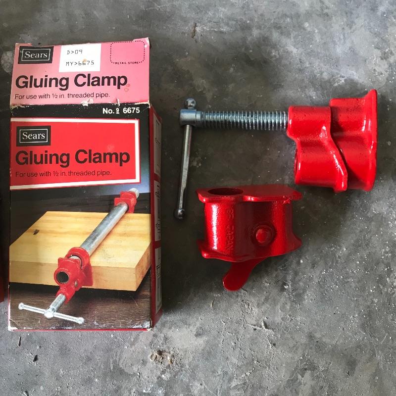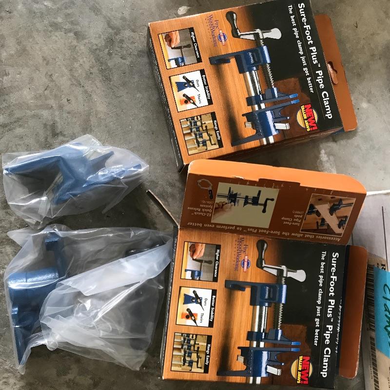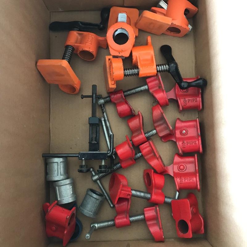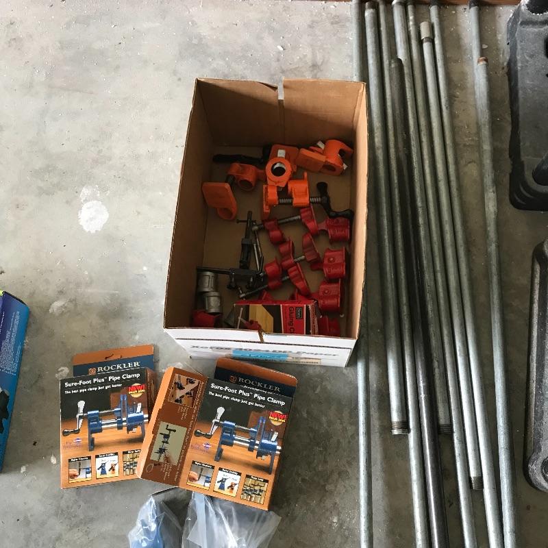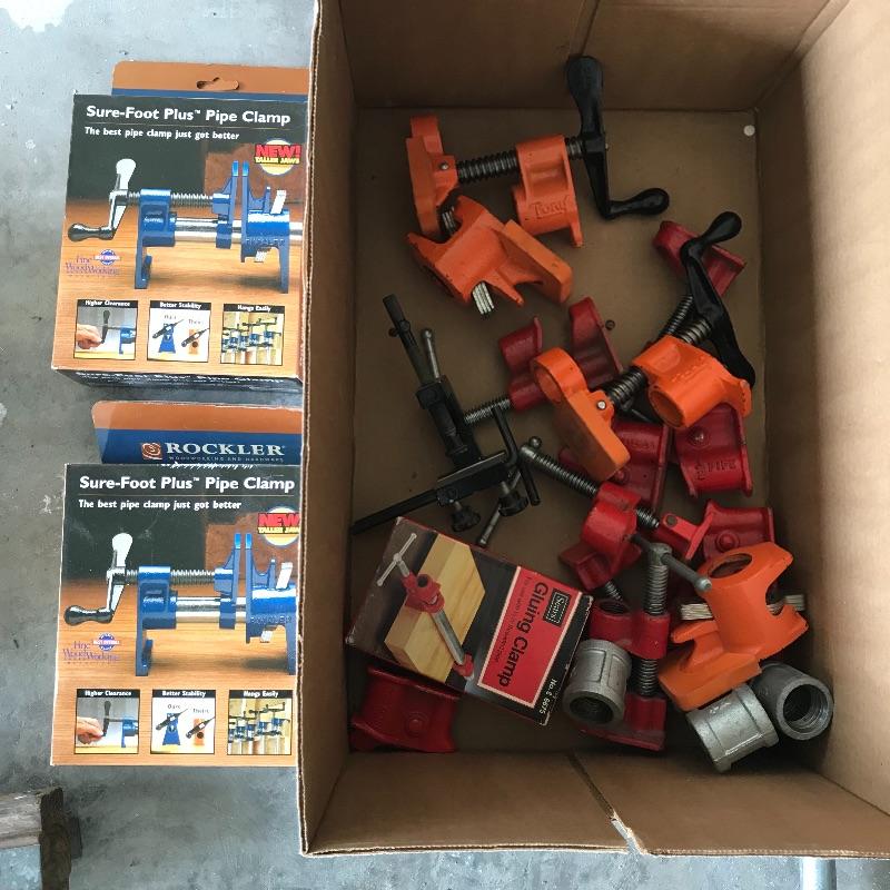 Two new in box Rockler Sure-Foot Plus Pipe Clamps, a Sears gluing Clamp with box. Two orange “Pony” clamps and five red Japanese clamps. Collection also includes 10 metal pipes, the length range for the pipes is between approximately 36” and 79”. No shipping.